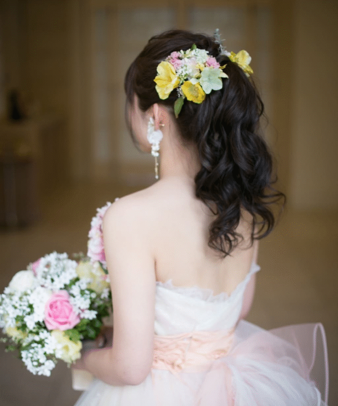 ②ゆるふわポニー×花飾りのヘアアレンジ