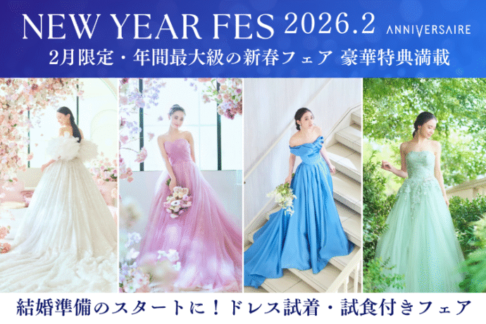 また、アニヴェルセル全国10店舗にてブライダルフェアを開催中です。会場見学や模擬挙式、豪華試食会など、すべて無料で体験できます。もちろん、似合う髪型をイメージしながらドレス試着も可能!ぜひお気軽にお越しください。