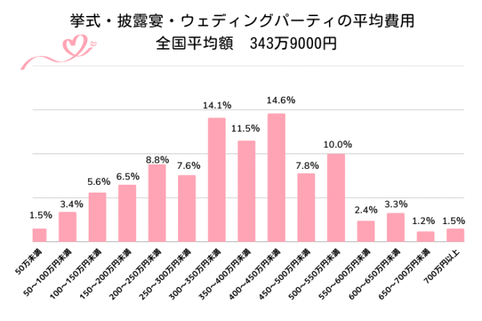 結婚式を挙げるためには、ある程度の費用がかかります。『ゼクシィ結婚トレンド調査2024』によると、挙式、披露宴・ウェディングパーティにかかる費用の全国平均額は343万9000円です。