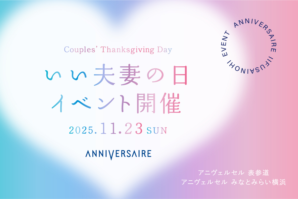 ゲストハウスウェディングを中心に、記念日プロデュース事業を展開するアニヴェルセル株式会社は、2025年11月23日(日・祝)の「いい夫妻の日」に、ご夫妻が感謝を伝え合い、“ありがとう”で絆を深めるイベント『Couples’ Thanksgiving Day』をアニヴェルセル 表参道・アニヴェルセル みなとみらい横浜の2店舗で開催いたします。