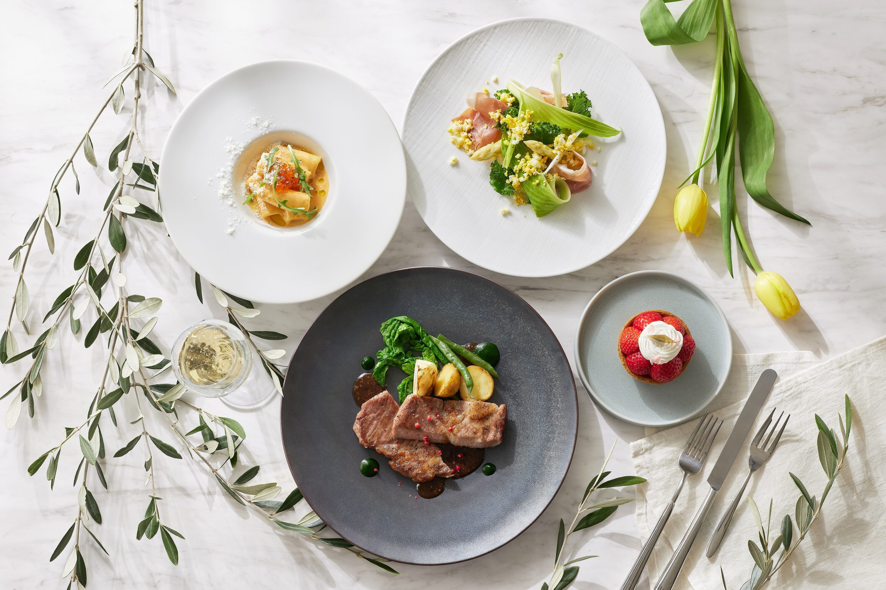 春野菜の力強さと繊細さを一皿ごとに表現した、至福のフルコースをご用意いたしました。「蛍烏賊とホワイトアスパラ」の前菜に始まり、続く二品目では「旬の野菜を心ゆくまで味わっていただきたい」というこだわりを凝縮。香ばしく焼き上げた多彩な春野菜に、新玉ねぎのスープを注ぎ、野菜本来の甘みと香りをご堪能いただけます。魚料理は、皮目はパリッと中はふっくら焼き上げた「真鯛のポワレ」。メインには、低温調理で旨みを凝縮させた「牛ロースのロティ」を新じゃがのローストとともに。一皿ごとに素材の個 性を引き立て、春の美味しさを余すことなく堪能できる特別な食体験。大切な方と過ごす記念日など、人生の節目を彩る「祝福の場」にふさわしい、心満たされるひとときをお届けします。