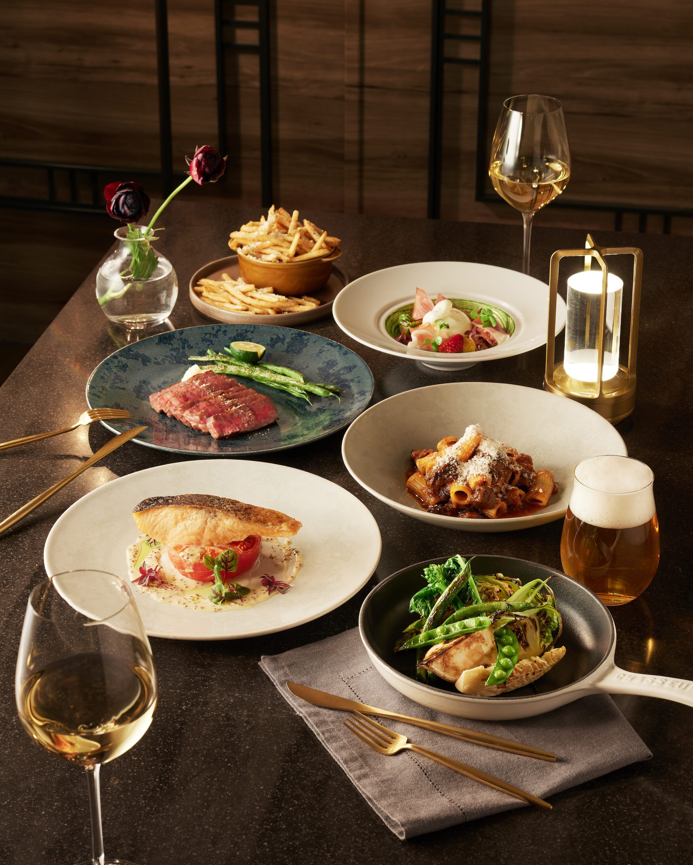 ディナータイムでは、大切な人とテーブルを囲むシェアスタイルの一皿から、食のスタイルを問わず楽しめるメニューまで、夜のひとときを華や かに演出するラインナップをご用意いたしました。前菜にはガーデンに咲く花をイメージした「苺とブラータチーズ」や、外はカリッと・中はふわふわの食感にこだわった自家製フォカッチャを添えた「スパイス香るかぼちゃとクリームチーズ 」など、お酒を片手に会話が弾むメニューを拡充。 さらに、素材本来の旨みを引き出した「タスマニアサーモンのムニエル」 をはじめ、ベジタリアンの方にもおすすめの「季節の温野菜ヴァリエ」や 「丸ごとカブのロースト 大豆ミートのチリコンカン」、削りたてのチーズ をたっぷりとあしらった「国産牛のボロネーゼ」など、アニヴェルセルの感性が息づく多彩なスタイルが融合します。一新されたワインラインナップとともに、お食事に合わせて選ぶ愉しみも広がり、表参道の夜を忘れられないひとときへと変えていく、心満たされる食体験をお届けします。
