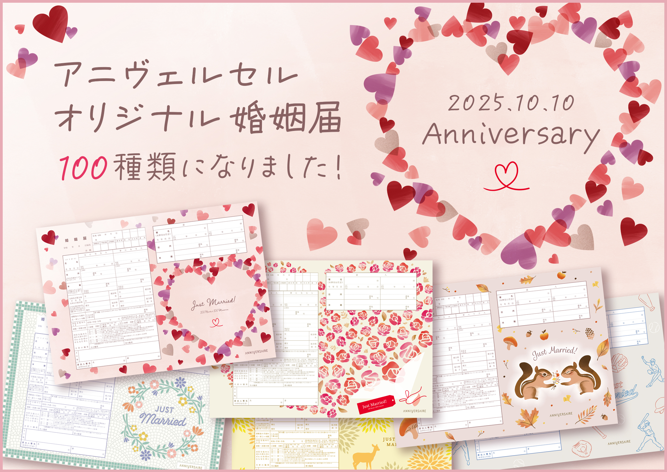ゲストハウスウェディングを中心に、記念日プロデュース事業を展開するアニヴェルセル株式会社は、好評の【アニヴェルセルオリジナル婚姻届】のデザインが100種に到達したことを記念し、本日10月10日から100にちなんだデザイン2種を含む新デザイン6種を提供いたします。
