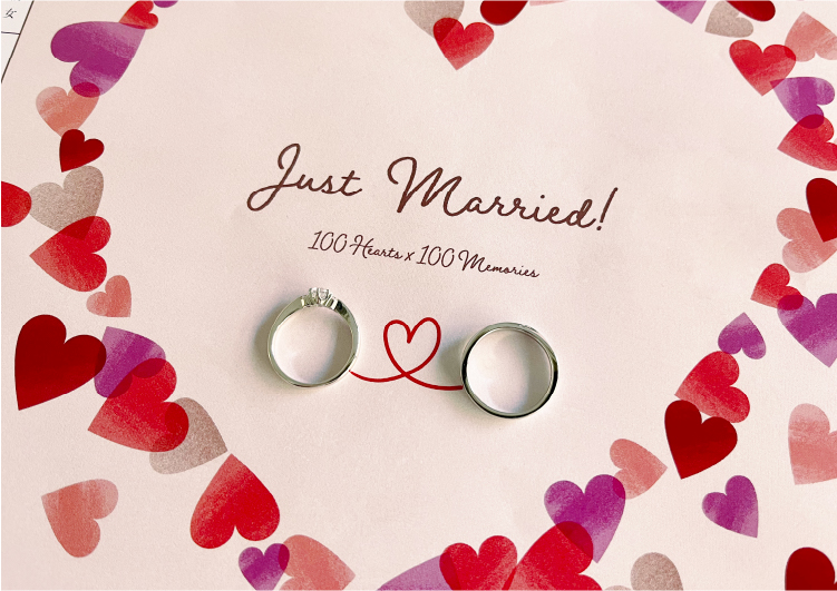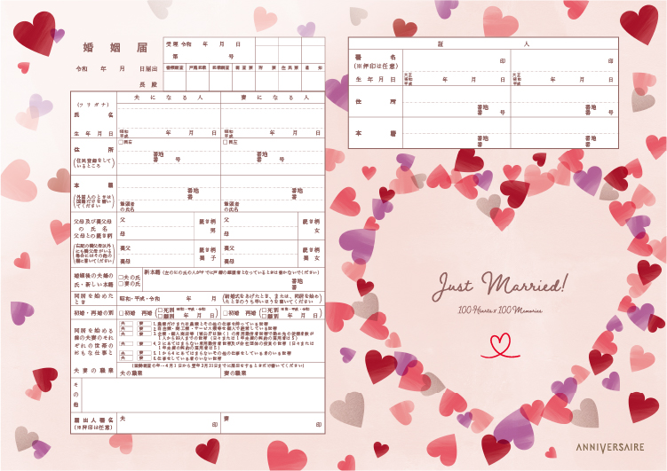 100個のハートで彩られた愛らしいデザインの婚姻届です。