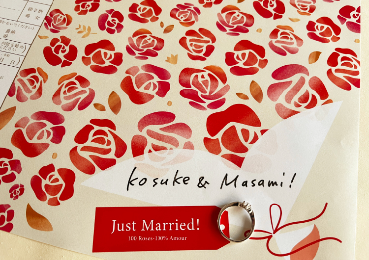 「100%の愛」という花言葉をもつ100本のバラをモチーフにした婚姻届です。