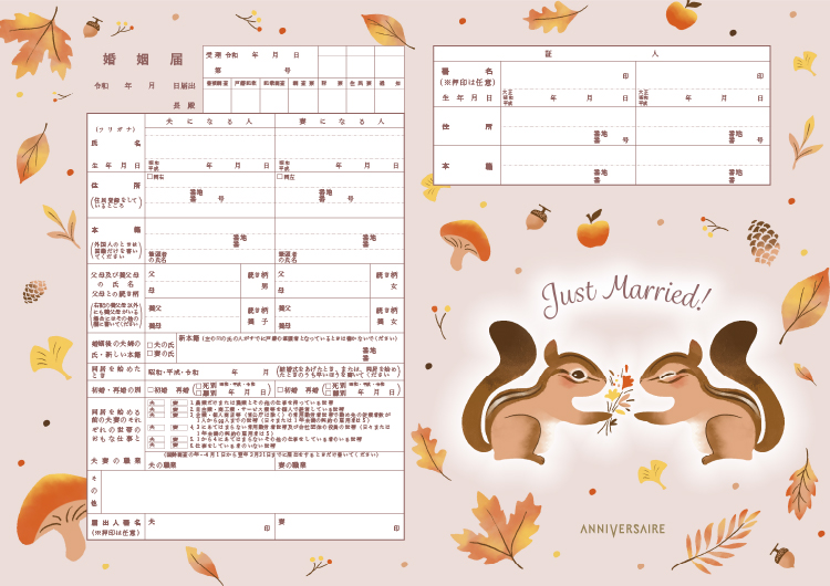 秋の豊かな実りを象徴する、イチョウの葉や木の実などをあしらった婚姻届です。プロポーズする可愛いらしいリスが、おふたりの新しい門出を祝福します。