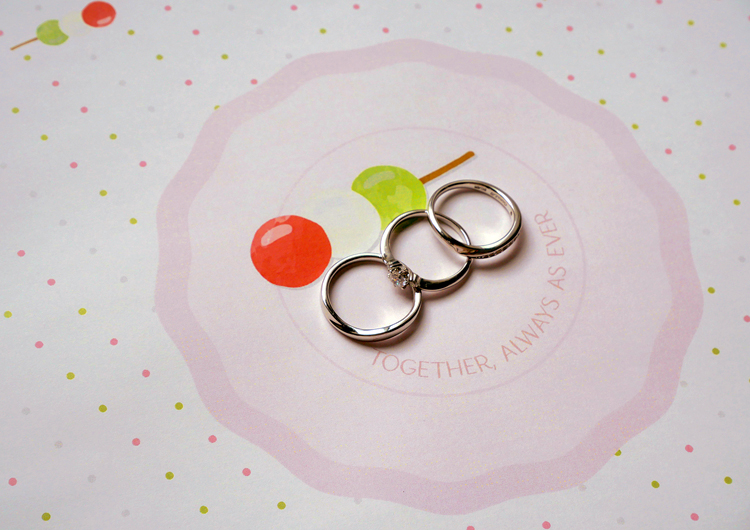 三色団子のピンクは「桜の春」、緑は「草木の夏」、白は「雪の冬」を象徴し、季節の移ろいや春の訪れを表現していると言われています。「花より団子」派という親しみやすさを兼ね備えたデザインで、自然体なおふたりにおすすめです。