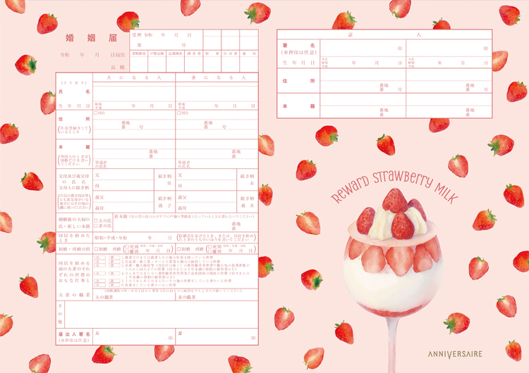 がんばった自分へのご褒美のような、贅沢で甘い「苺ミルク」をテーマにした婚姻届です。甘いものに目がないおふたりのために、心ときめくスイートな世界観を表現。新しい人生の一歩を、とろけるような幸福感とキュートなデザインでスタートするのはいかがでしょうか。