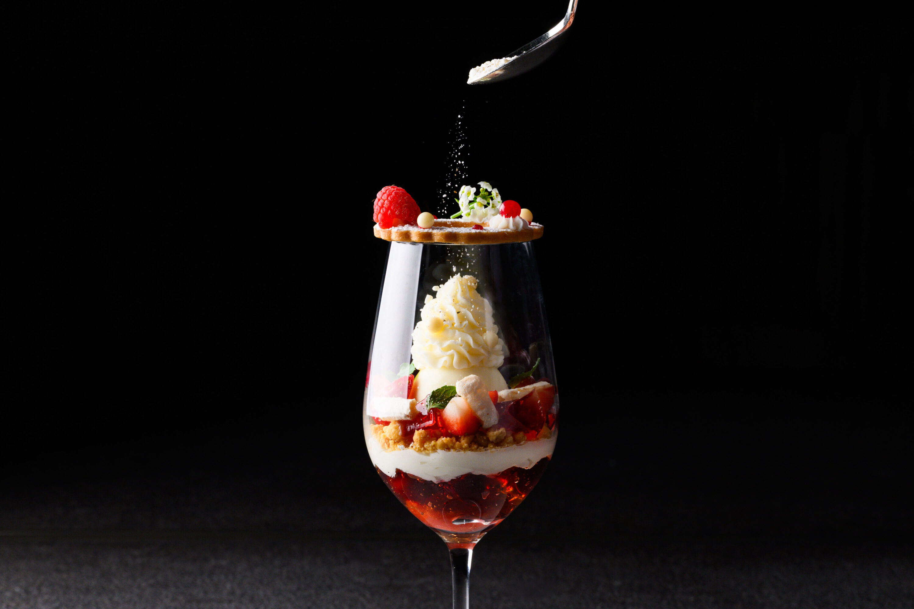 花嫁の純白のドレスをイメージして仕立てた、ローブ ド マリエシリーズのクリスマス限定パフェ。雪のように白く繊細なクリームを重ね、クリスマスシーズンにふさわしい華やかさと気品を表現しました。中にはマスカルポーネクリームや1688グラン・ブランのジュレ、グリオットチェリーを忍ばせ、ひと口ごとに変化する味わいをお楽しみいただけます。一年に一度だけ出会える、特別な“ホワイトクリスマス”の花嫁パフェです。