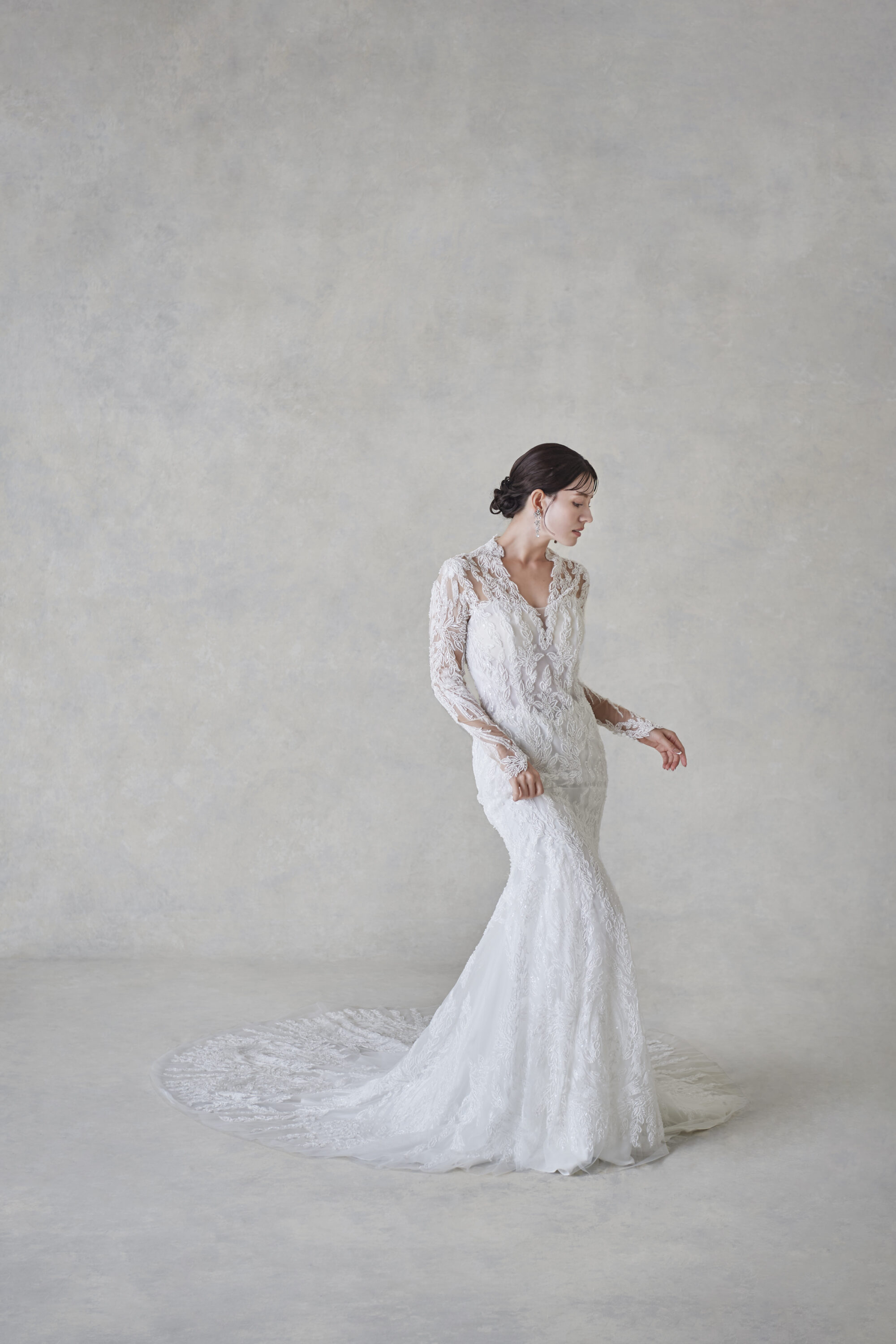 上品な肌の透け感がインポートライクな印象を与えながらも、日本人の花嫁が美しく着こなせるようこだわって設計したドレス。スカートの裏地にストレッチ素材を用いることで、身体のラインに沿いつつ着心地も良いデザインとなり、美しいマーメイドラインを実現しました。上質なサテンと繊細なラメチュールを組み合わせた2メートルものトレーンが、マーメイドラインでは表現しにくいボリューム感のあるバックスタイルを演出。花嫁の好みに合わせてトレーンは2種類から選ぶことが可能です。