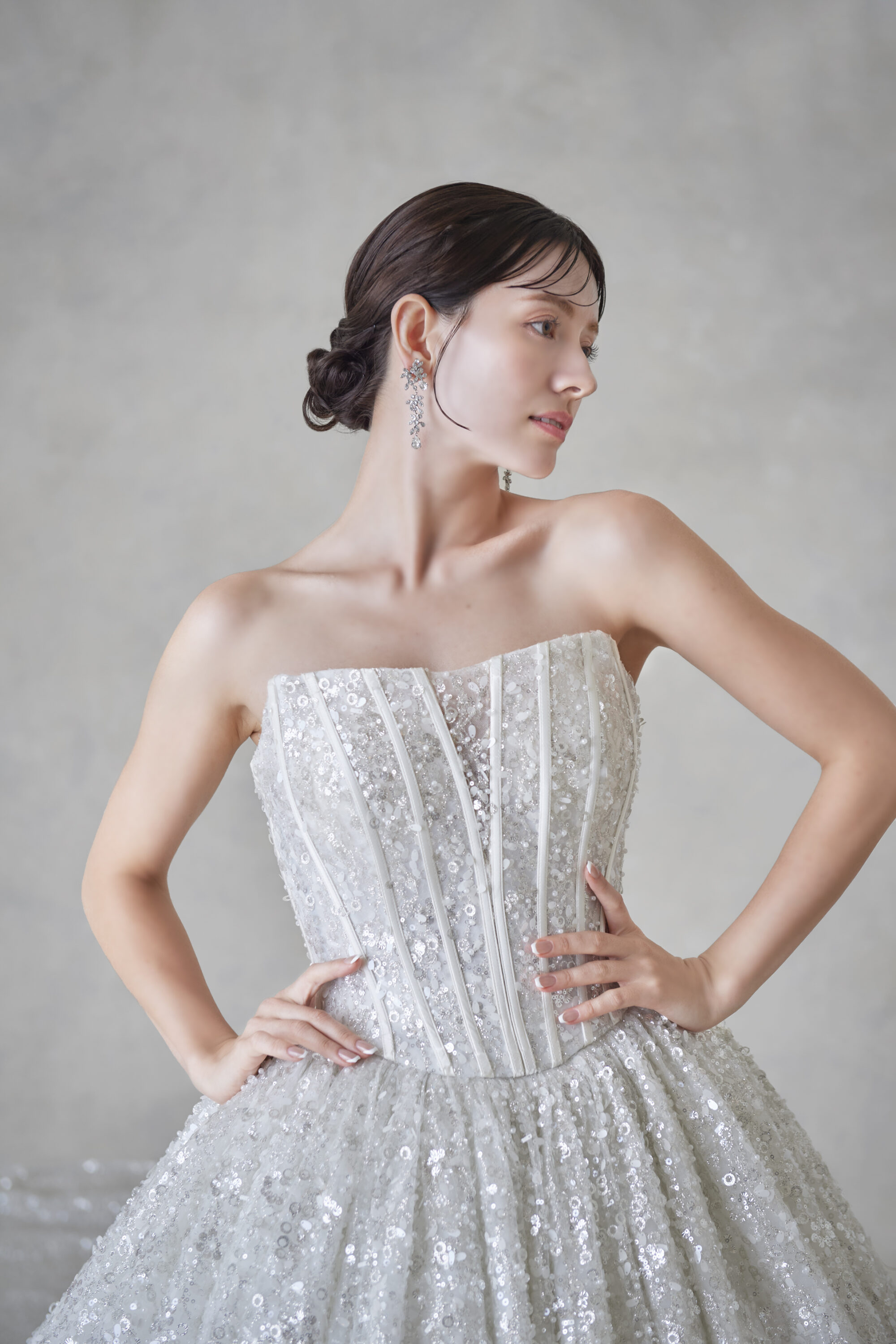 全身に大小さまざまな形のスパンコールを散りばめた生地を贅沢に用いたドレス。歩くたびにダイヤモンドのように煌めき、圧倒的な存在感を放つ一着です。ウエストラインを美しく際立たせる大胆なコルセットデザインのボディス(*)と取り外し可能なボリュームスリーブが、トレンドとエレガンスを両立つ。挙式ではクラシカルに、そして披露宴では華やかに、と花嫁の多様なスタイルを実現します。