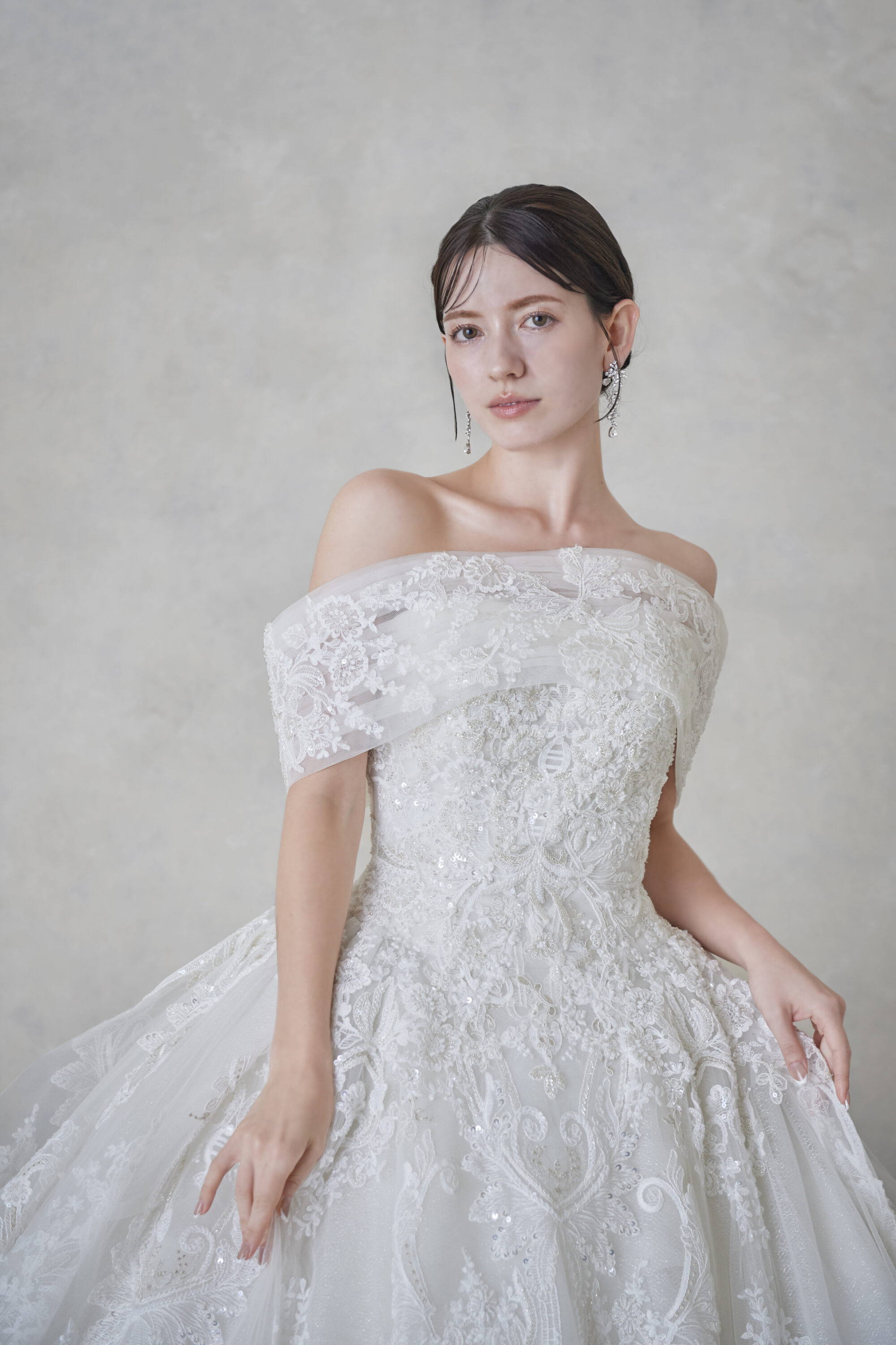 クラシカルな王道スタイルに、まるで絵画のようにレイアウトしたレースが、上品なオーラを纏わせるドレス。3メートルもの圧巻のロングトレーンが、アニヴェルセルのチャペルでひときわ存在感を放ちます。ボディスの刺繍レースには、職人が手作業でビーディングを施し、光を受けて繊細に煌めく印象的な輝きを実現。花嫁に人気の取り外し可能なロールカラースタイルのケープを合わせることで、格式高さもモダンな雰囲気も両方が叶います。