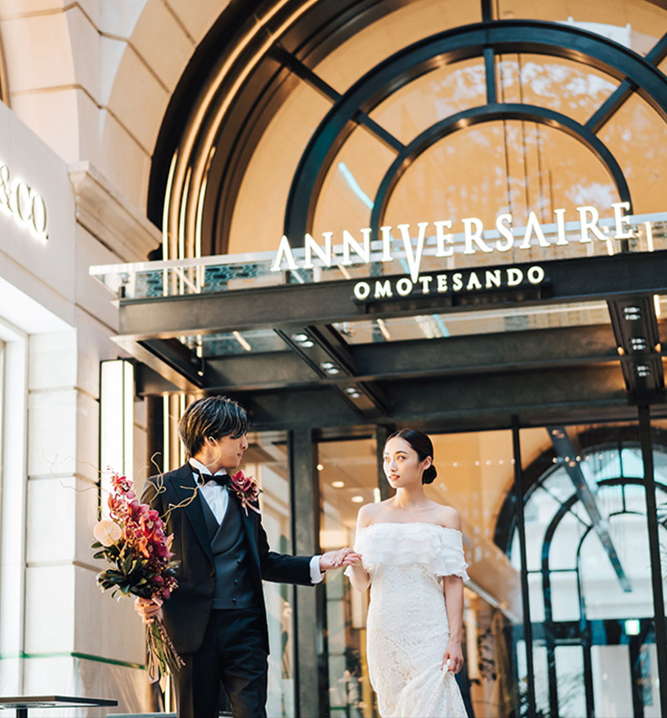 アニヴェルセル 表参道のチャペル・バンケット・外観での撮影が可能です。様々な撮影スポットでおふたりの自然な表情をたっぷり60カットお届けします。