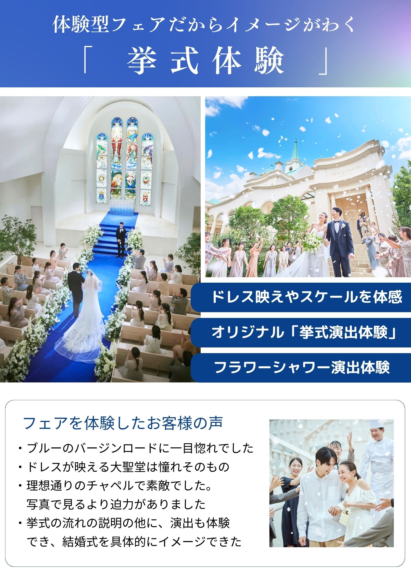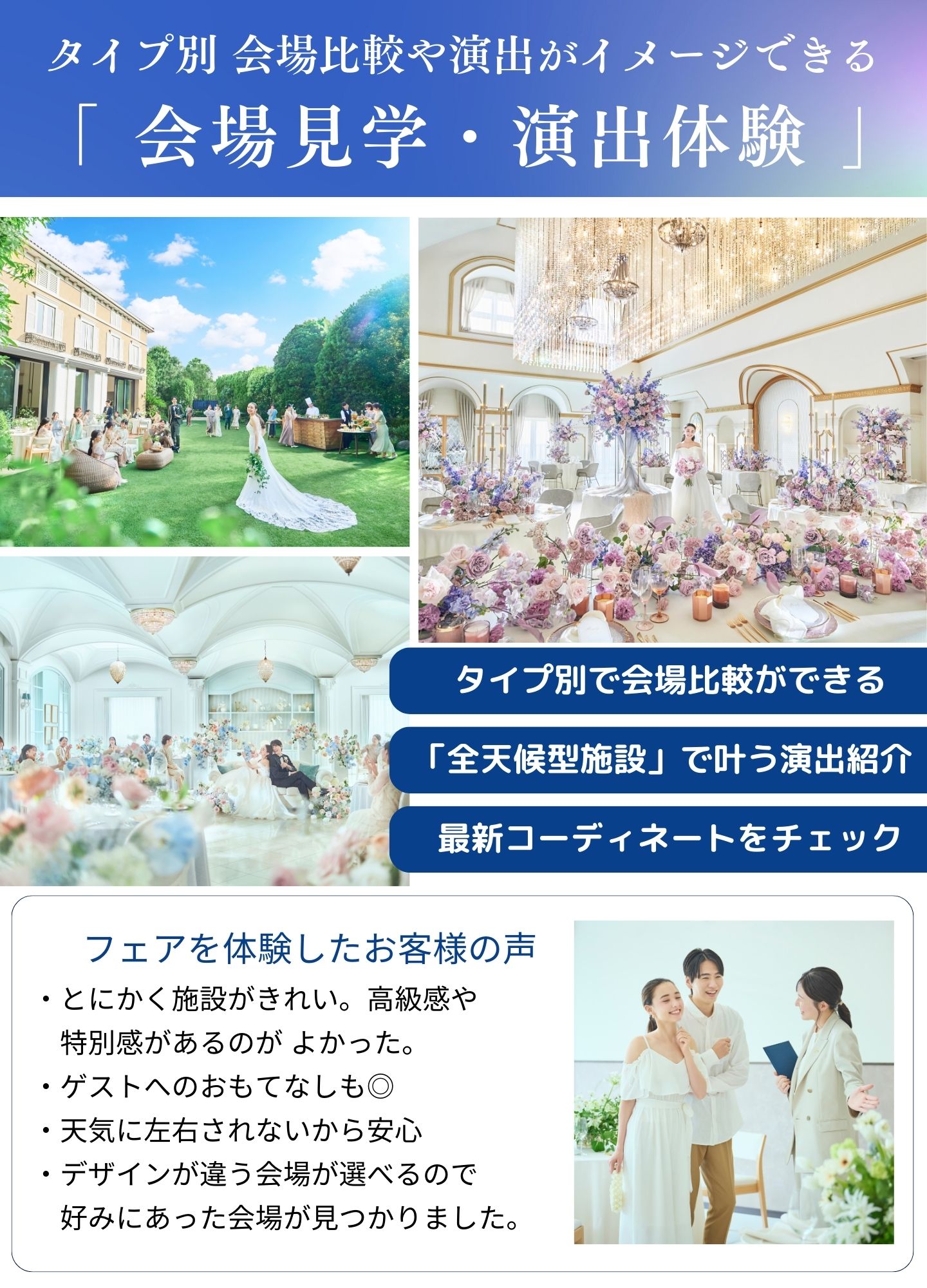 詳しい詳細や実際のチャペル・会場をご覧になることで、おふたりのご希望が明確になる方が多いので、迷われている場合はぜひフェアにご参加くださいませ。