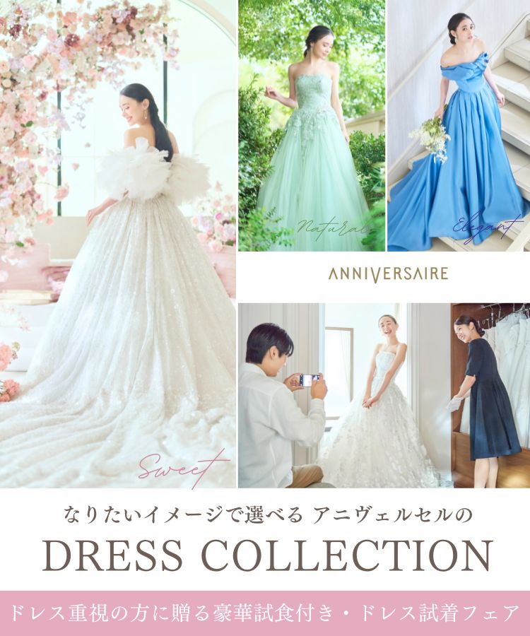 アニヴェルセルの館内にドレスショップを併設している店舗も多く、ブライダルフェアではドレスサロン見学やドレス展示、また組数限定でドレス試着体験なども開催しております。人気の限定イベントになりますので、ご希望の際はご予約時にお申し付けください。