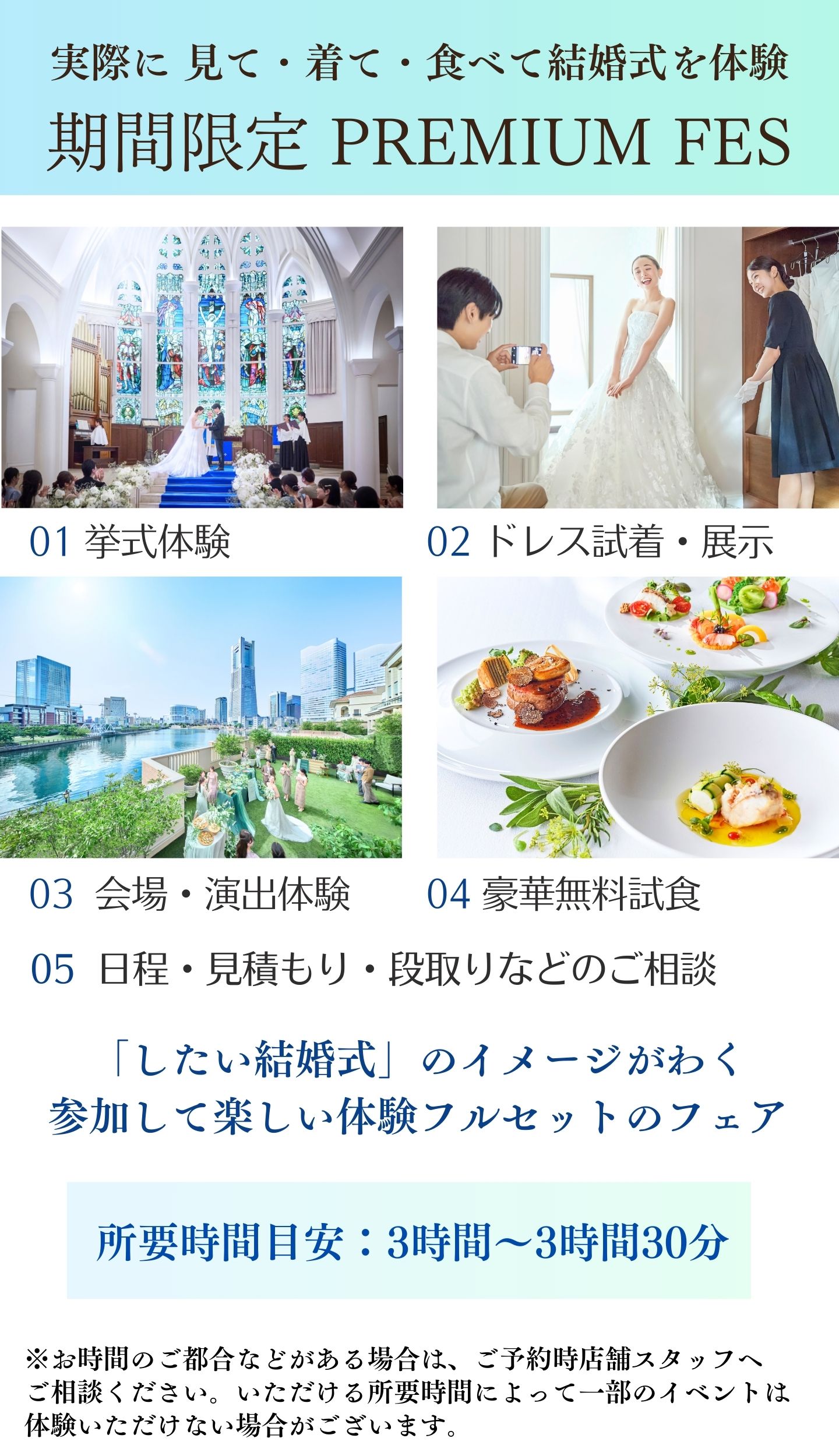 運命の一着をイメージしていただけるよう、組数限定で「ドレス試着体験」も開催中です。先着順の人気イベントとなりますので、ご希望の方はぜひお早めにご予約ください。