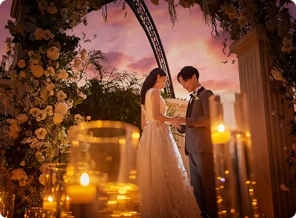 柔らかな⽊漏れ⽇がふたりを祝福し、