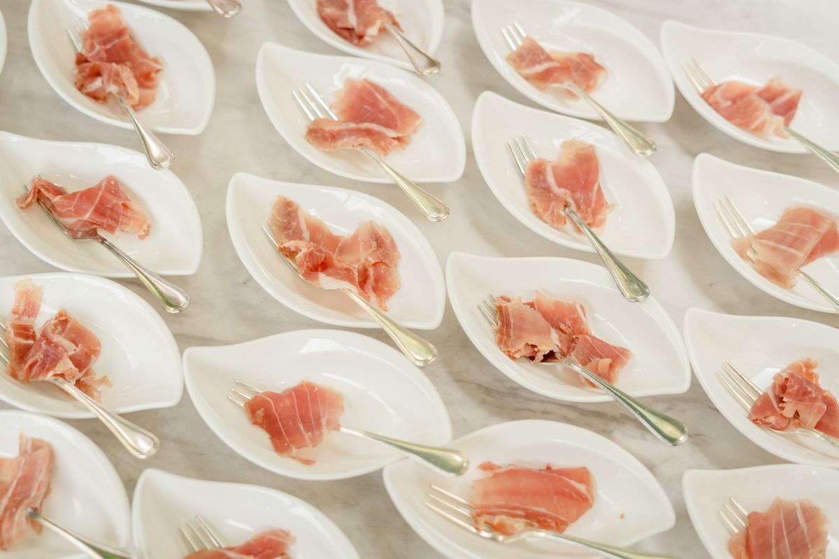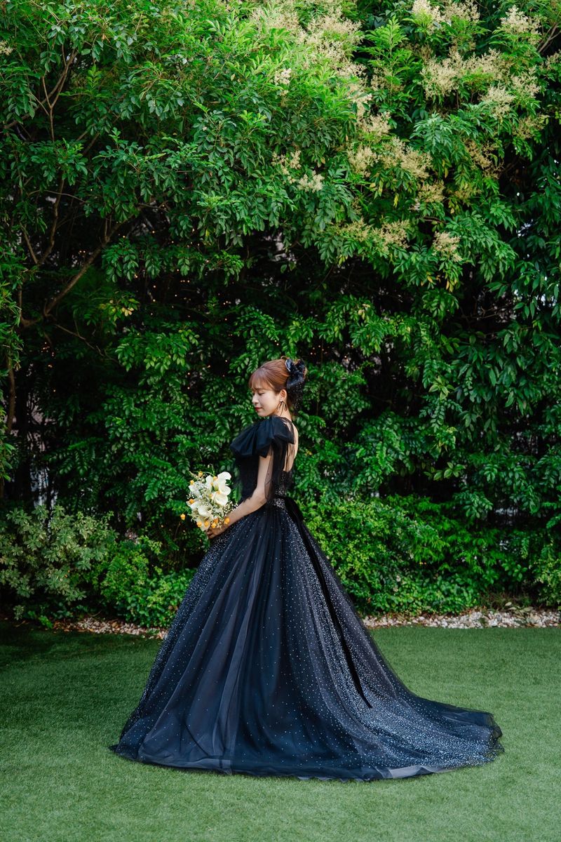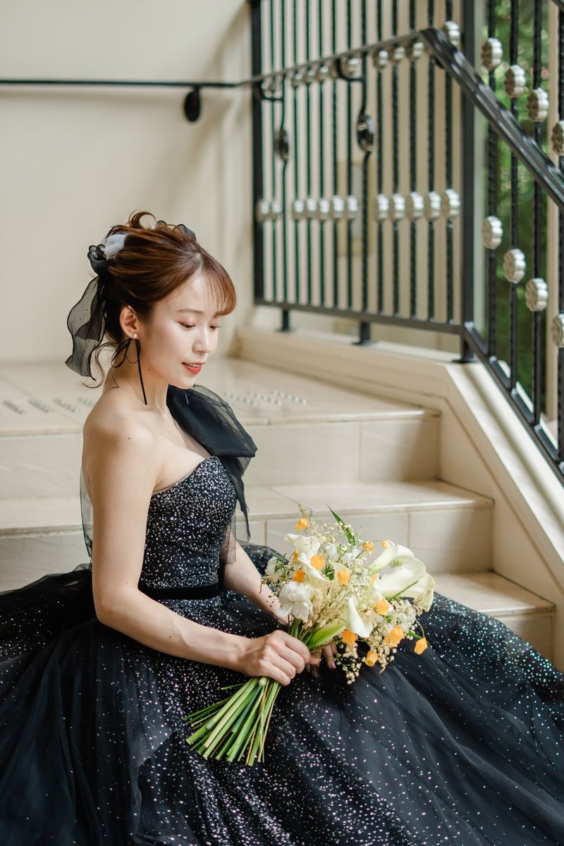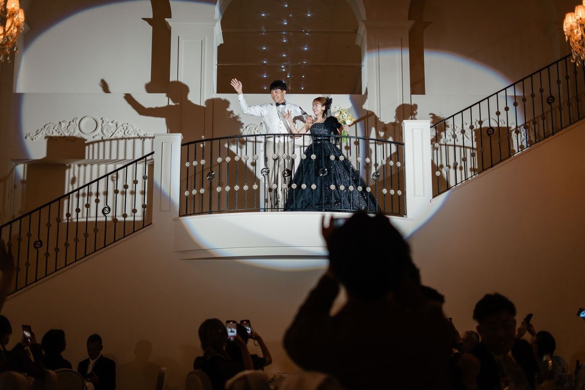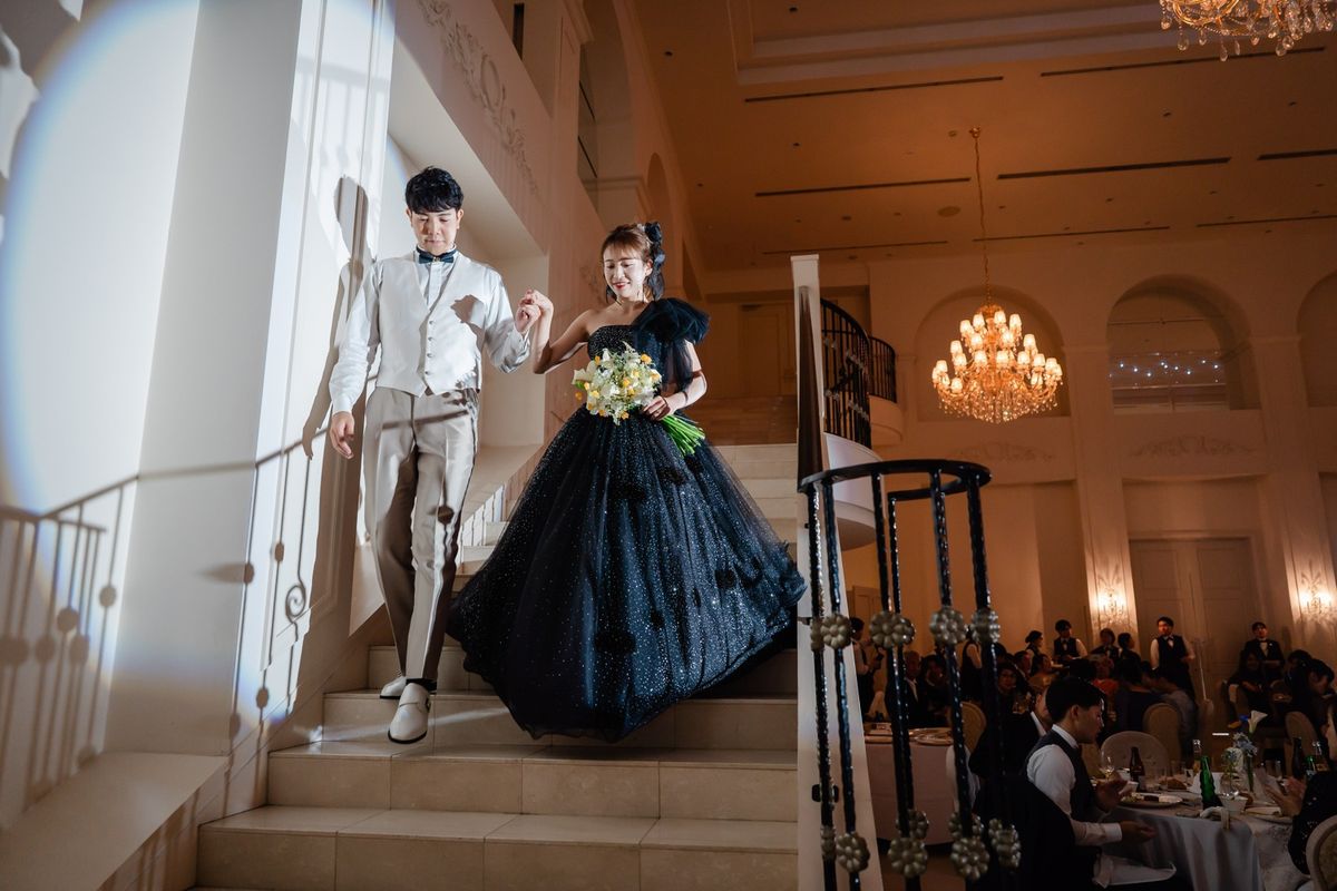 『シェルダジュール』は広く開放的で、ガーデンもあるため、屋内と屋外の両方を楽しめます。おふたりは、式場見学の際に会場の階段に一目惚れして、当式場に即決されたそう。 お料理にもこだわり、既に決めていたコースから、試食で気に入ったお魚料理を「ぜひゲストの皆様に食べてほしい」と、変更されています。 お色直しの再入場では、キラキラ輝くブラックのドレスで登場。皆様の注目を一身に浴びていらっしゃいました。
