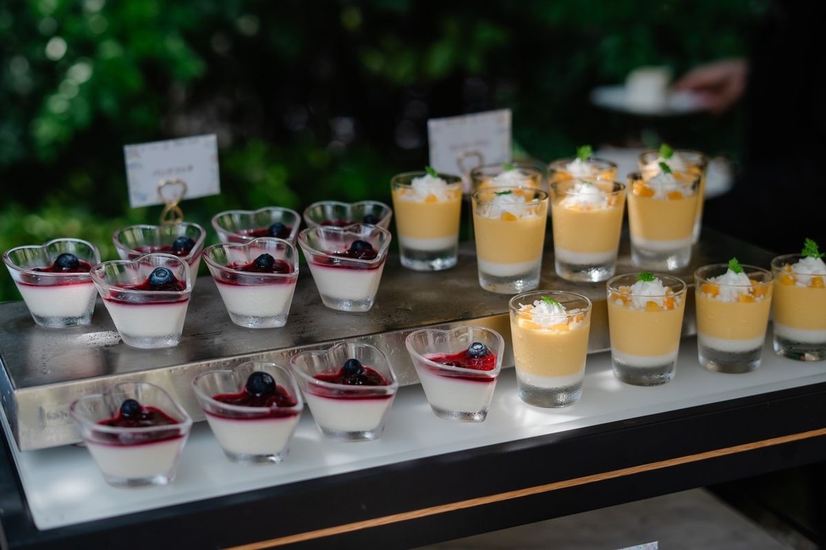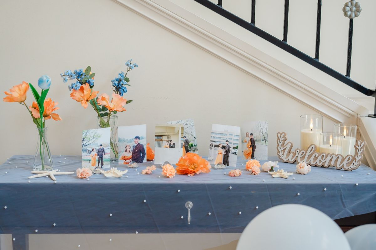 『みんなが気軽に楽しめる』ことを大切にしたおふたりは、空間作りや演出にもこだわりました。装花は、白とオレンジをメインに、ブルーのお花をちりばめた、バランスの良いコーディネートに。 披露パーティではクイズも取り入れて盛り上がり、デザートビュッフェは特に女性ゲストに大好評!さらに、お酒をたくさんご用意したので、プチギフトに酔い覚ましのお水をお渡しするなど、おふたりの気配りが光っていました。