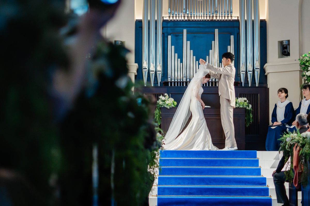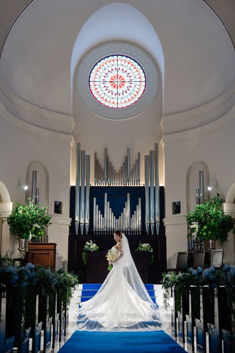 おふたりは、当式場チャペルの神秘的な雰囲気、他にはなかなかない青のバージンロードを気に入ってくださいました。 ご新婦は、テーマの“海”にも合うマーメイドラインのウェディングドレスを選び、ナチュラルなメイクに清楚なパールのアクセサリーを合わせ、ひと際美しく輝いていらっしゃいました。ゲスト皆様の、おふたりを見守る優しい笑顔が印象的です。