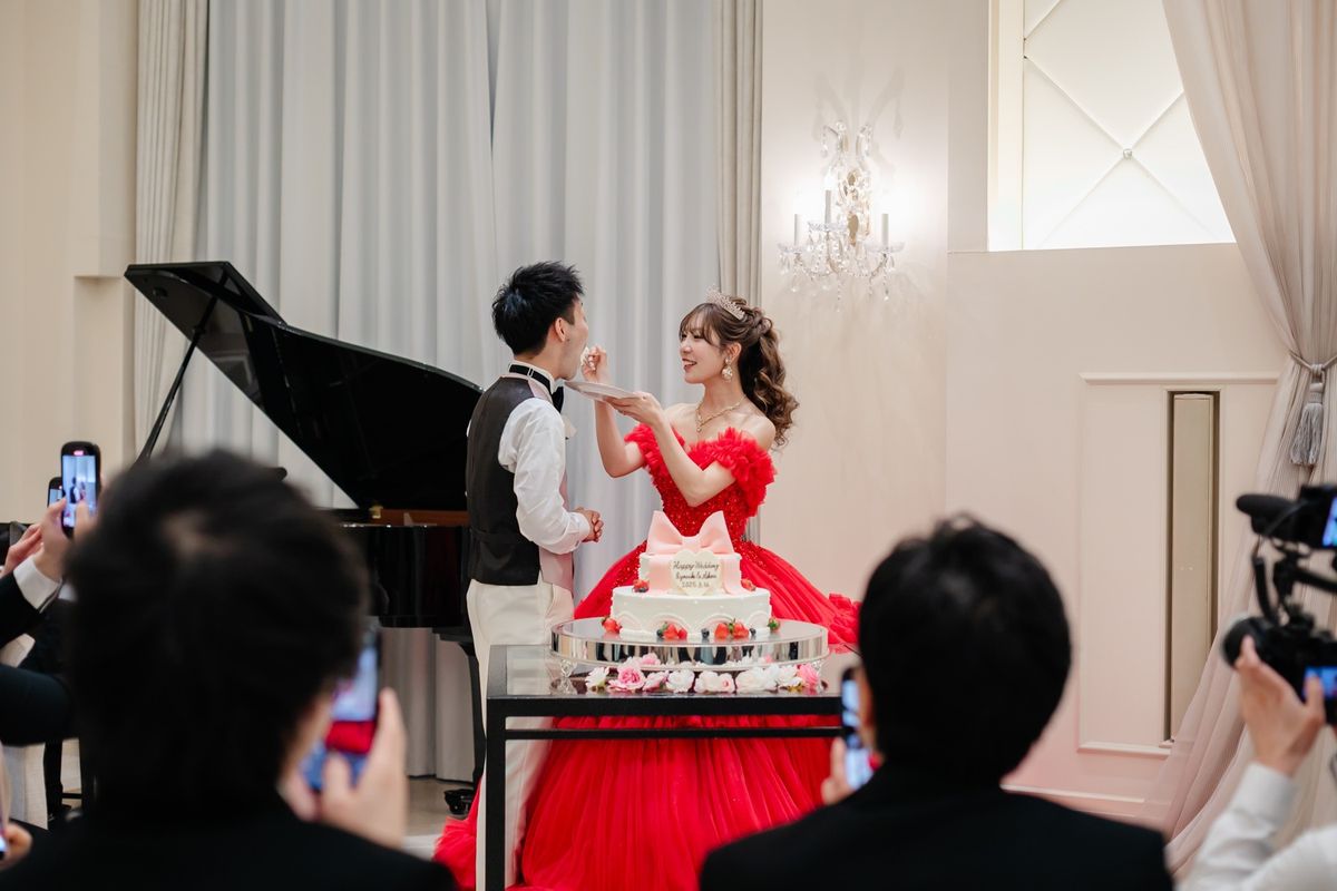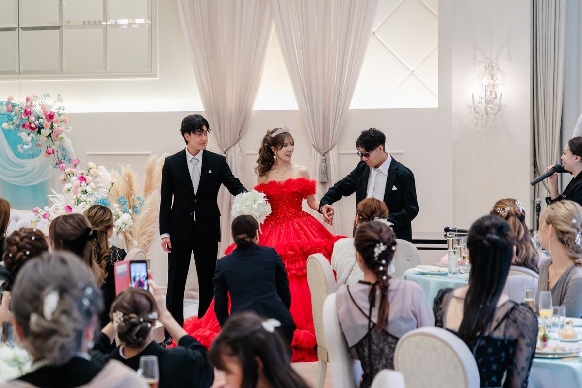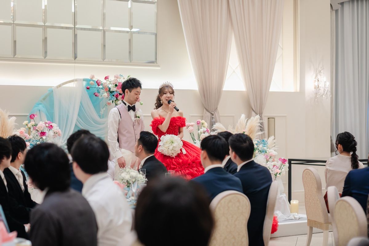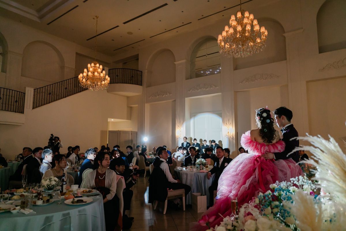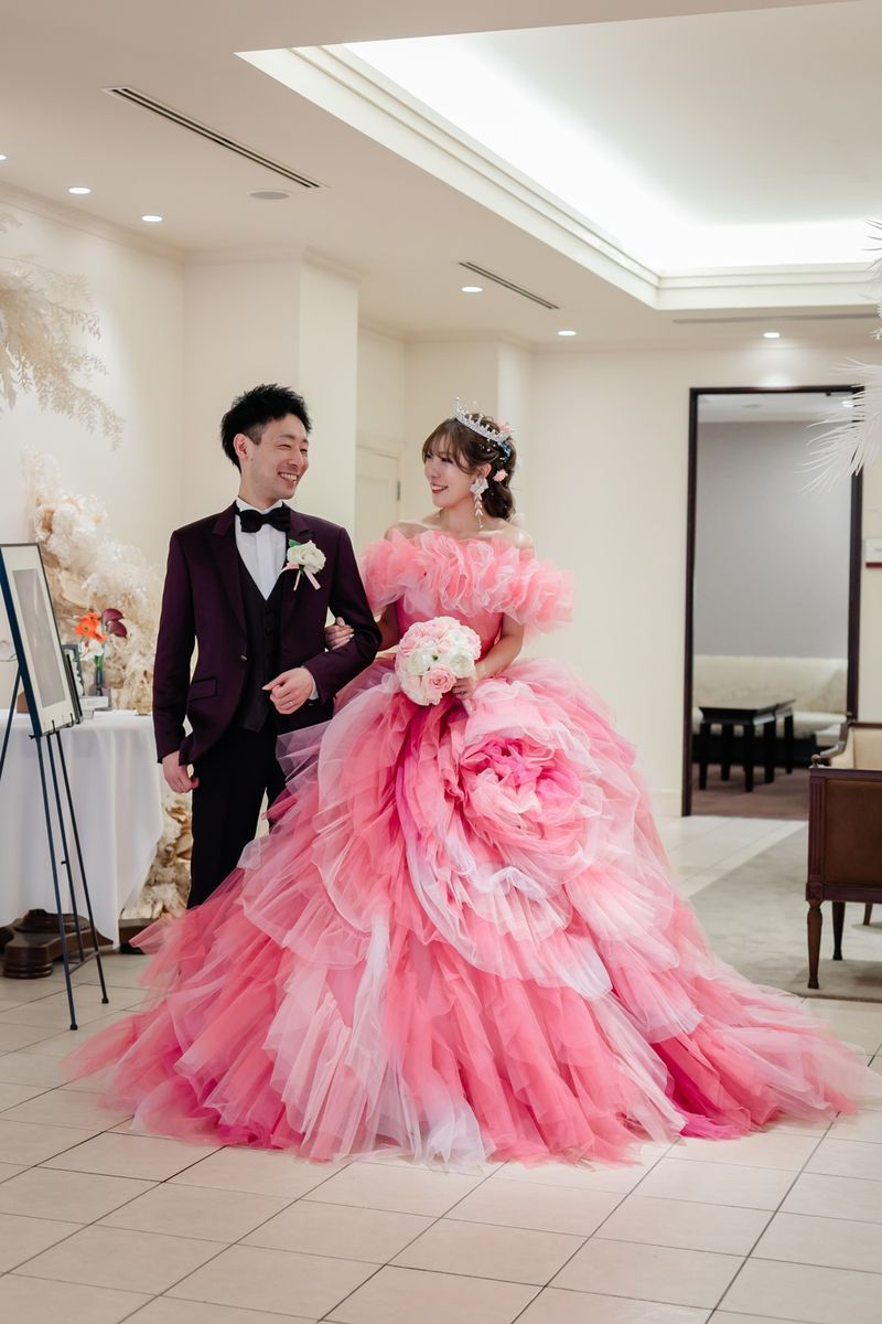 ご新婦はウェディングドレスのほかに2着のカラードレスを着用になり、会場をより華やかに演出されました。2着目のドレスは真っ赤なドレス・3着目は、ピンクのふんわりとしたボリューム感のあるドレスで、お花のようなデザインがとても魅力的でした。