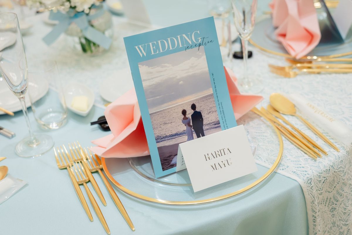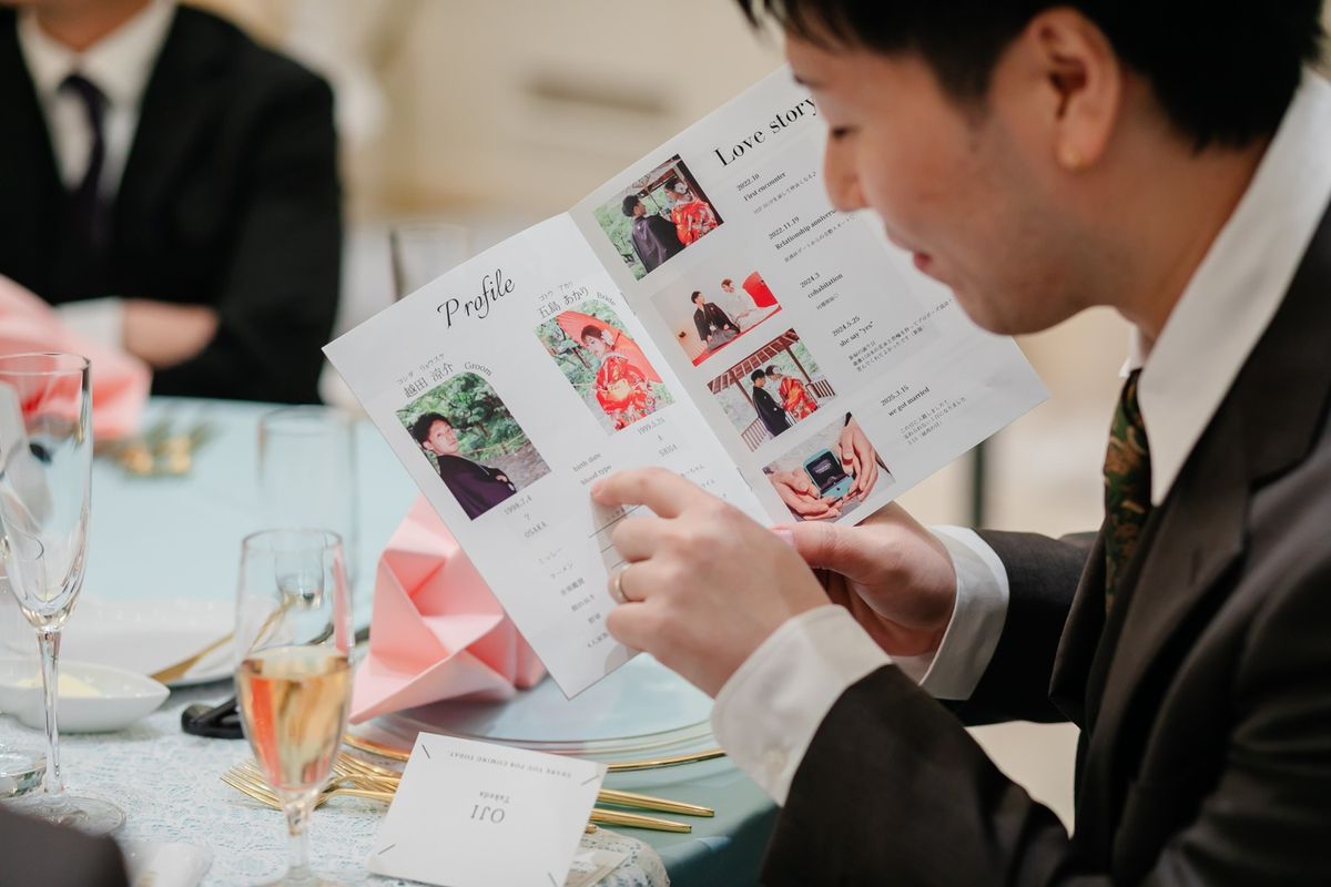 おふたりは事前の情報収集もしっかりした上で、ご自分たちのイメージをかためてから式場選びをされました。具体的な希望があることで、条件が揃う式場を決めやすかったそう。理想の空間作りのために、プロフィールブック・座席表・名札表などのペーパーアイテムは持ち込みでご用意され、テーブルコーディネートに統一感が出て素敵でした!