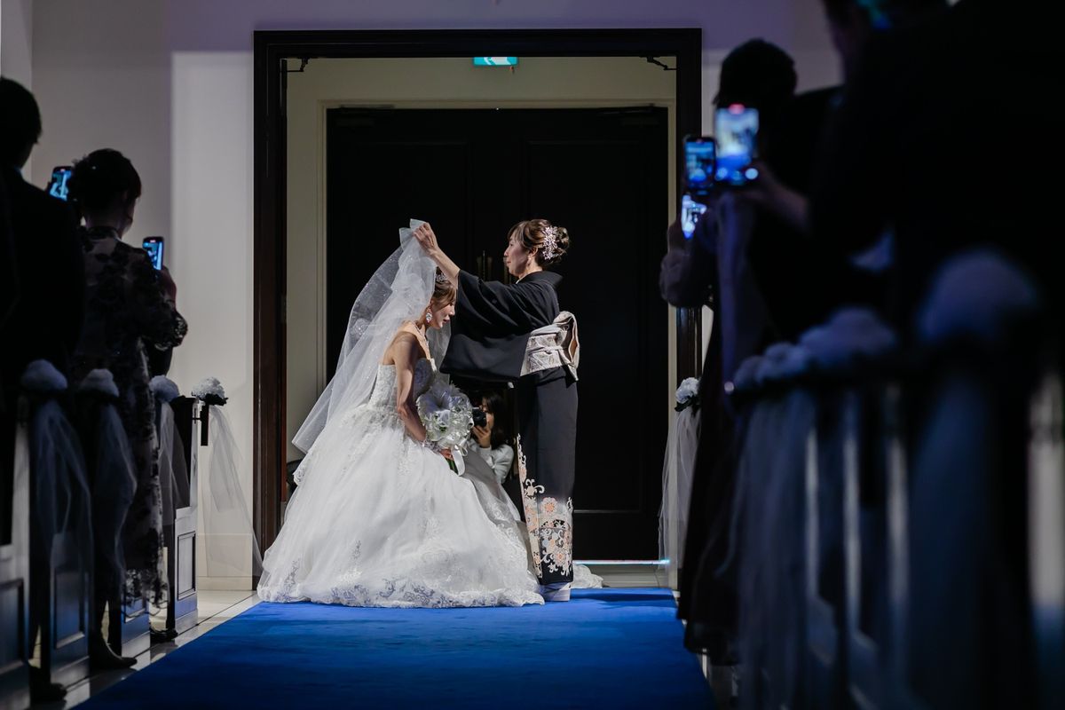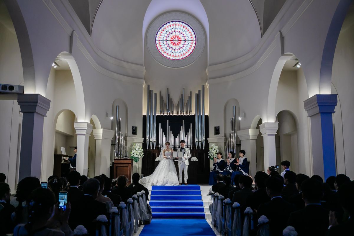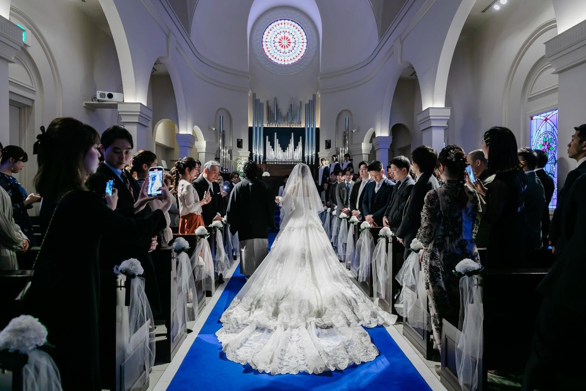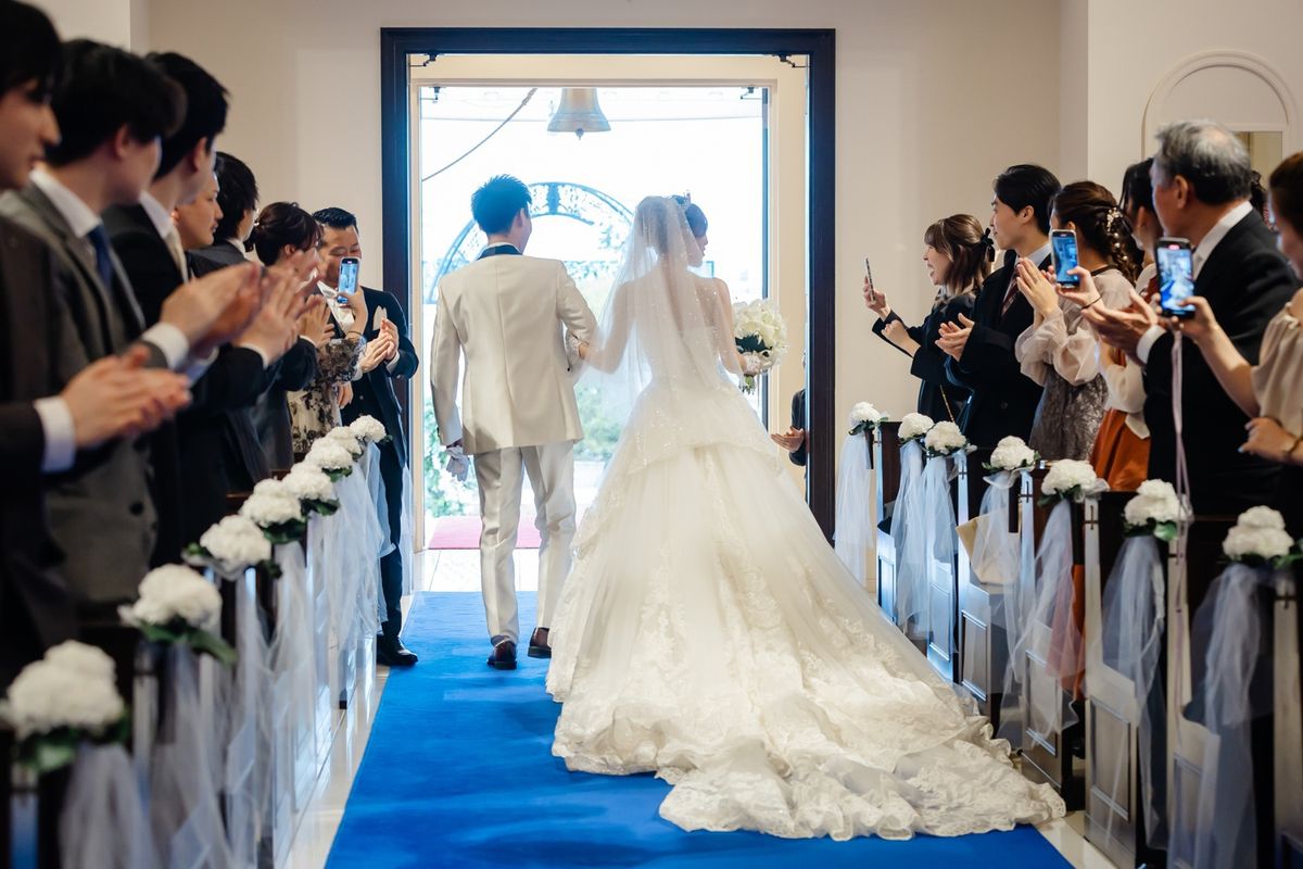 チャペルの特徴である、青いバージンロードに惹かれたことも、当式場を選んだ決め手になったそう。青い絨毯に映えるよう、ご新婦がこだわってお選びになったウェディングドレスは、上品でトレーンが長く、写真映えも抜群でした。キラキラの刺繍が全体に施されており、ご新婦の可愛らしさをより際立たせていらっしゃいました。