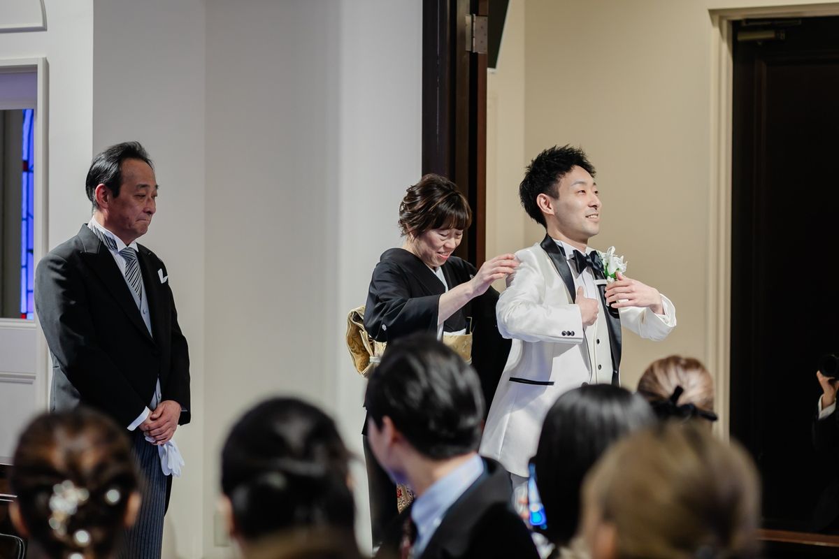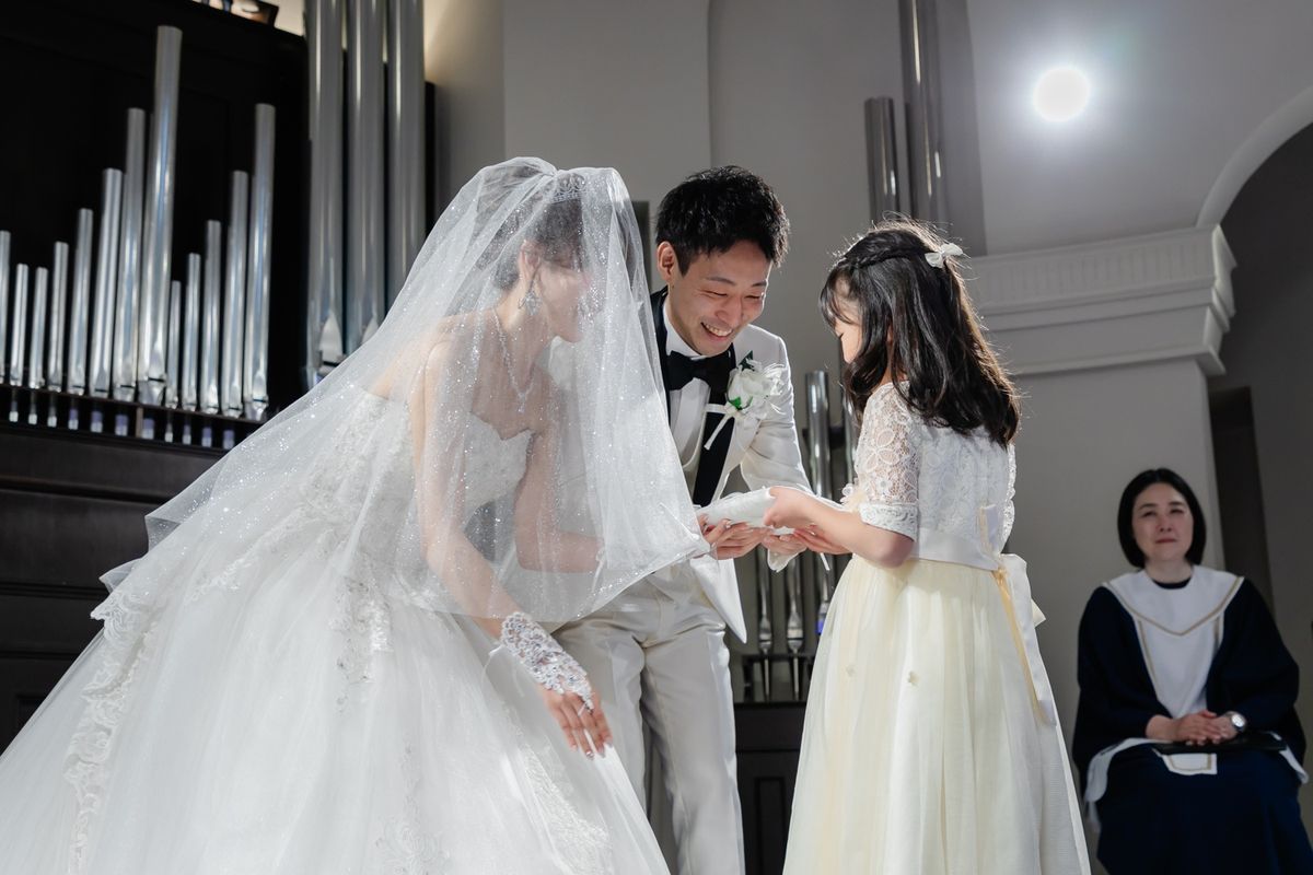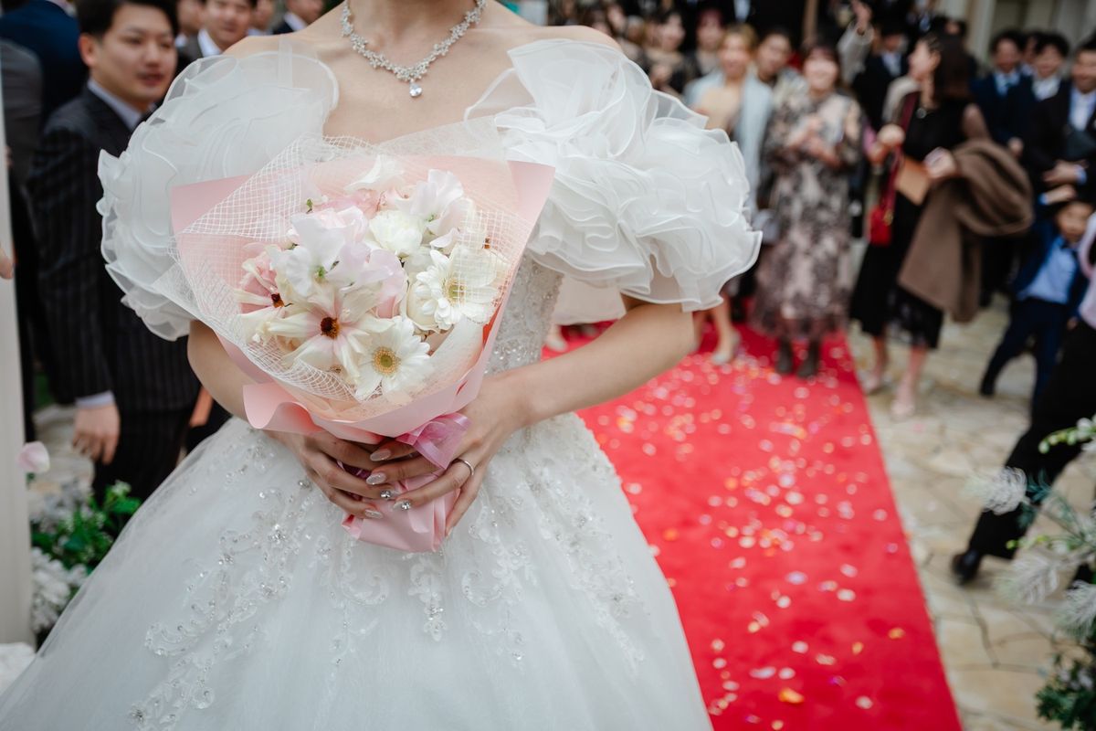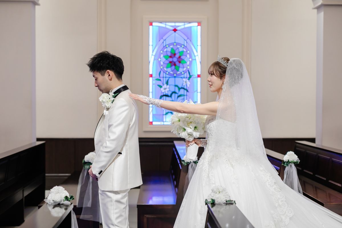 チャペルの特徴である、青いバージンロードに惹かれたことも、当式場を選んだ決め手になったそう。青い絨毯に映えるよう、ご新婦がこだわってお選びになったウェディングドレスは、上品でトレーンが長く、写真映えも抜群でした。キラキラの刺繍が全体に施されており、ご新婦の可愛らしさをより際立たせていらっしゃいました。
