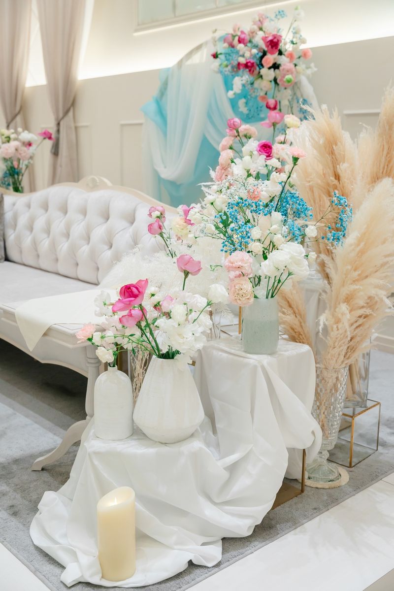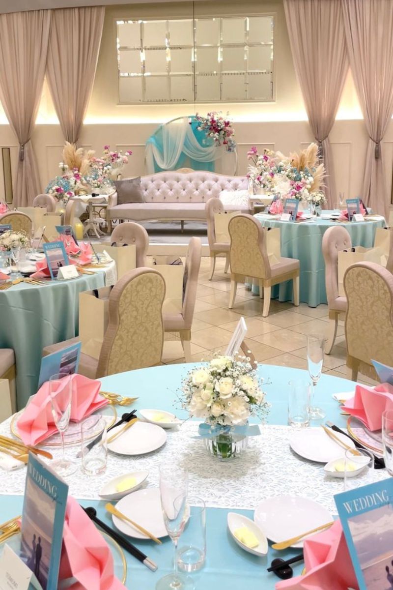 結婚指輪がTiffany & Co.だったことにインスピレーションを受け、ティファニーブルーを中心とした世界観を作り上げたおふたり。装花や衣装に相性の良いピンクを取り入れ、可愛らしい空間を表現されました。