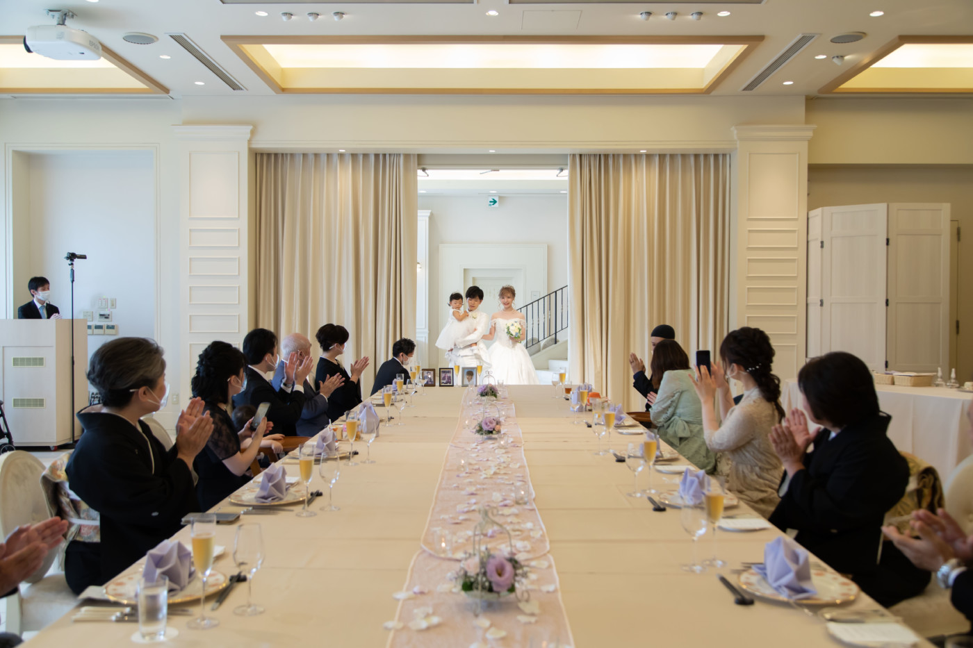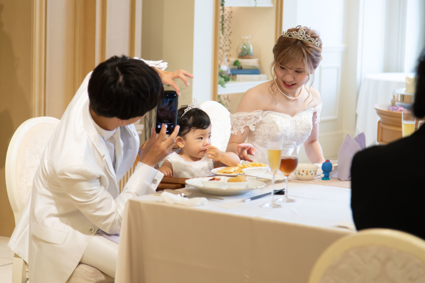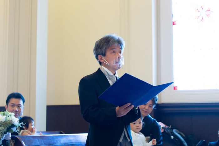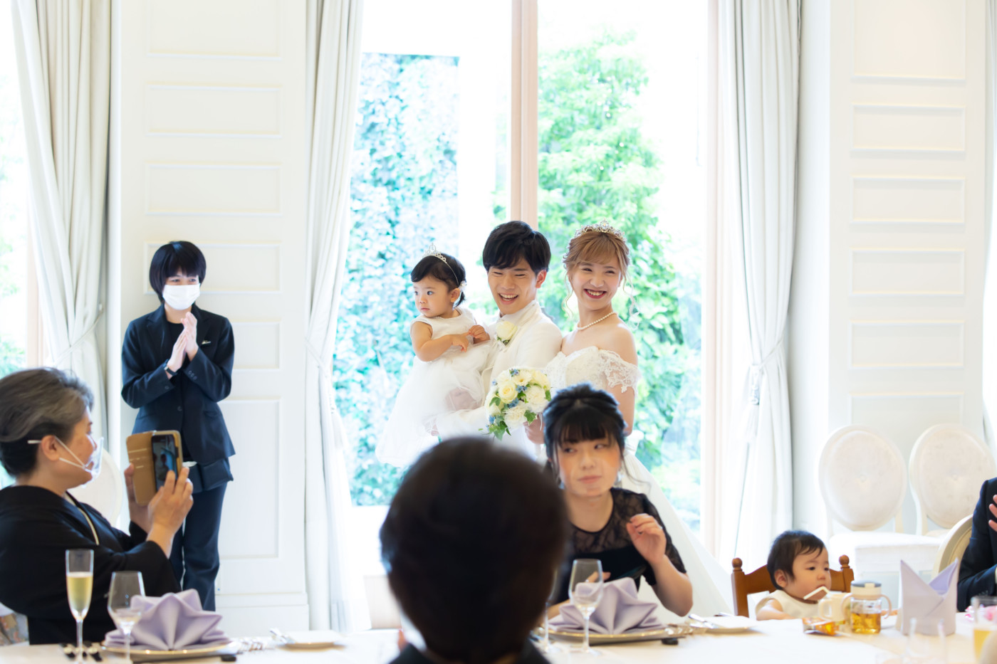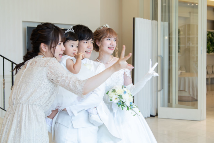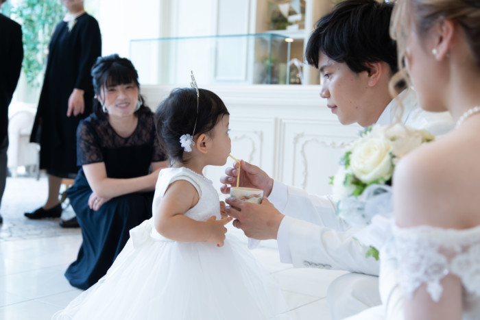 ゲストみなさまに結婚の誓いを承認して頂く、人前式。 両家お父様より誓いの言葉を問いかける家族の温かいセレモニーに。 披露宴会場では、小さなお子様にも安心して過ごしていただけるキッズスペースを用意。 たくさんのお写真を撮ったり、皆様とお話がしっかり出来る空間に。 家族に感謝の気持ちを伝えられる、温かくて笑顔いっぱいの1日となりました。