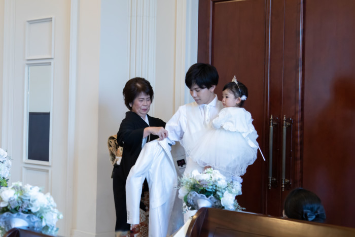 挙式の開始は、ご新郎のジャケットセレモニーから・・・ 結びのお仕度は今までお世話になったお母様にご担当頂きました
