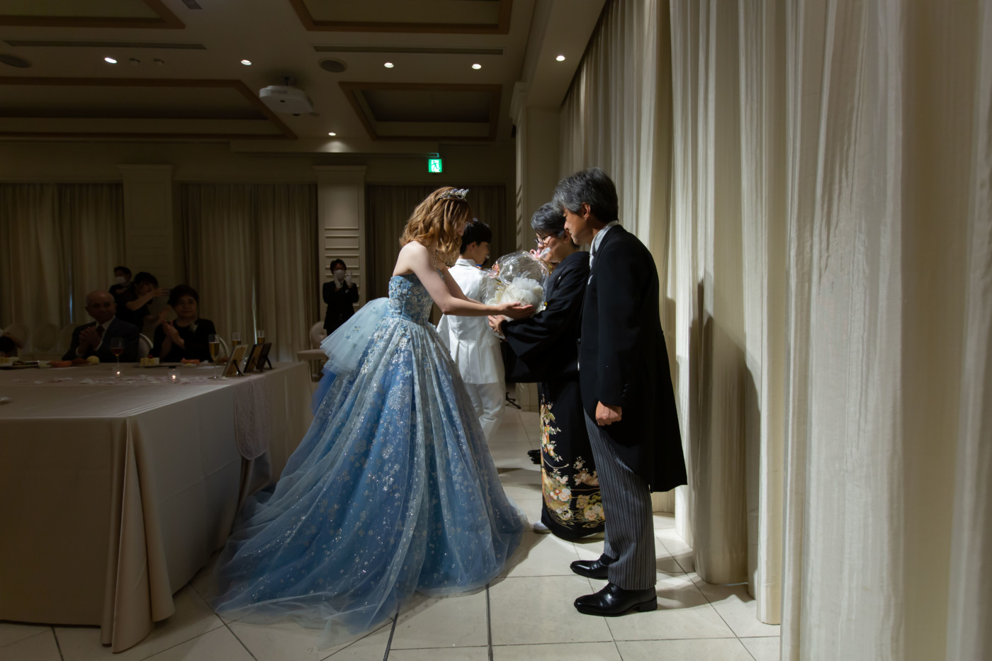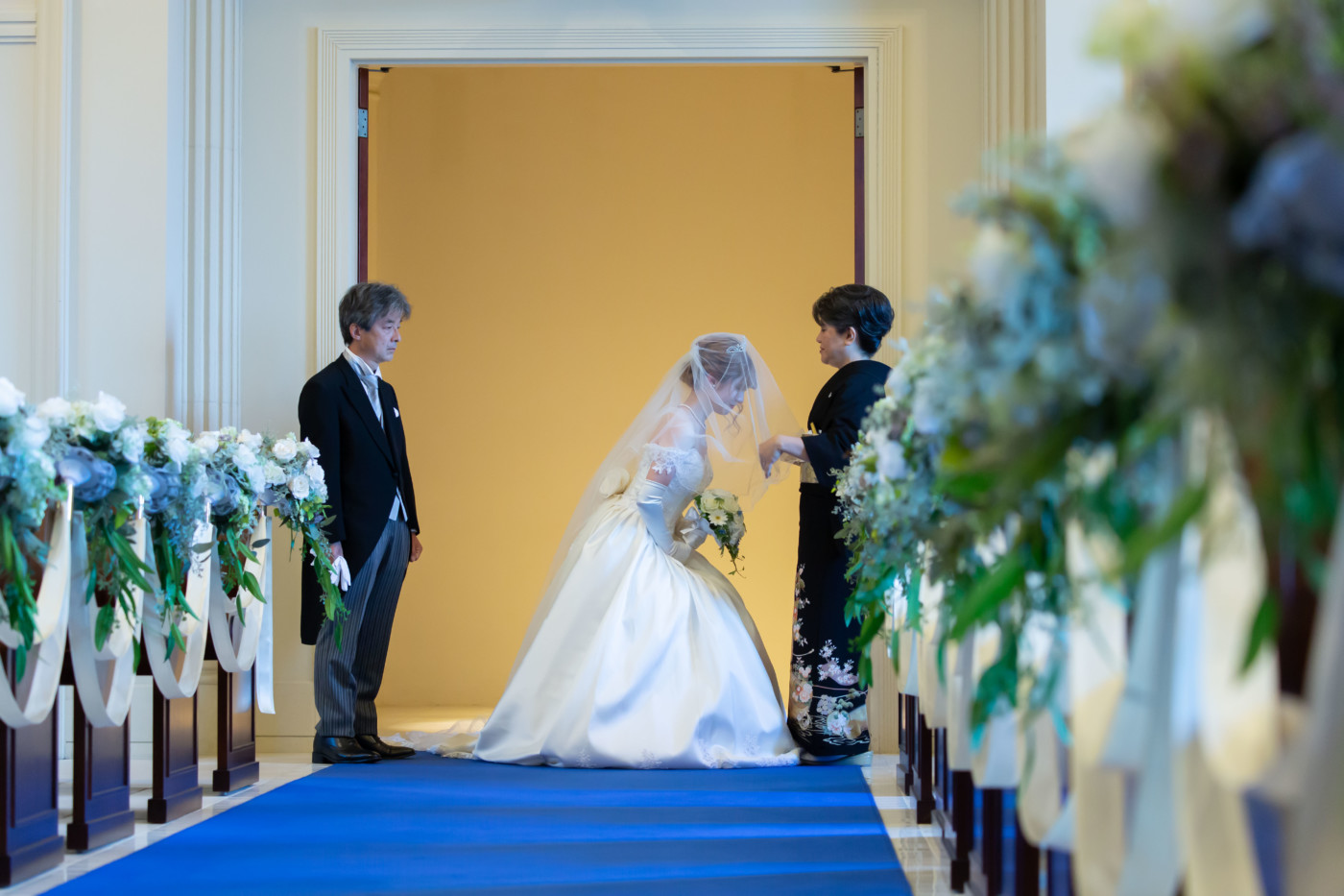 ご新婦入場では、今までの身支度を整えてくださったお母様に 花嫁身支度としてベールダウンを行っていただきました