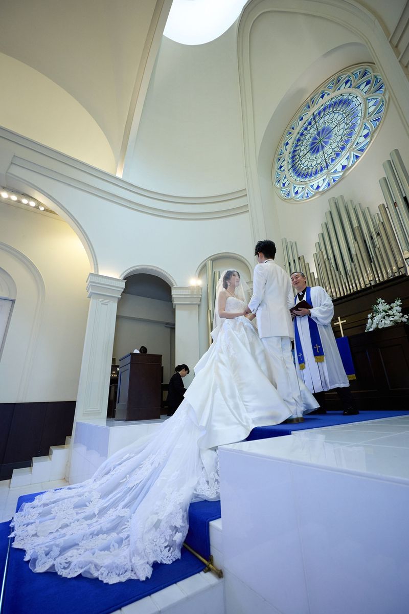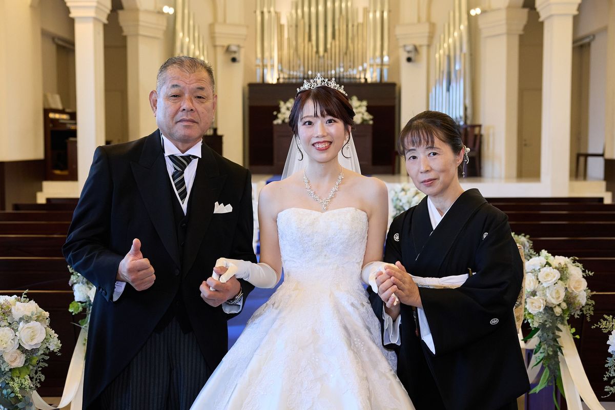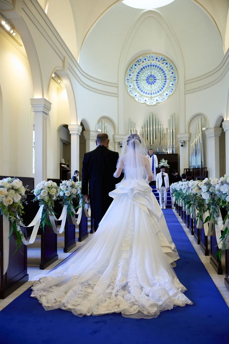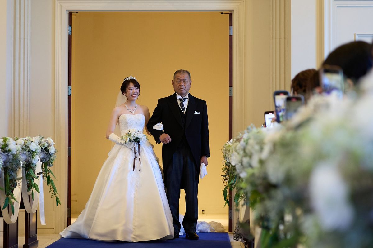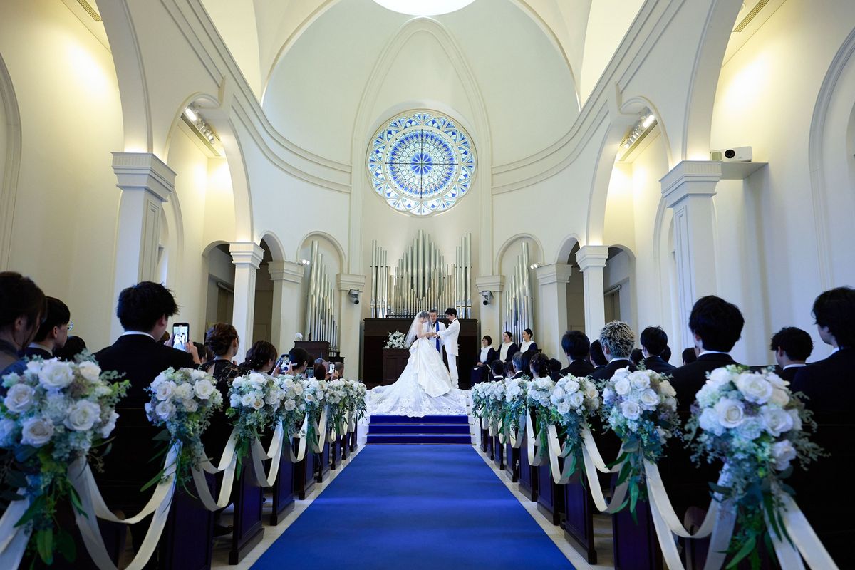 新婦様は当式場のチャペルを見た瞬間、青いバージンロードに強く惹かれ、胸が高鳴ったそうです。当日は純白のウェディングドレスが美しく映え、感動的なシーンが広がりました。また、チャペル内にはパイプオルガンの荘厳な音色と聖歌隊の歌声が響き渡り、より格式ある雰囲気に。入場前にチャペルムービーを流した際は会場が一気に盛り上がるとともに、ムービーを見つめるご新婦の御父様の表情がとても印象的でした。