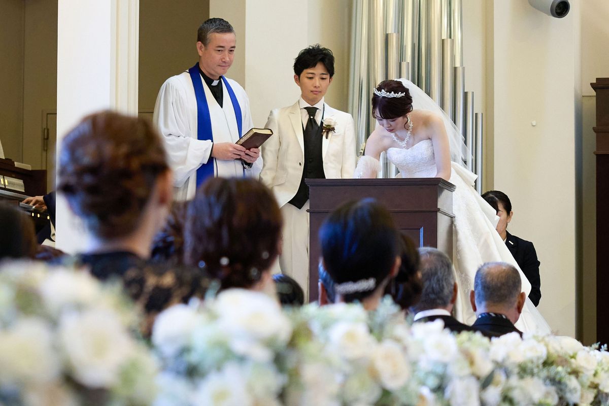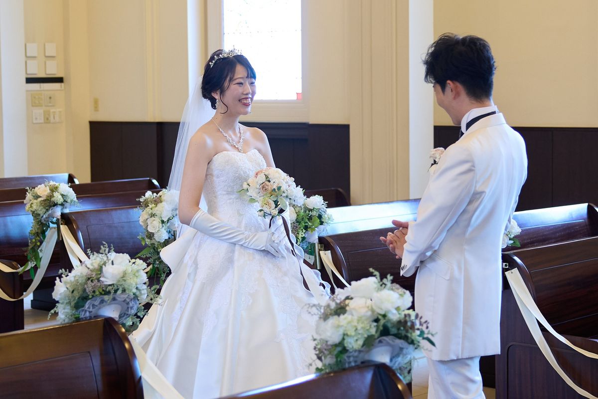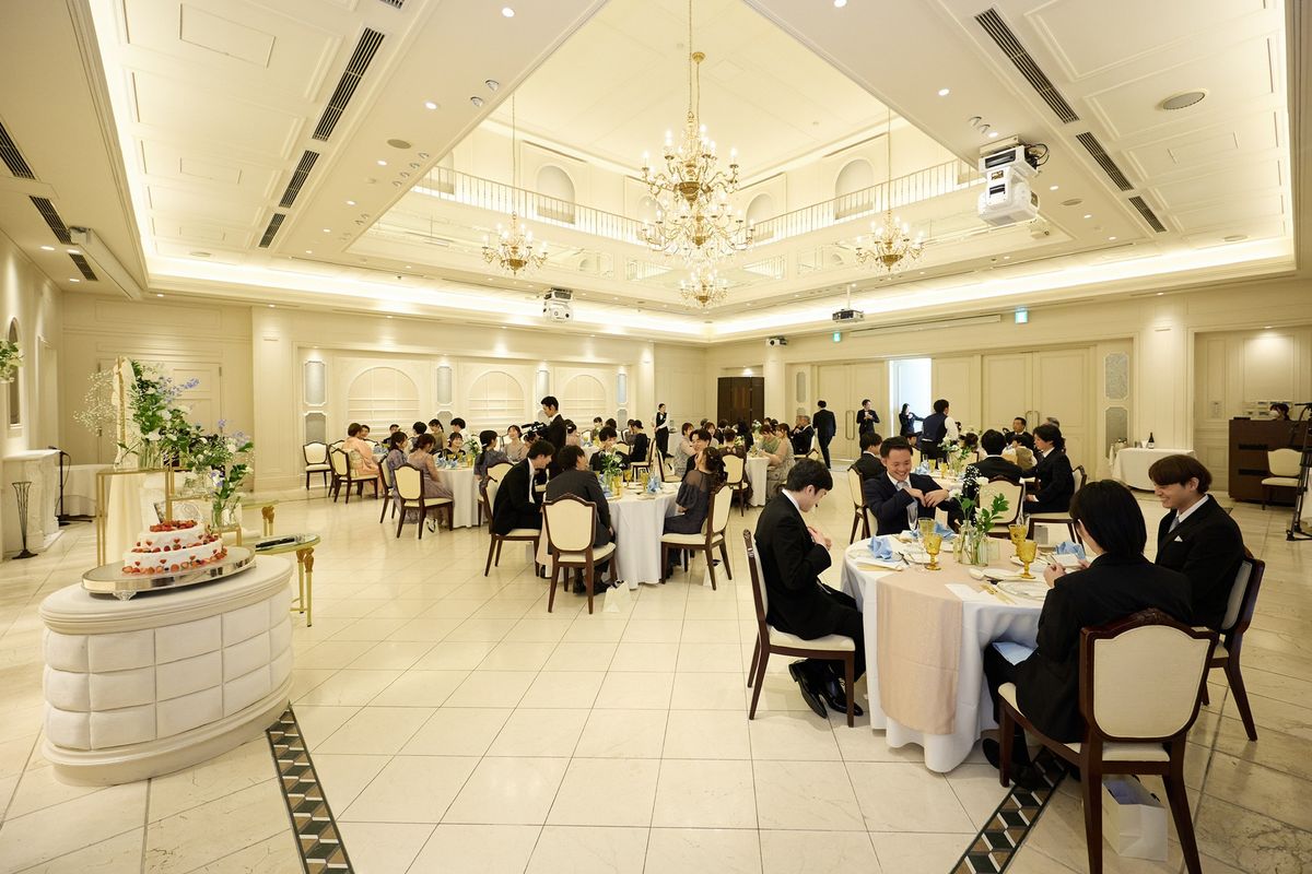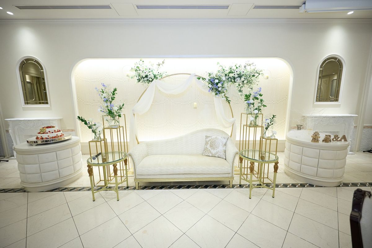 新婦様は当式場のチャペルを見た瞬間、青いバージンロードに強く惹かれ、胸が高鳴ったそうです。当日は純白のウェディングドレスが美しく映え、感動的なシーンが広がりました。また、チャペル内にはパイプオルガンの荘厳な音色と聖歌隊の歌声が響き渡り、より格式ある雰囲気に。入場前にチャペルムービーを流した際は会場が一気に盛り上がるとともに、ムービーを見つめるご新婦の御父様の表情がとても印象的でした。
