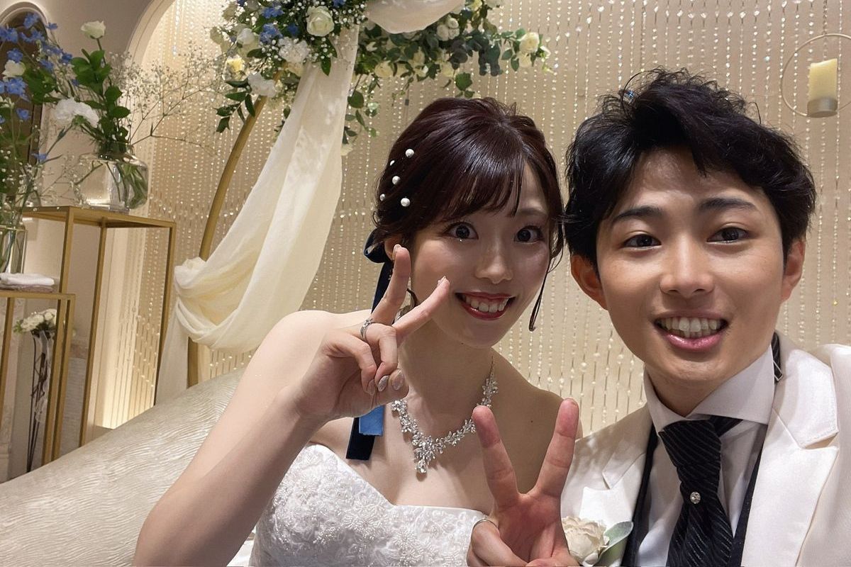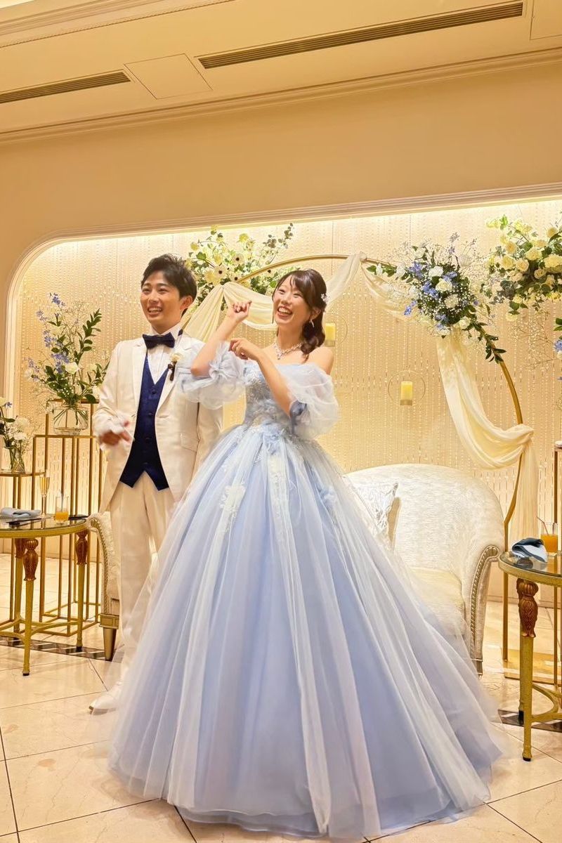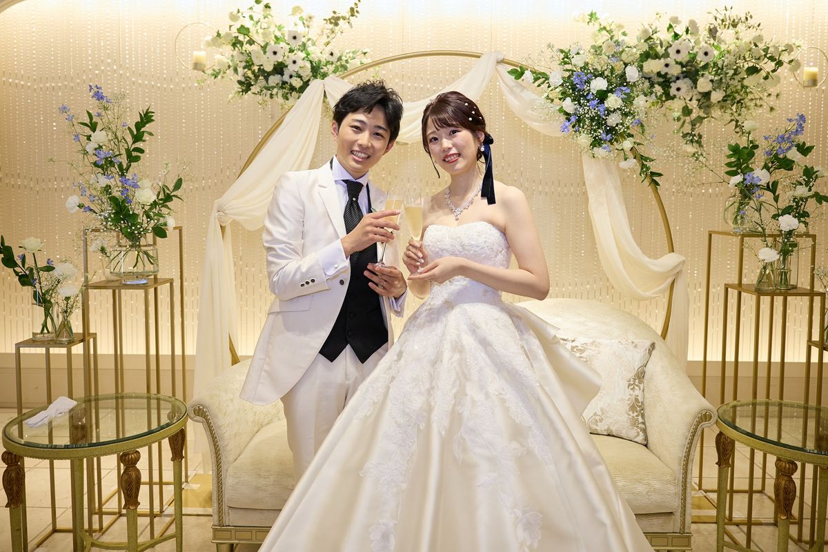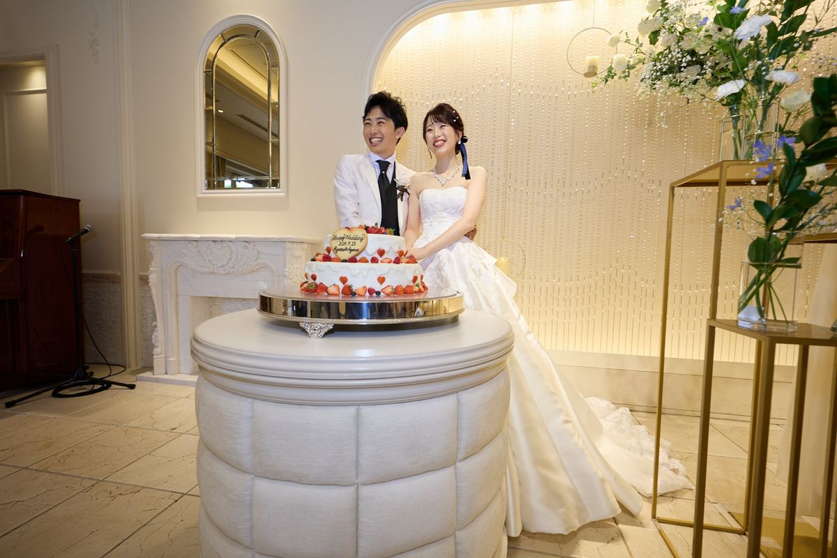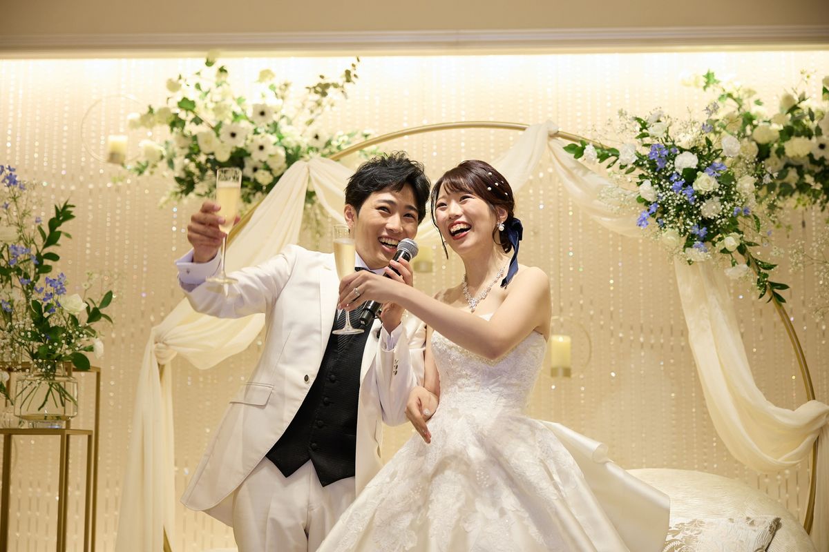 『堅苦しくかしこまった雰囲気にならないこと』にこだわり、様々な工夫をされています。 披露宴では、皆様が楽しめる時間を作るために『ドレスの色当てクイズ』や『格付けチェック』など、ゲスト全員が参加できる演出を取り入れ「楽しかった!」と大変喜ばれました。 特に『格付けチェック』は、打合せの段階で当式場スタッフと一緒に様々な題材を試しながら綿密な準備をされたので、当日は大成功でした!