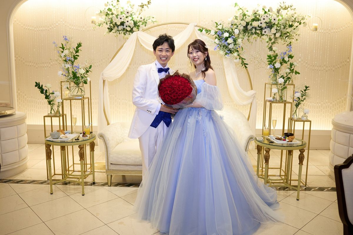 『サロン ドゥ フルール』は50名程のパーティではゆったりとご利用可能で、テーブル間の移動もスムーズに行っていただけます。お色直し後のガーデン側からの再入場ではゲストも驚かれ、サプライズ大成功!また、パーティ後半に新郎様から新婦様へ112本のバラの花束を贈るサプライズも素敵でした。プロポーズの日が11月2日で、その際に12本のバラを渡したことにちなみ“100%の愛を込めて”という意味の112本にしたそうです。