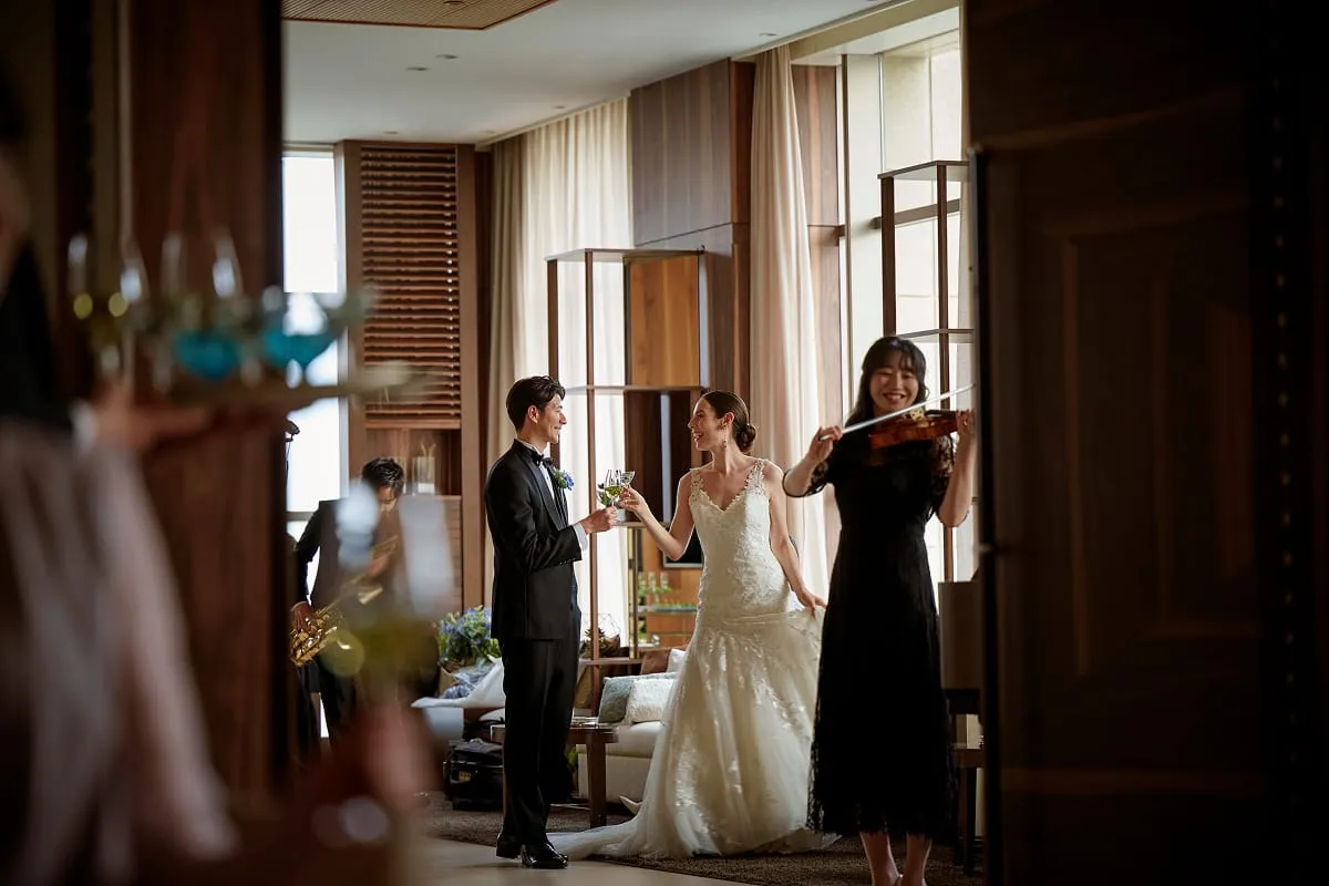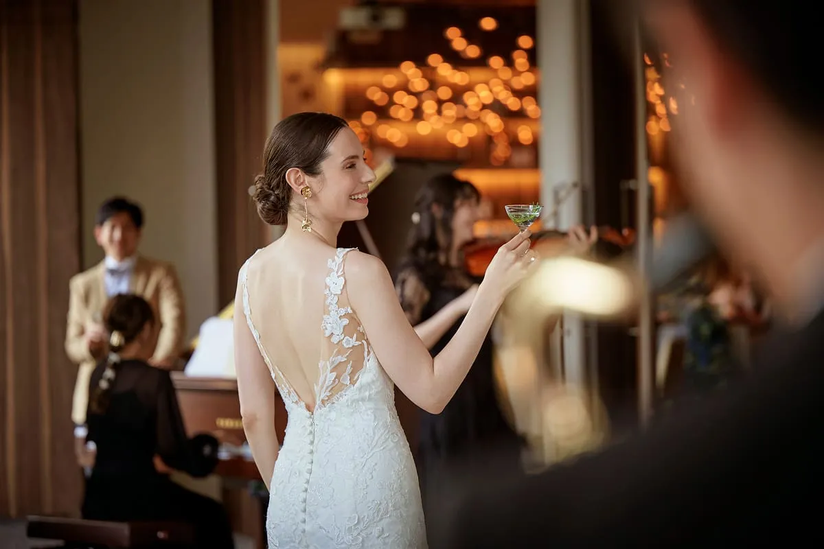 天井から降りそそぐ光がシャンパンの泡のような高級感。上質な素材感に包まれ、大人のウェディングをより一層華やかに彩ります。