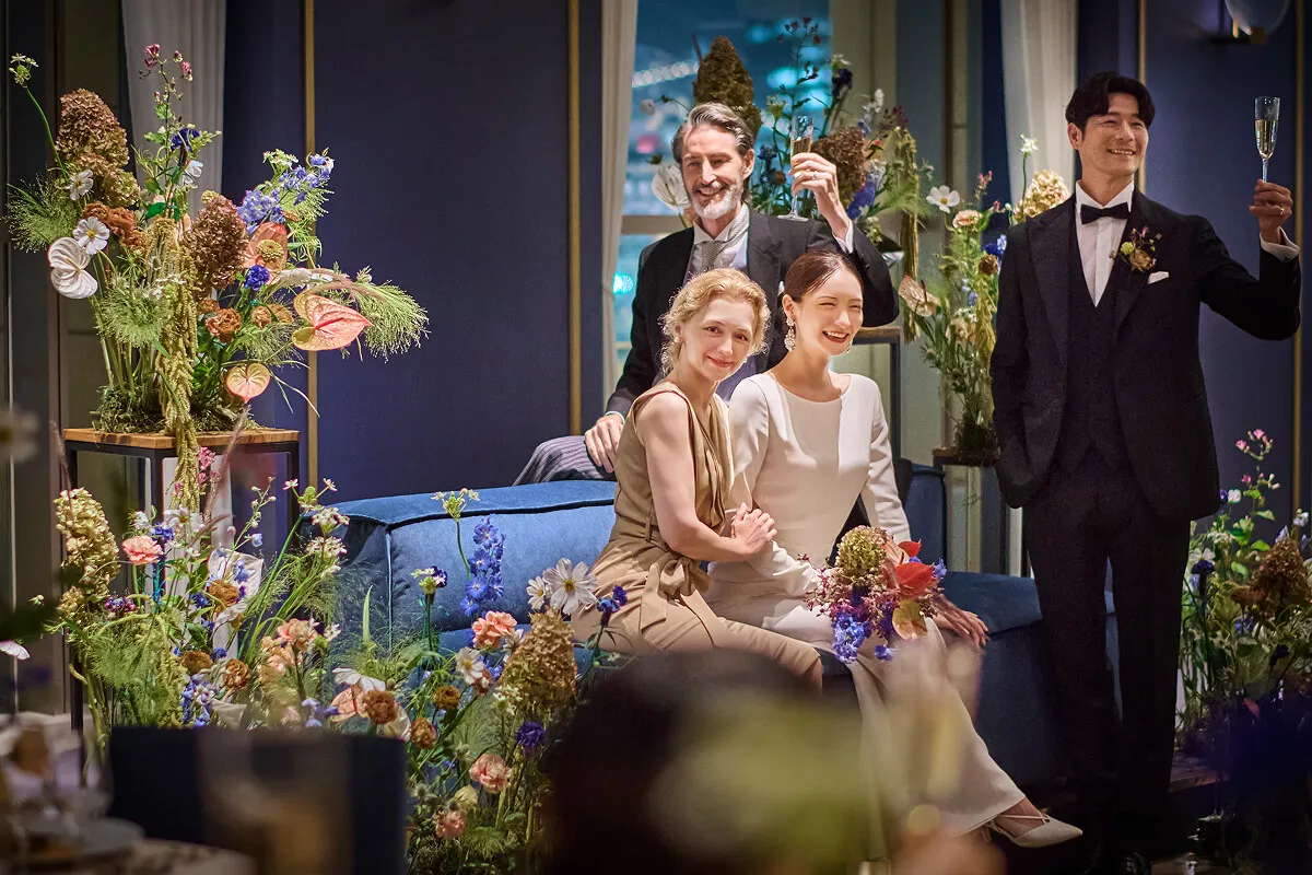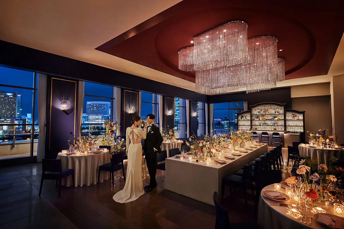横浜にふさわしい、洗練と遊び心が共存する最上階の会場は、豪華なシャンデリアや最新コーディネートが魅力。赤と青のコントラストが映える空間にバーカウンターを備え、大人の感性を刺激するトレンド感のあるパーティを演出します。