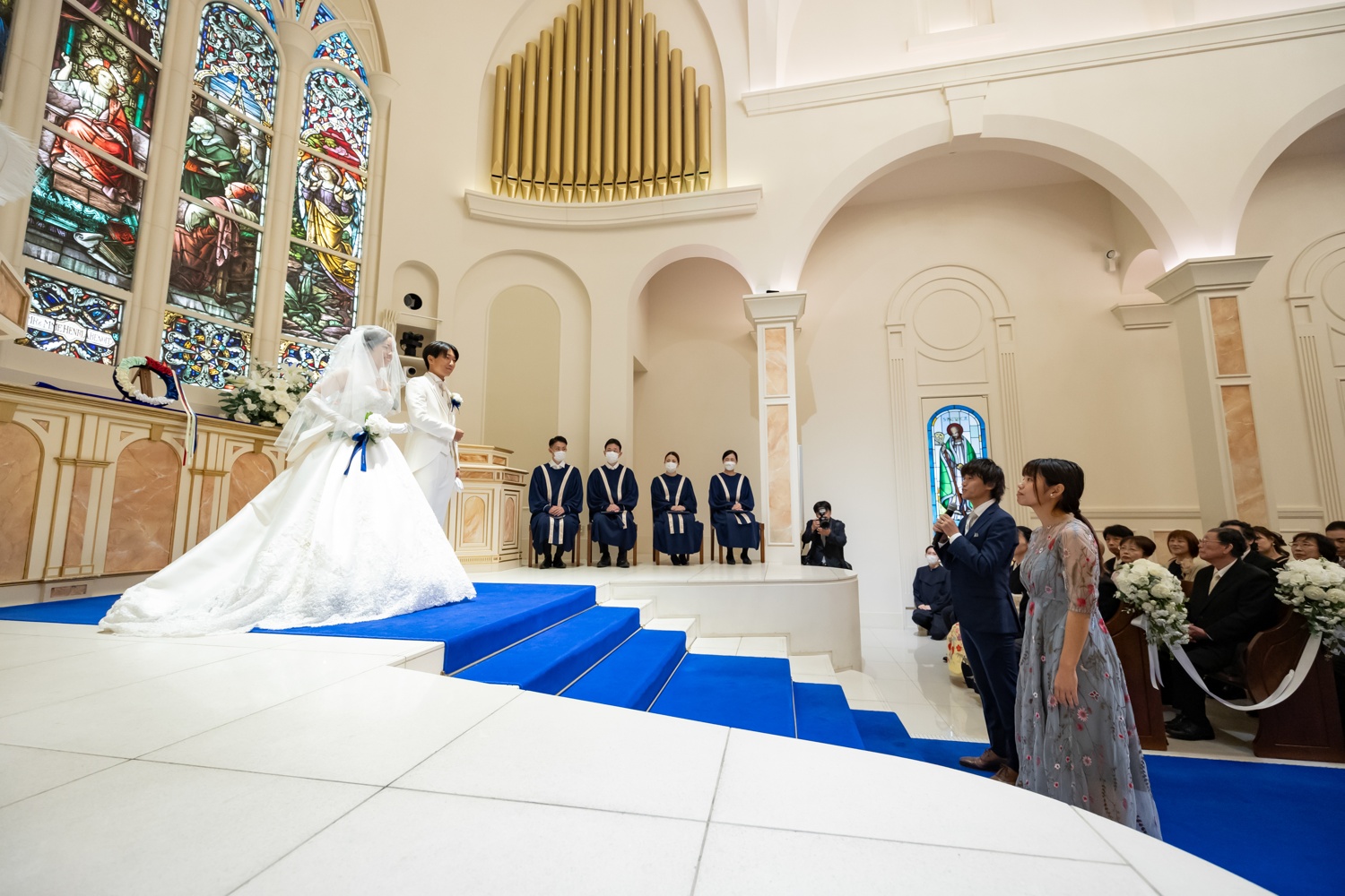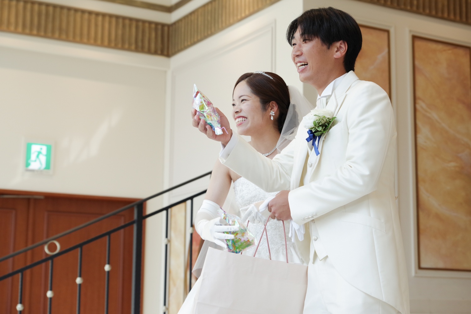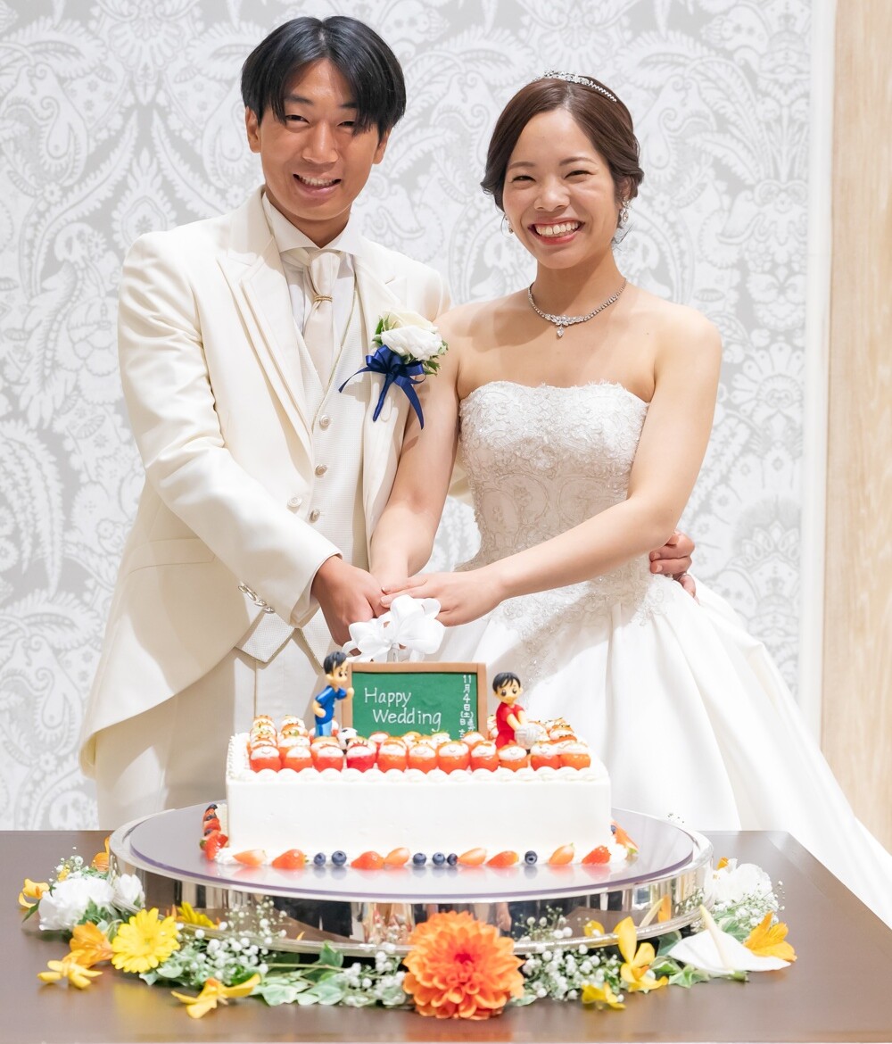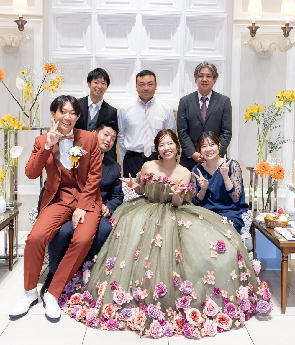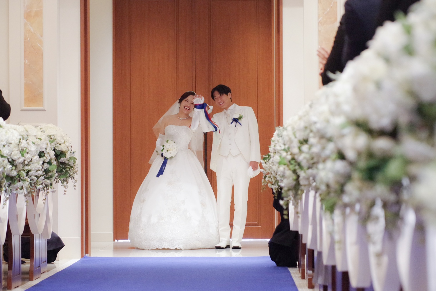 ご新婦こだわりのビタミンカラーのお花×ブルーのテーブルコーデやカラフルなドレスがとってもキュートな結婚式。 ゲストも一緒に楽しめるように指輪のお届けサプライズやリボンセレモニーなどを取り入れてご準備され、当日はたくさんの笑顔がはじけるHappyな1日になりました。