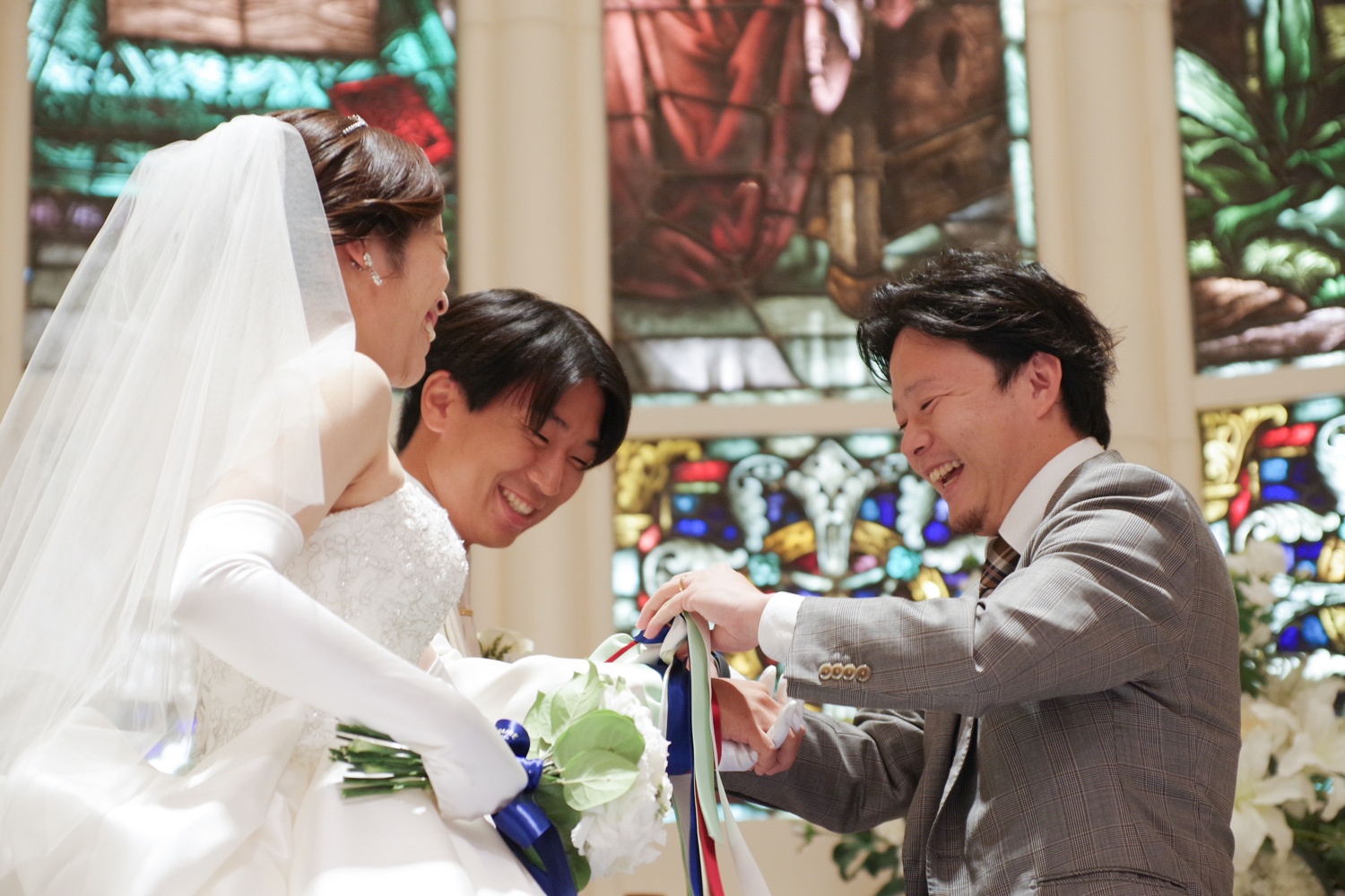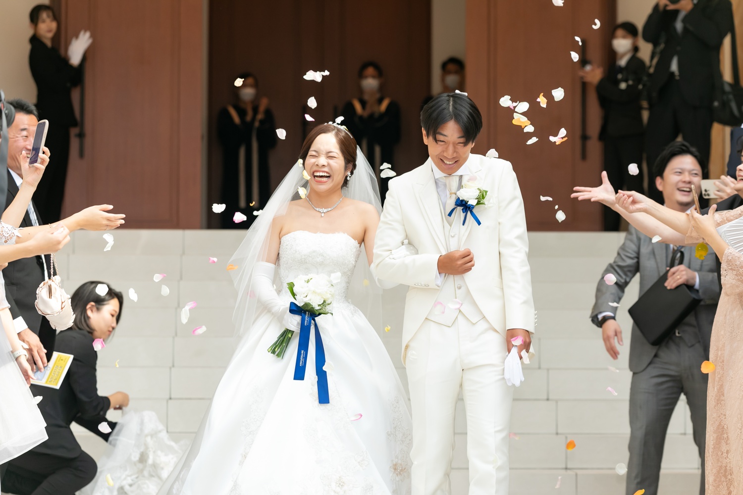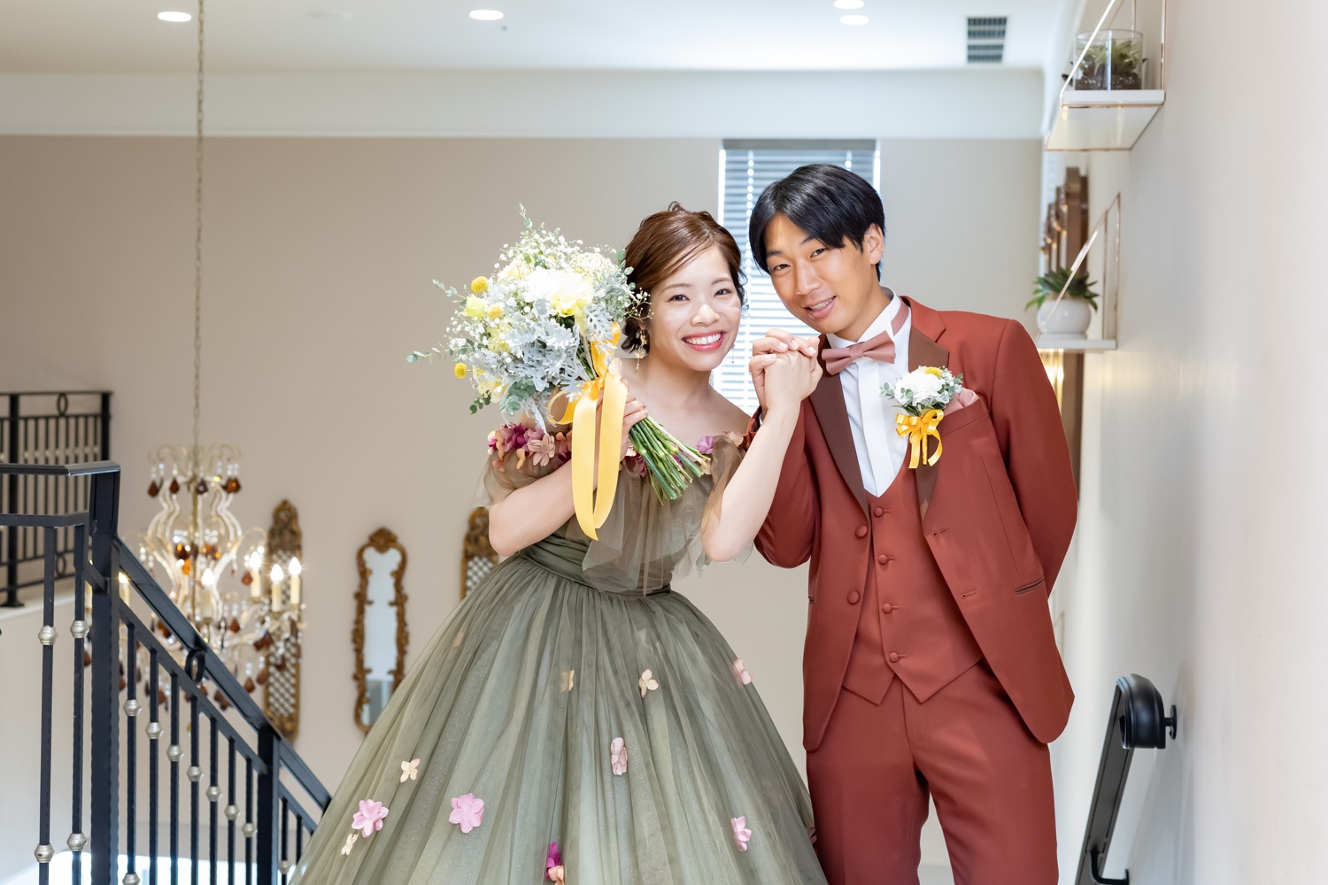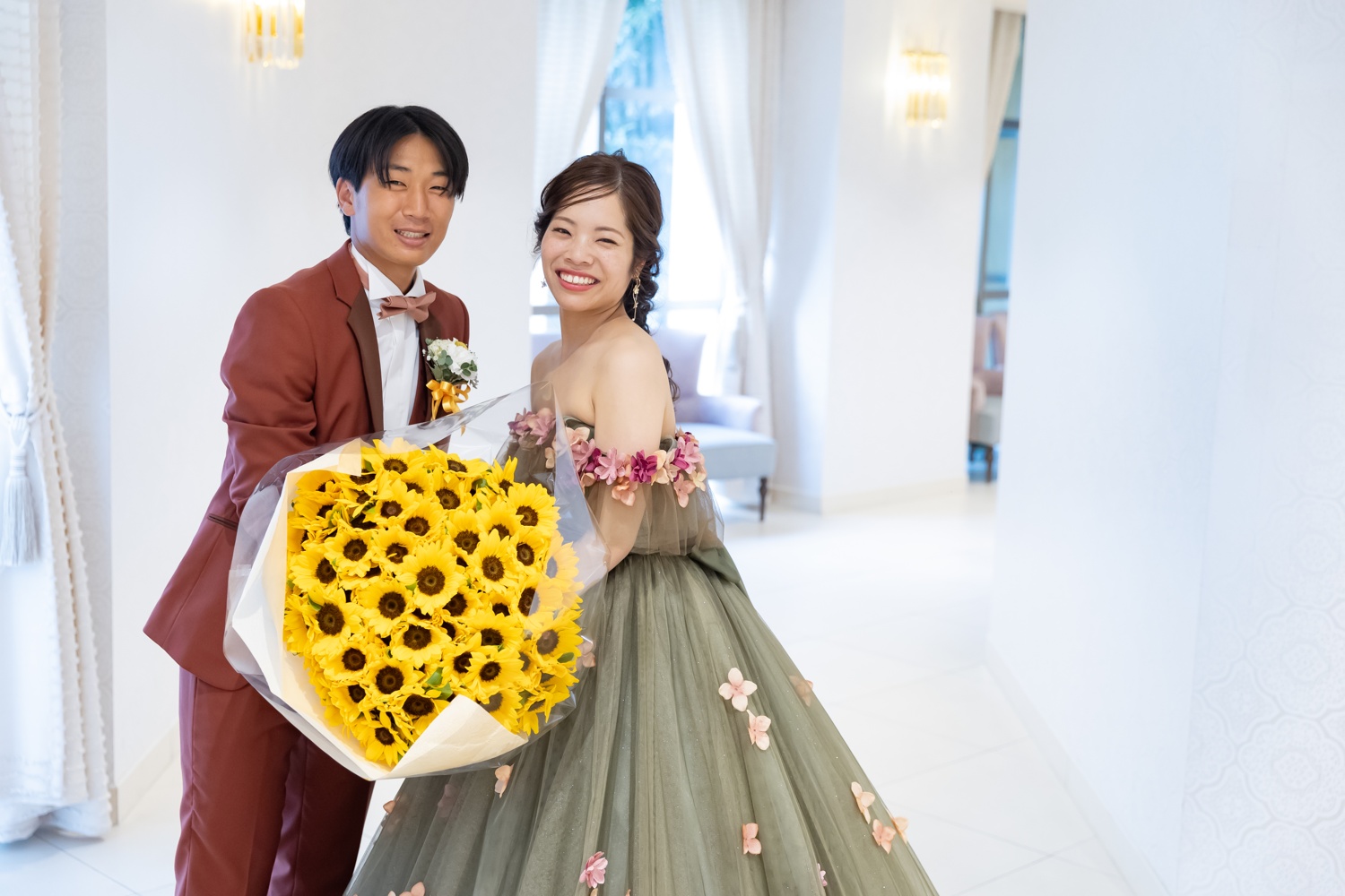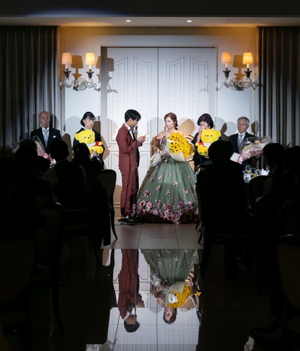 ご新婦こだわりのビタミンカラーのお花×ブルーのテーブルコーデやカラフルなドレスがとってもキュートな結婚式。 ゲストも一緒に楽しめるように指輪のお届けサプライズやリボンセレモニーなどを取り入れてご準備され、当日はたくさんの笑顔がはじけるHappyな1日になりました。
