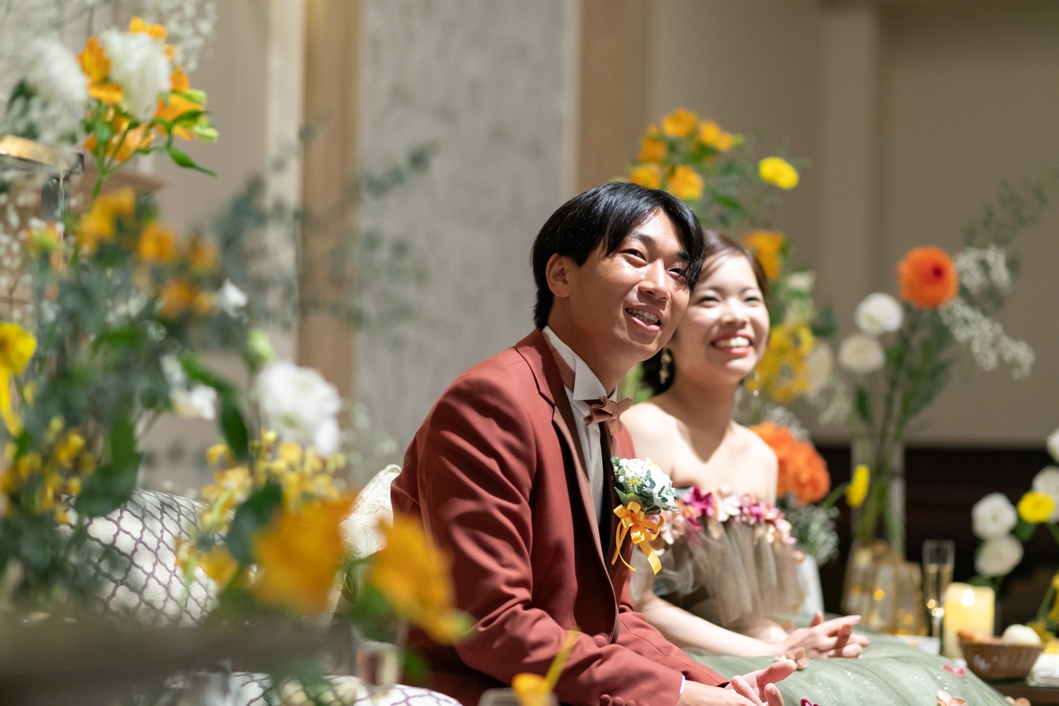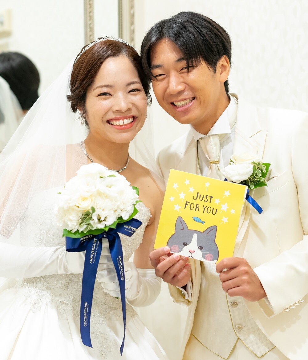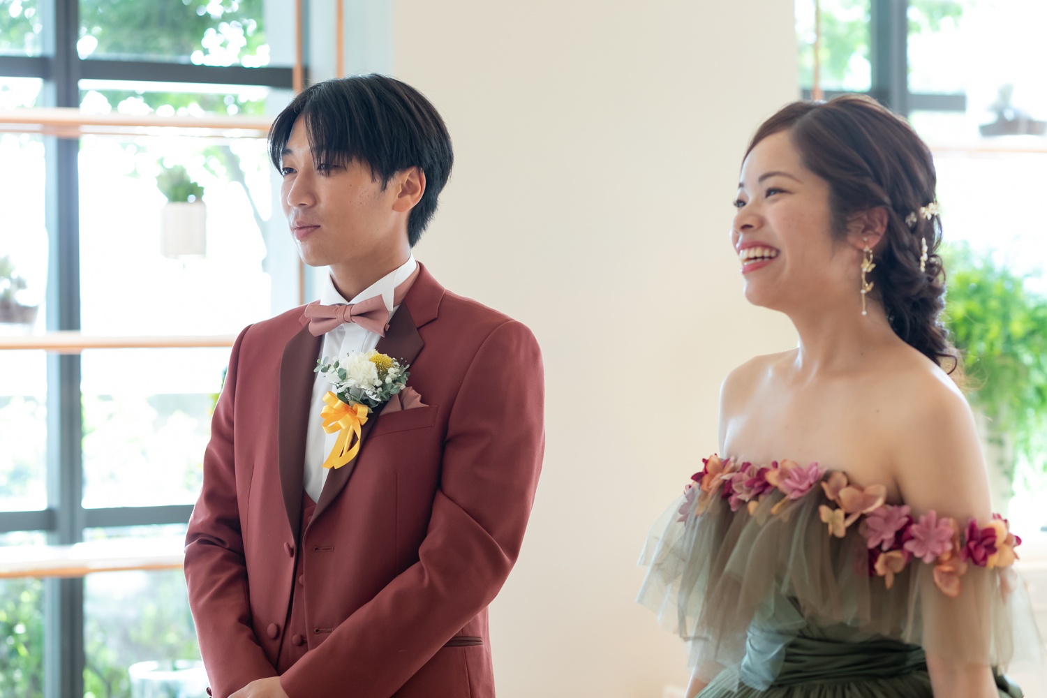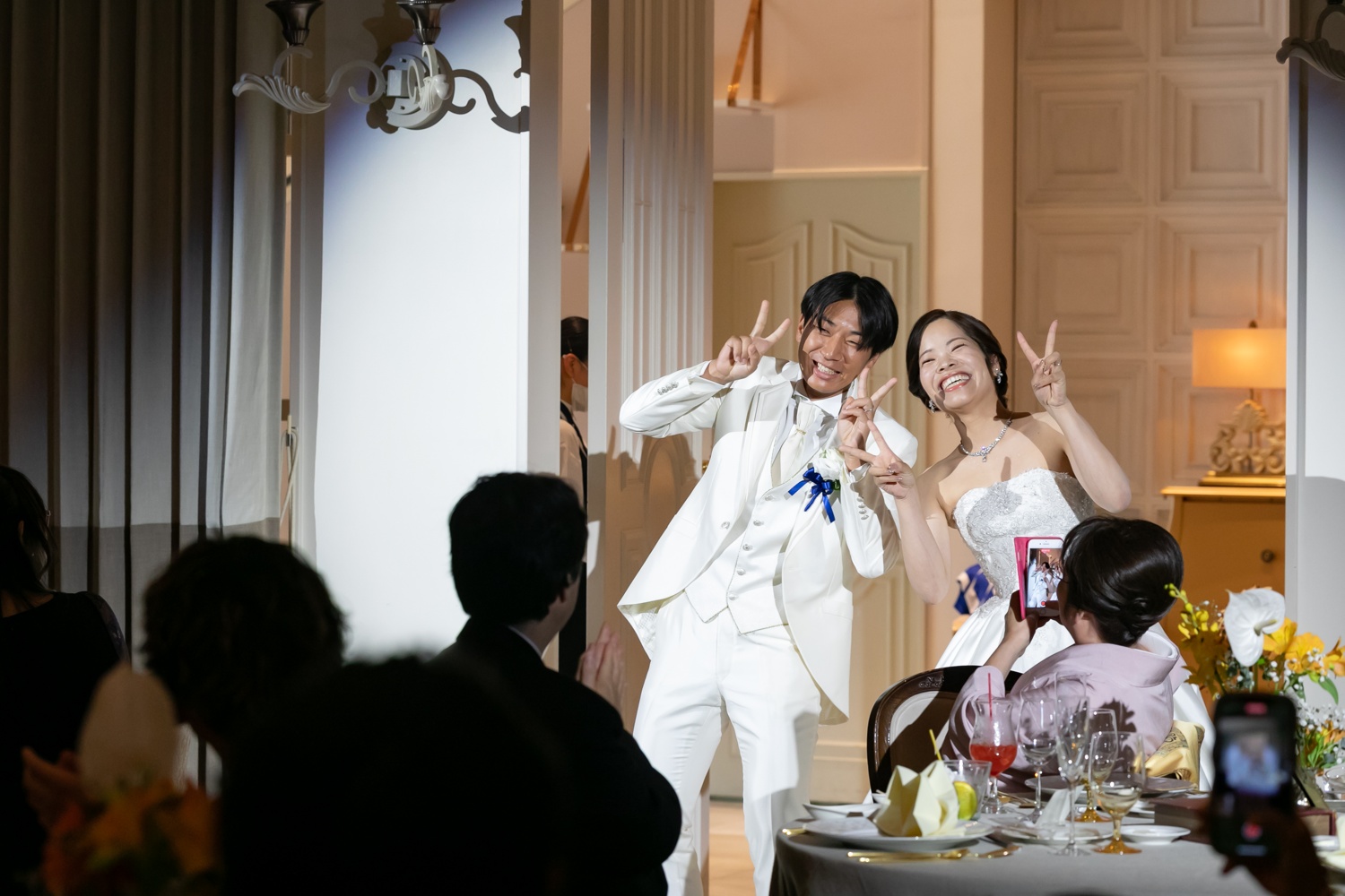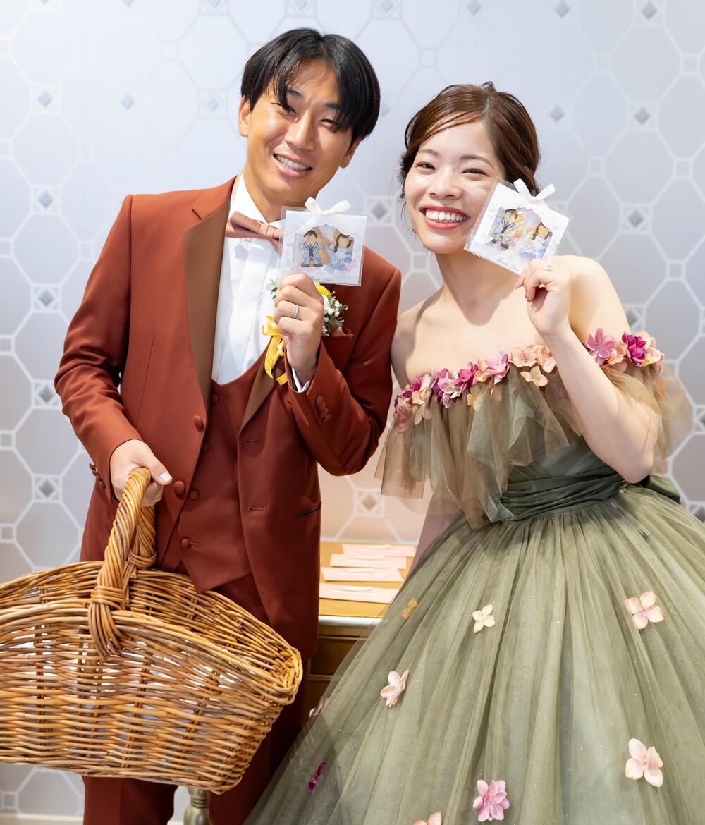 ご新婦こだわりのビタミンカラーのお花×ブルーのテーブルコーデやカラフルなドレスがとってもキュートな結婚式。 ゲストも一緒に楽しめるように指輪のお届けサプライズやリボンセレモニーなどを取り入れてご準備され、当日はたくさんの笑顔がはじけるHappyな1日になりました。