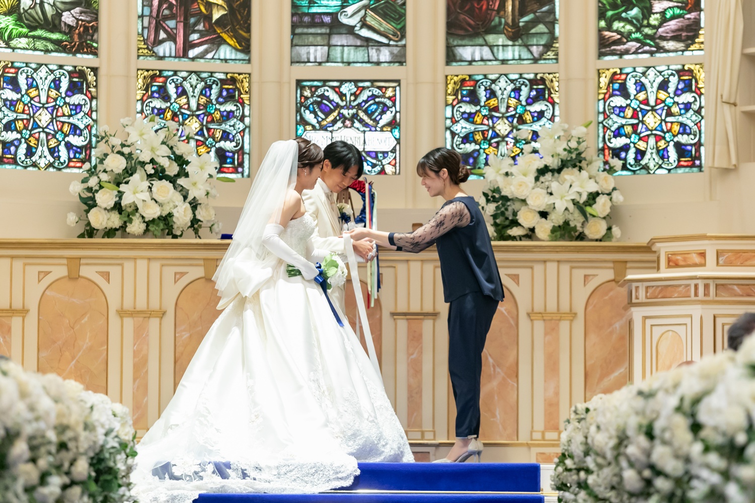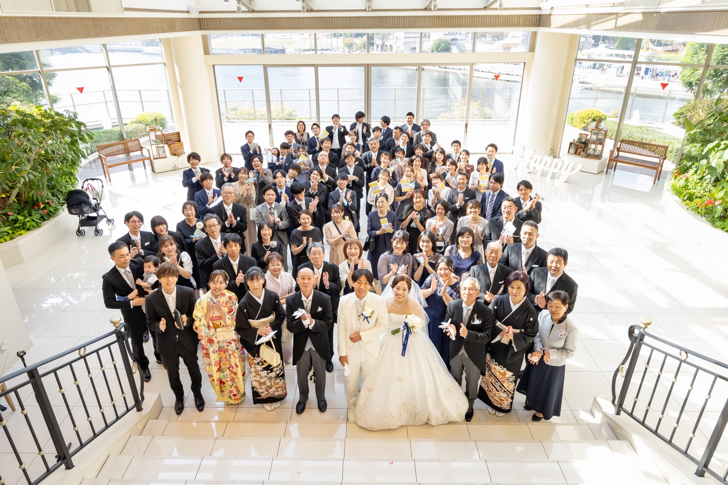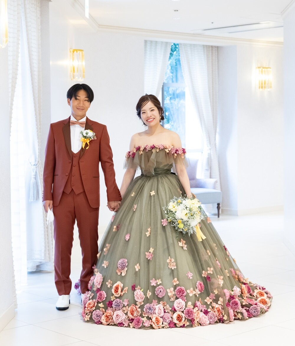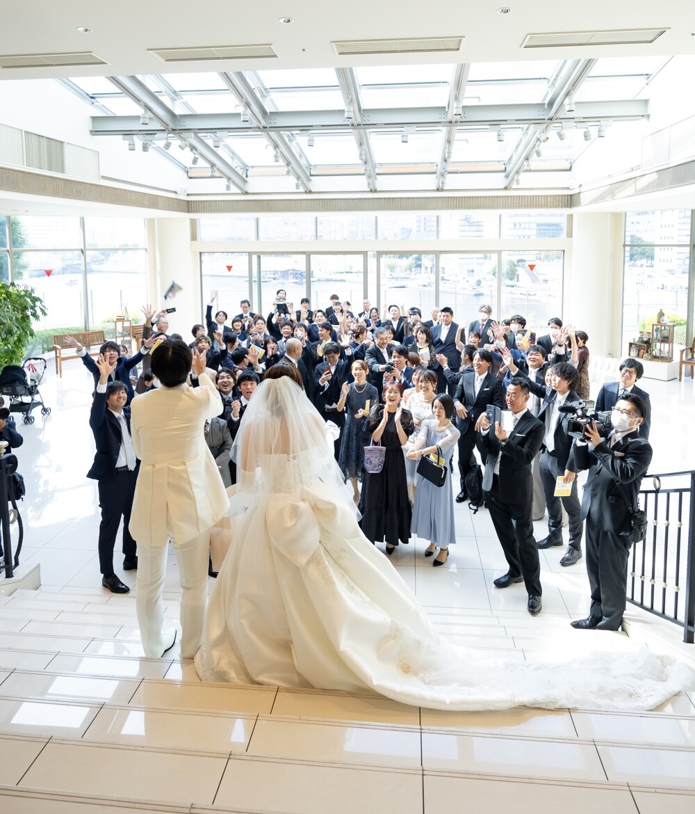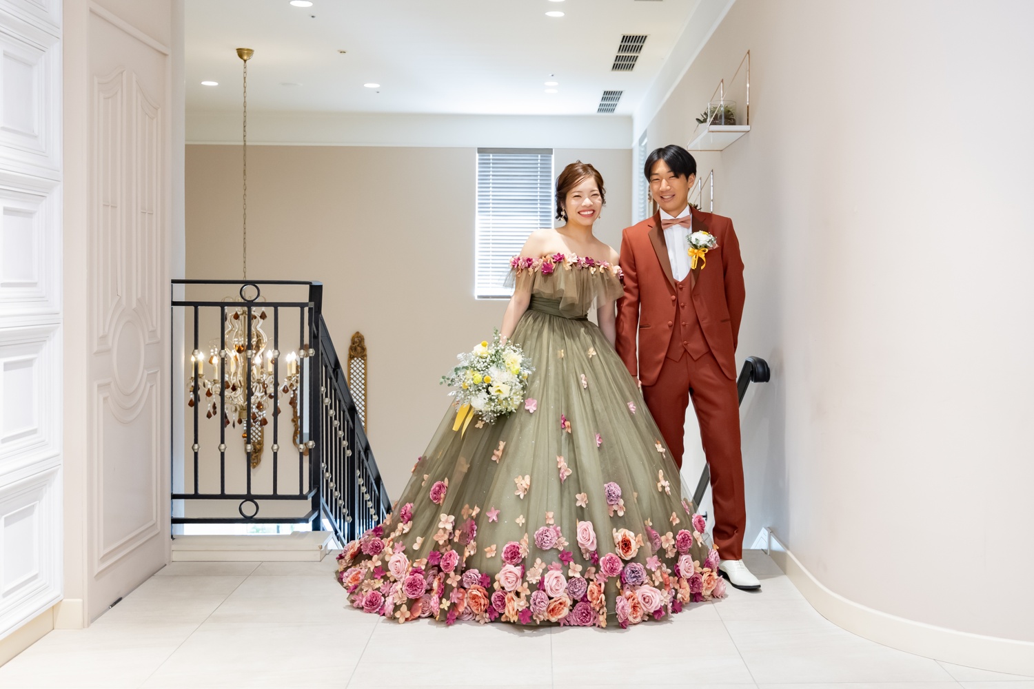 ご新婦こだわりのビタミンカラーのお花×ブルーのテーブルコーデやカラフルなドレスがとってもキュートな結婚式。 ゲストも一緒に楽しめるように指輪のお届けサプライズやリボンセレモニーなどを取り入れてご準備され、当日はたくさんの笑顔がはじけるHappyな1日になりました。