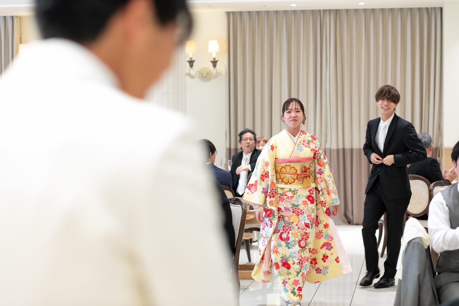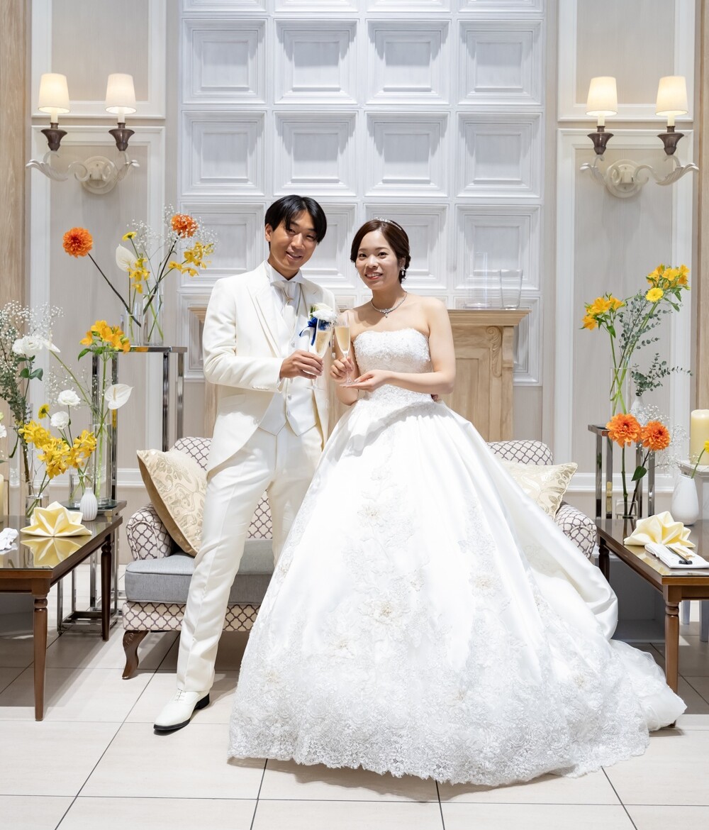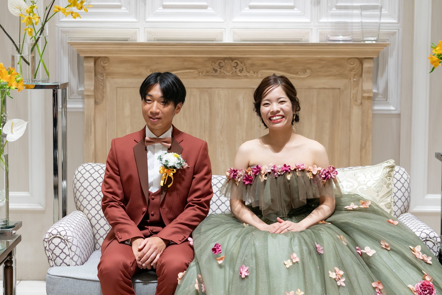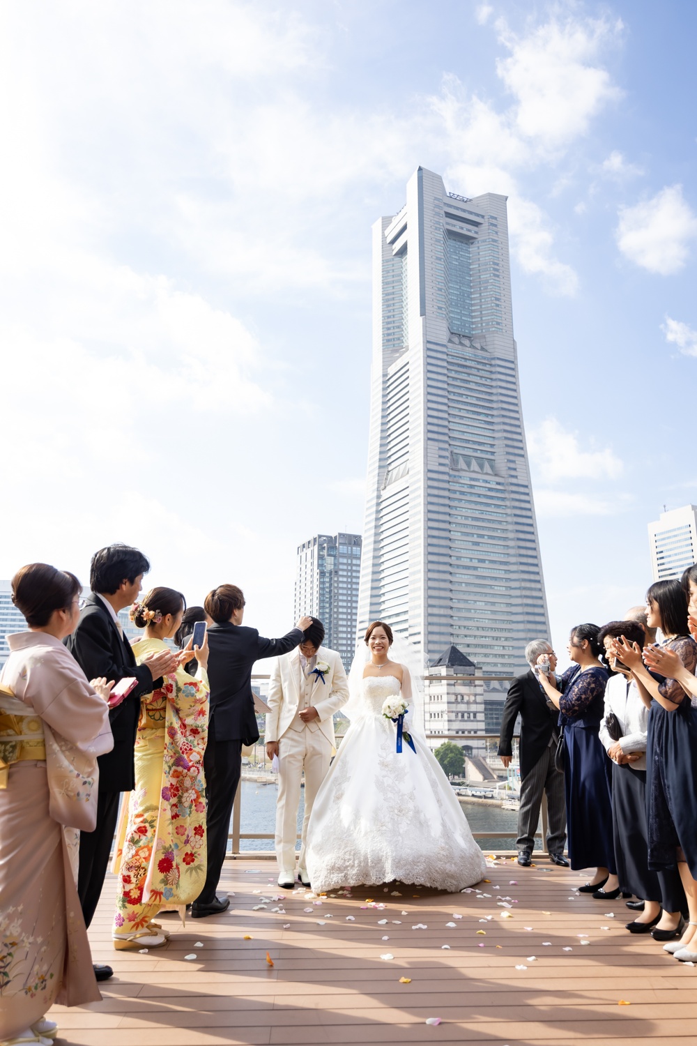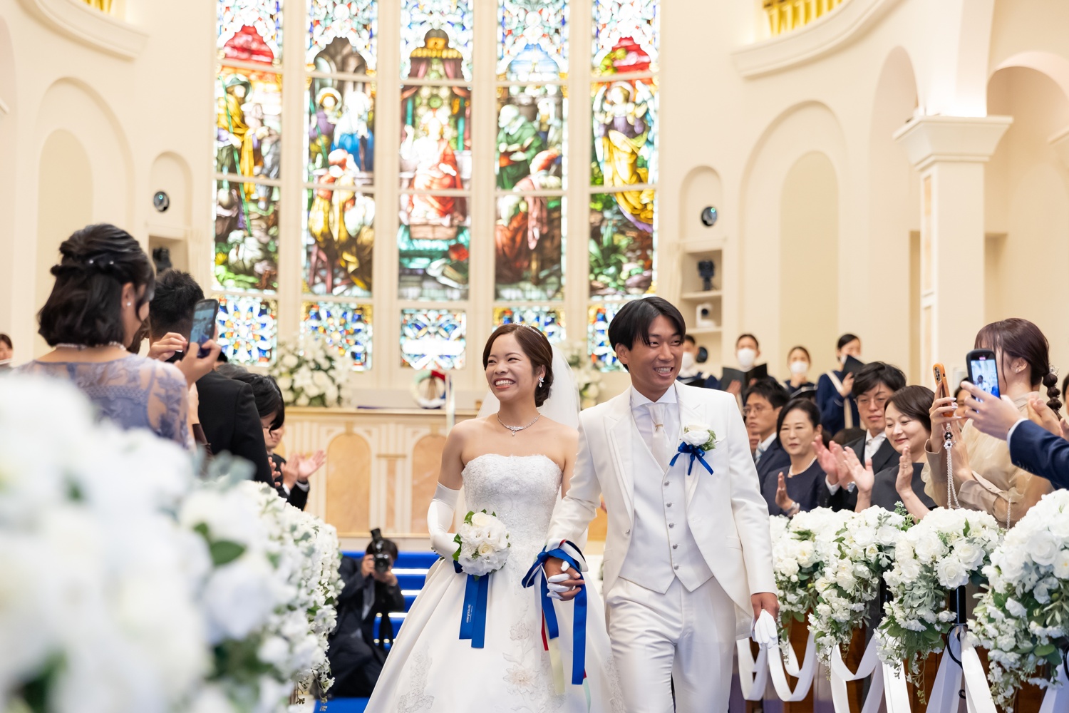 ご新婦こだわりのビタミンカラーのお花×ブルーのテーブルコーデやカラフルなドレスがとってもキュートな結婚式。 ゲストも一緒に楽しめるように指輪のお届けサプライズやリボンセレモニーなどを取り入れてご準備され、当日はたくさんの笑顔がはじけるHappyな1日になりました。