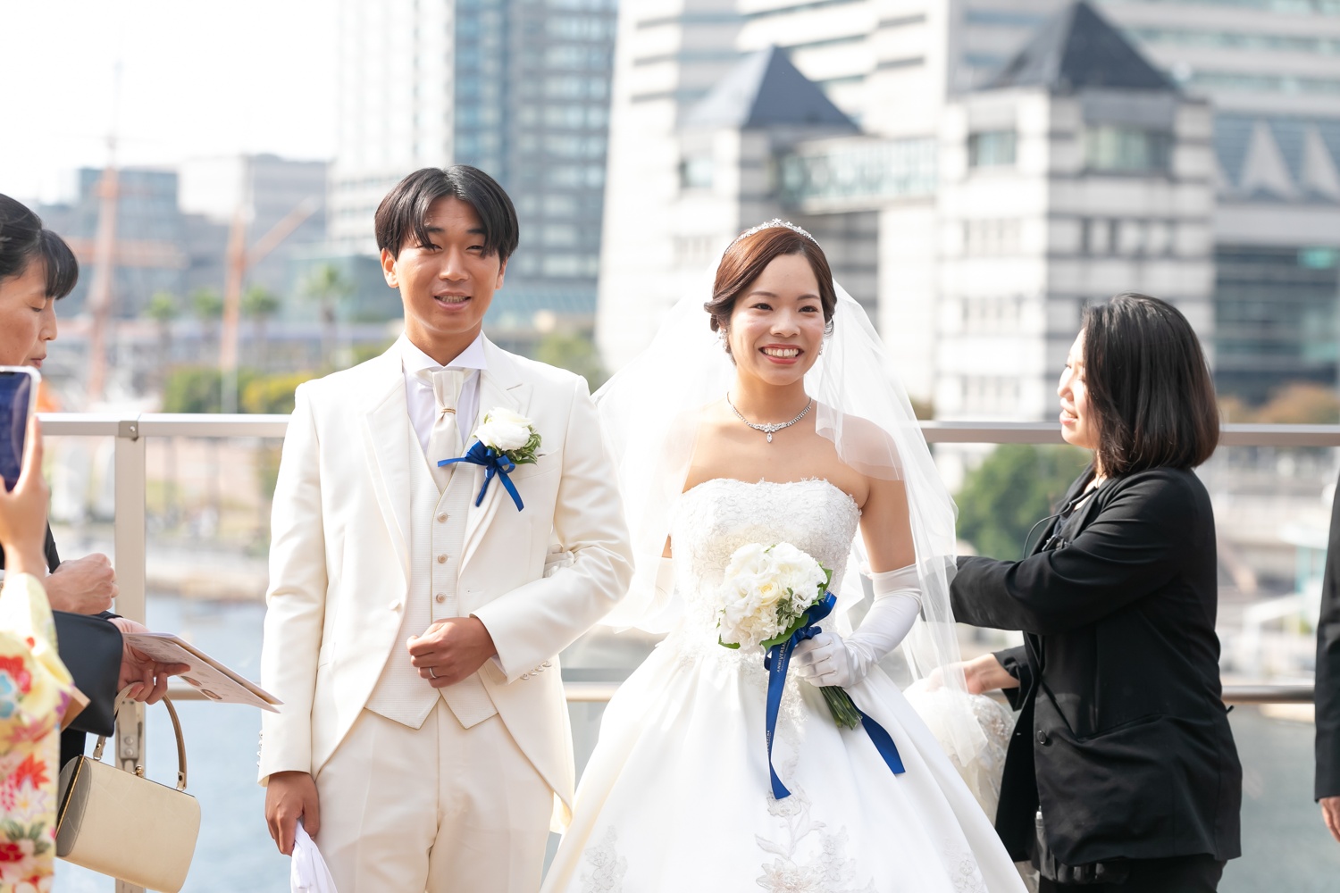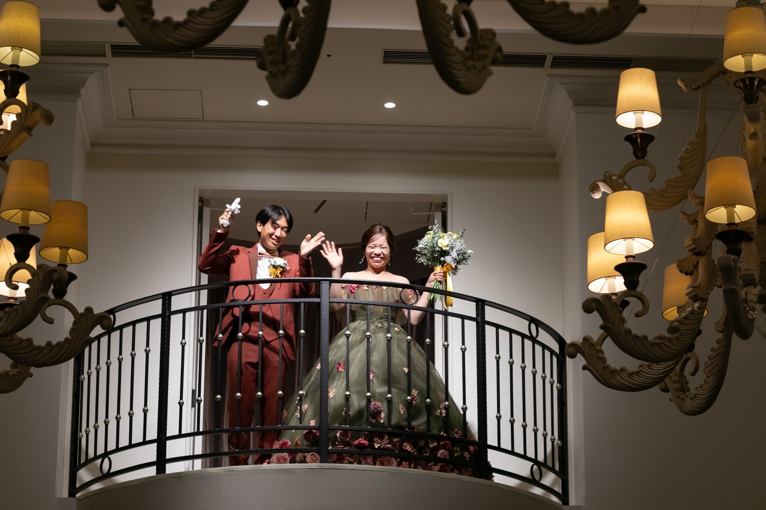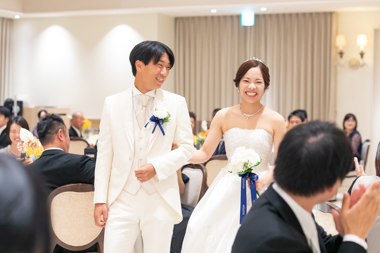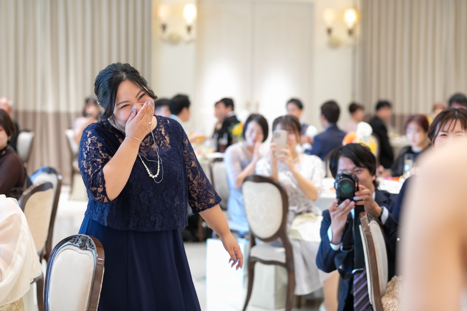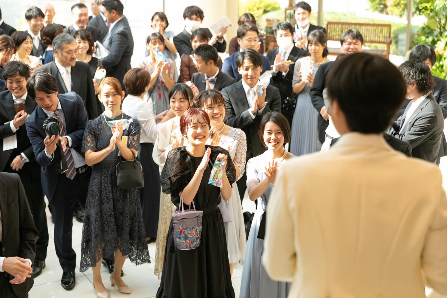 ご新婦こだわりのビタミンカラーのお花×ブルーのテーブルコーデやカラフルなドレスがとってもキュートな結婚式。 ゲストも一緒に楽しめるように指輪のお届けサプライズやリボンセレモニーなどを取り入れてご準備され、当日はたくさんの笑顔がはじけるHappyな1日になりました。