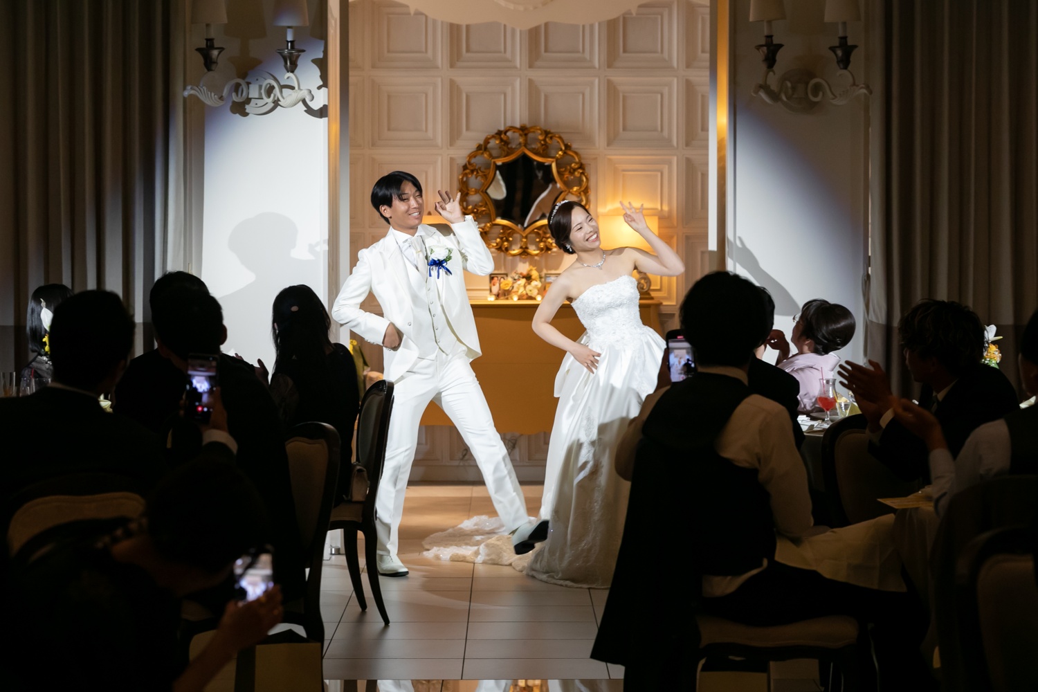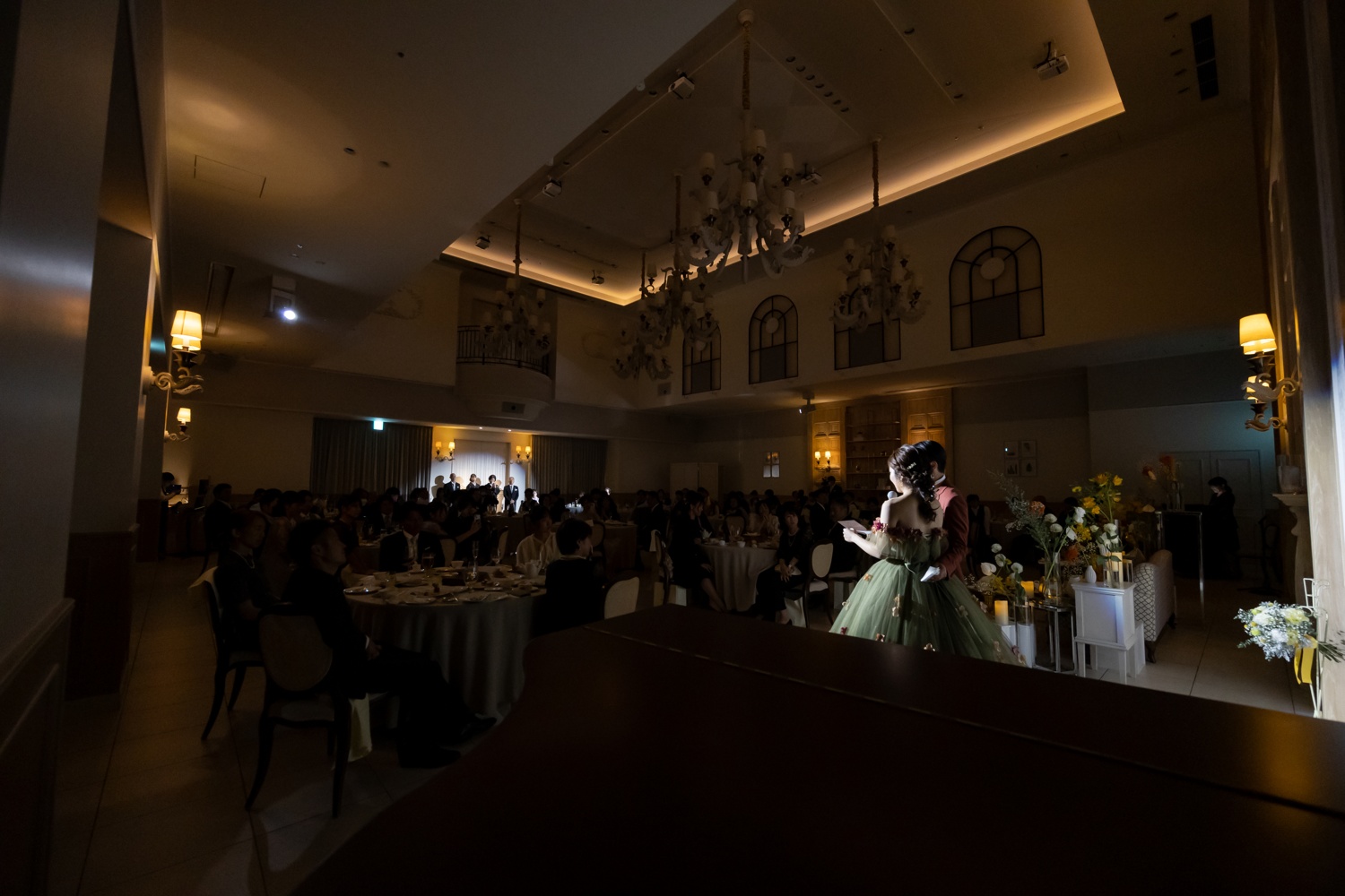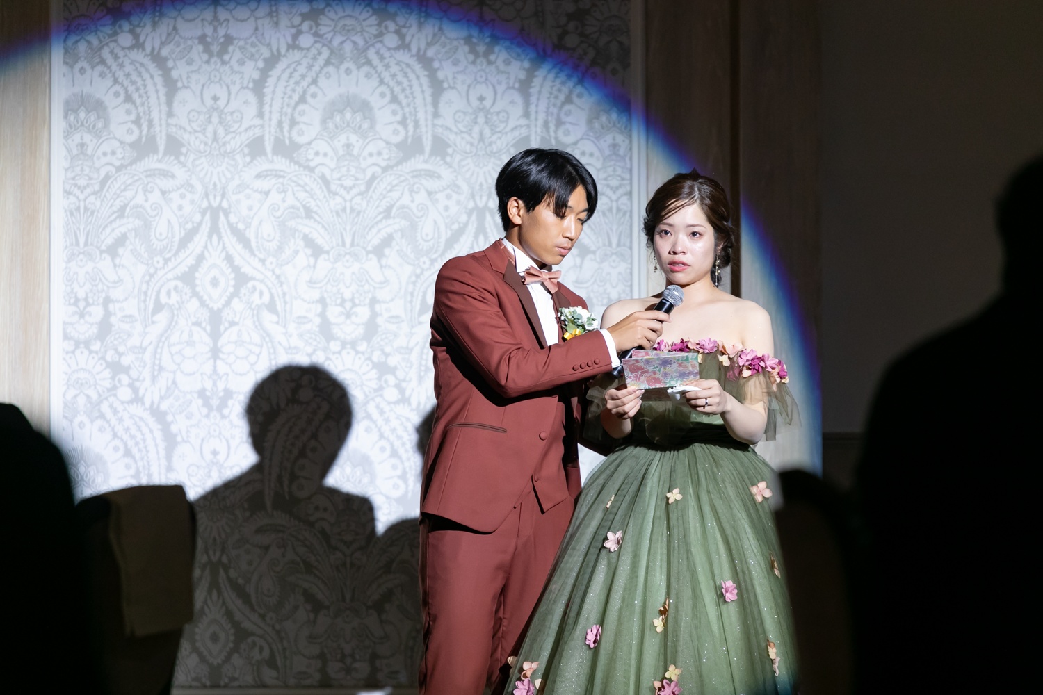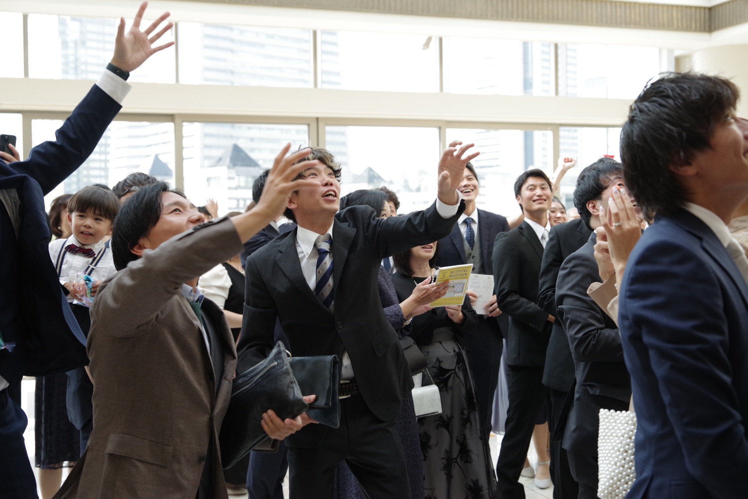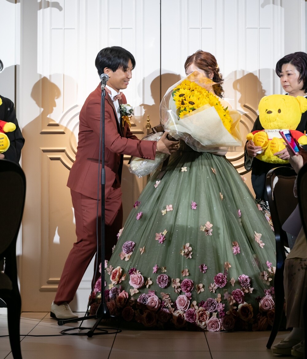 ご新婦こだわりのビタミンカラーのお花×ブルーのテーブルコーデやカラフルなドレスがとってもキュートな結婚式。 ゲストも一緒に楽しめるように指輪のお届けサプライズやリボンセレモニーなどを取り入れてご準備され、当日はたくさんの笑顔がはじけるHappyな1日になりました。