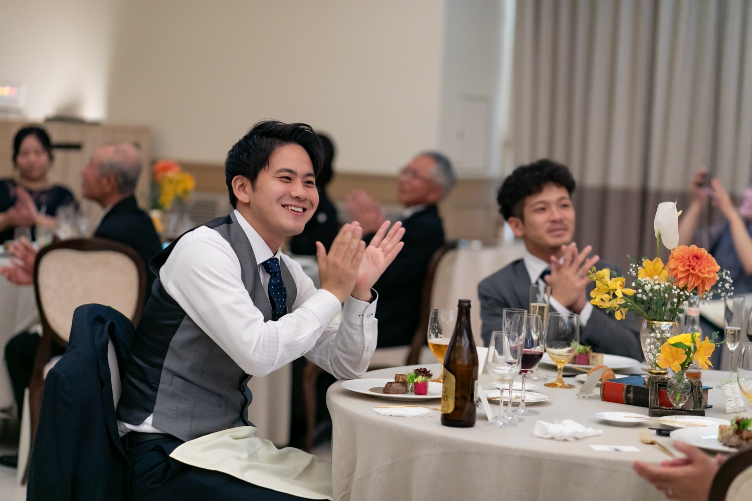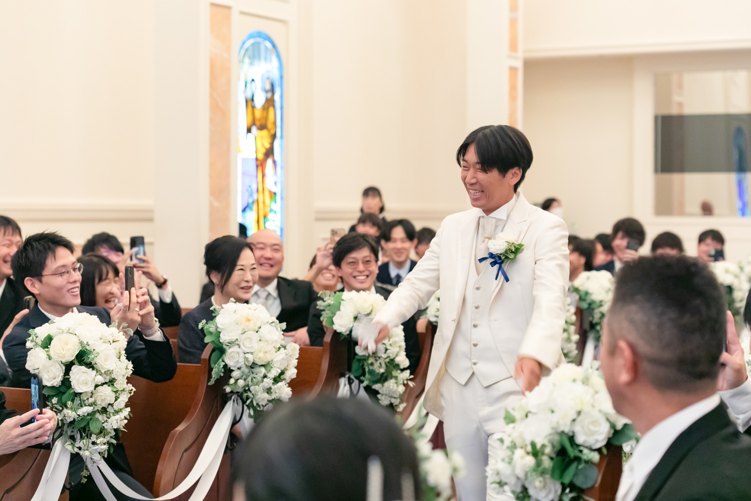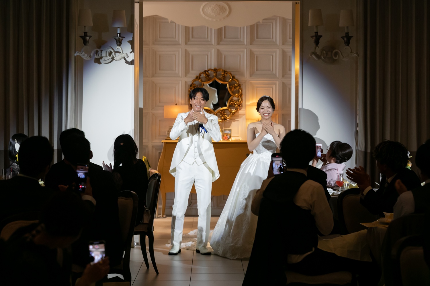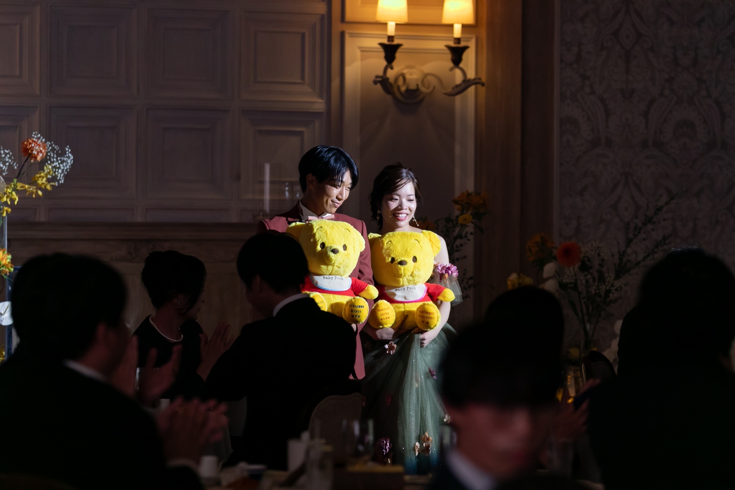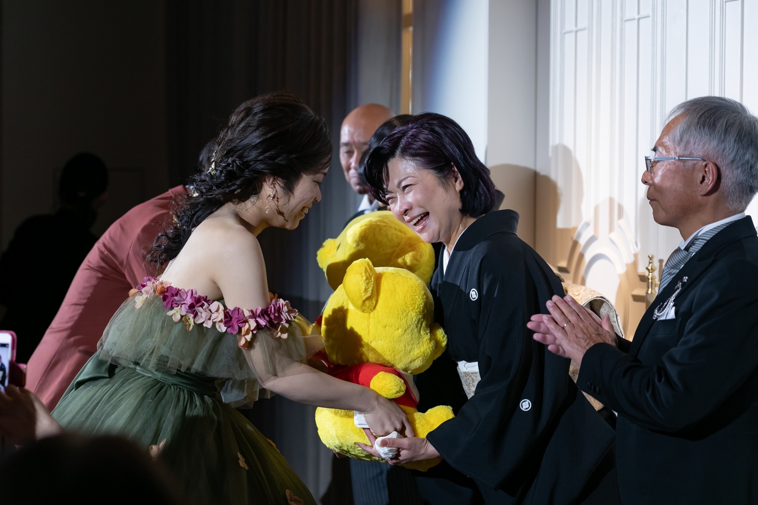 ご新婦こだわりのビタミンカラーのお花×ブルーのテーブルコーデやカラフルなドレスがとってもキュートな結婚式。 ゲストも一緒に楽しめるように指輪のお届けサプライズやリボンセレモニーなどを取り入れてご準備され、当日はたくさんの笑顔がはじけるHappyな1日になりました。
