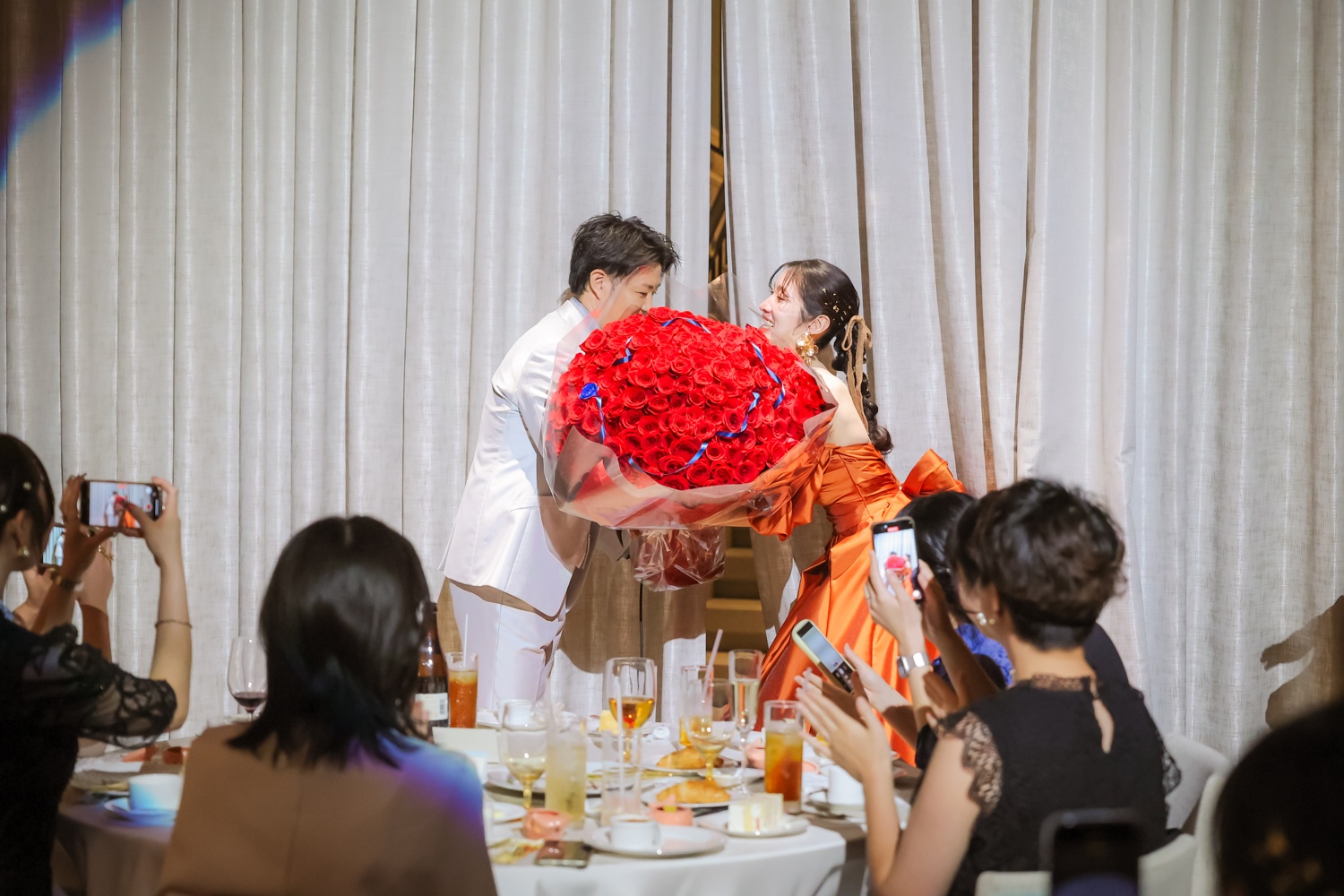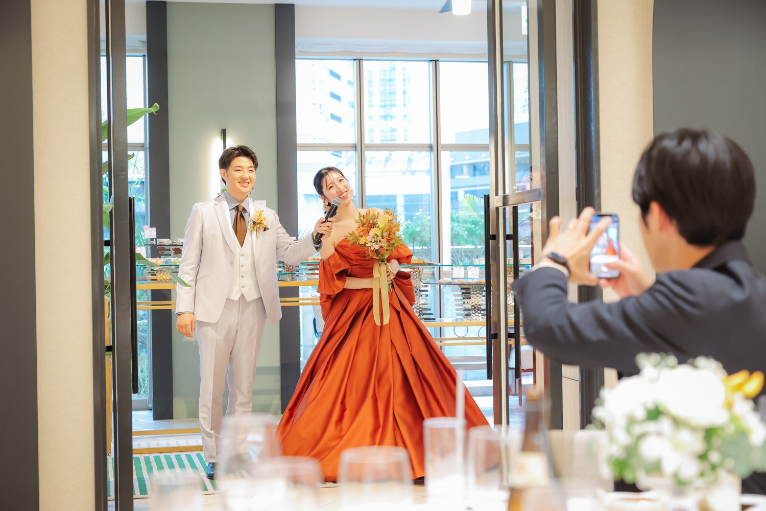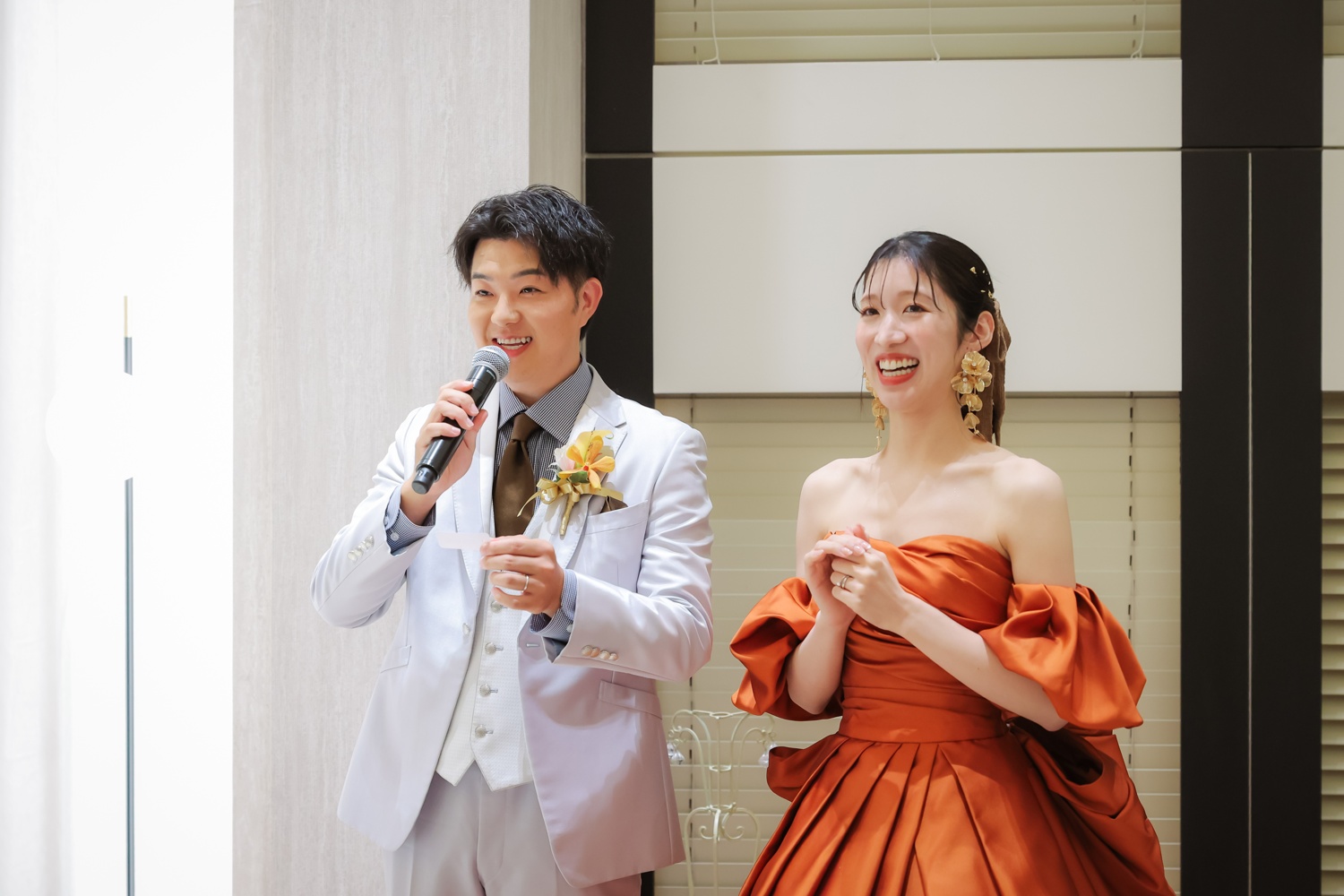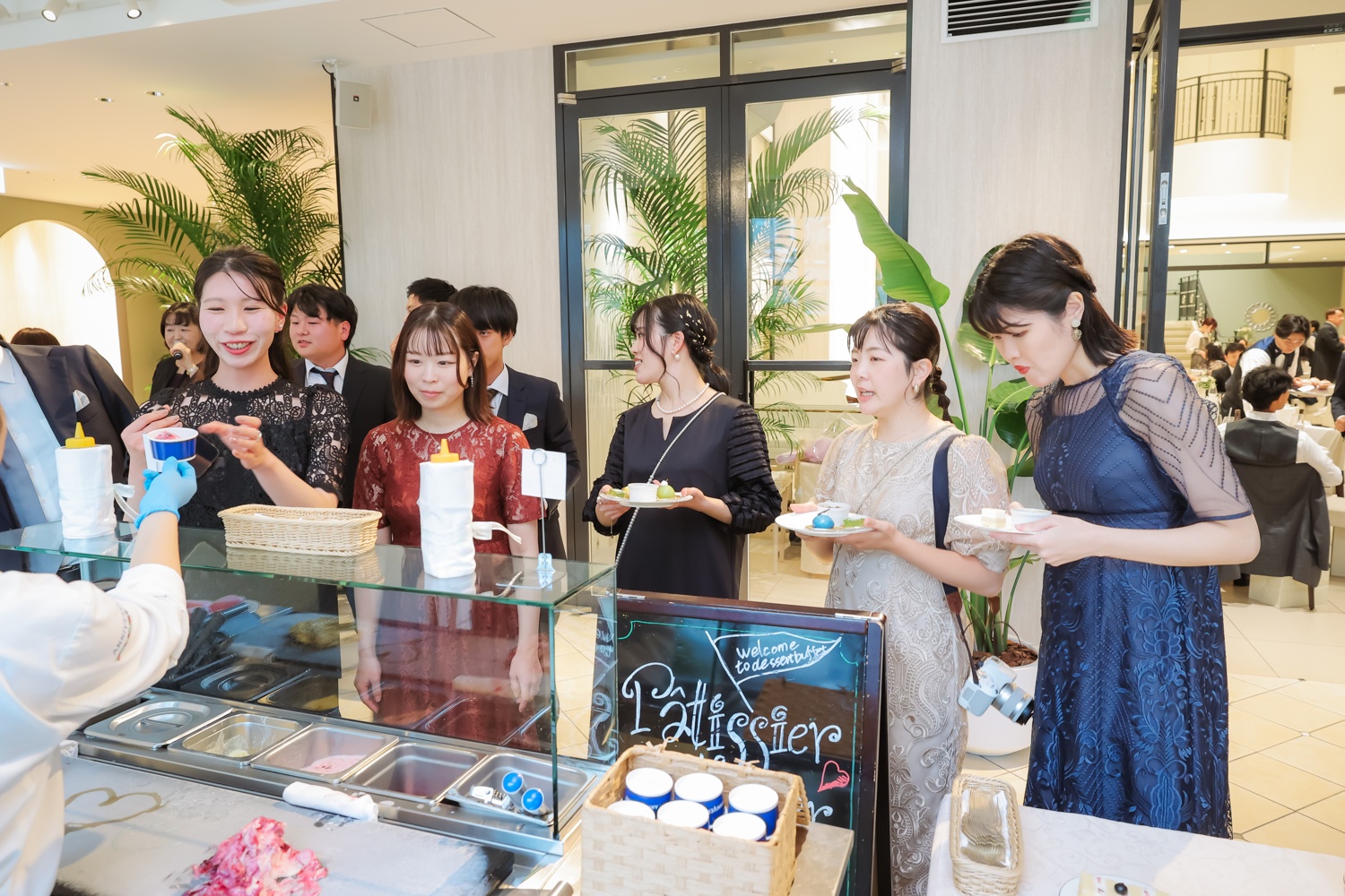 再入場はなんと会場内のバルコニーからのご登場。ドレスの色当てクイズに参加されていた皆様より歓声があがりとても印象的なシーンに。クイズに正解された方にはおふたりチョイスの素敵なプレゼントのご用意もありました。さらにおふたりが突然会場からいなくなったかと思うと…なんとデザートビュッフェ会場にいらっしゃるサプライズも。デザートビュッフェでは美味しいデザートのほかゲストと近い距離感で歓談やお写真撮影を楽しまれていました。結びのシーンではご新郎様より大きなバラの花束のプレゼントもあり、おふたりの想いがたくさん詰まったアットホームなお時間となりました。