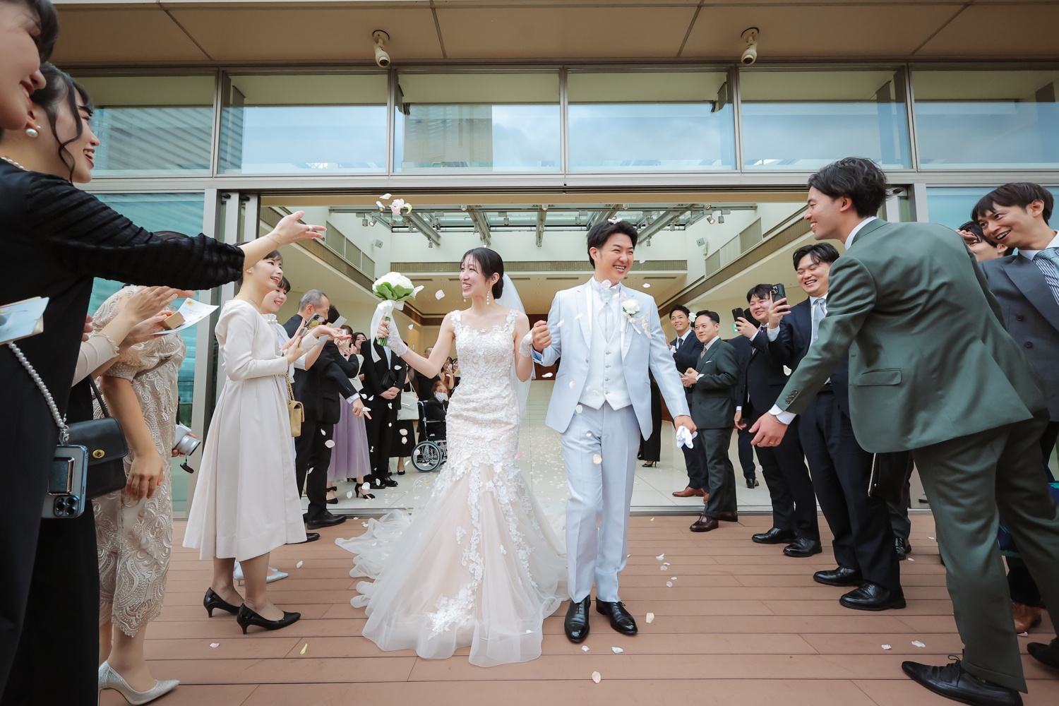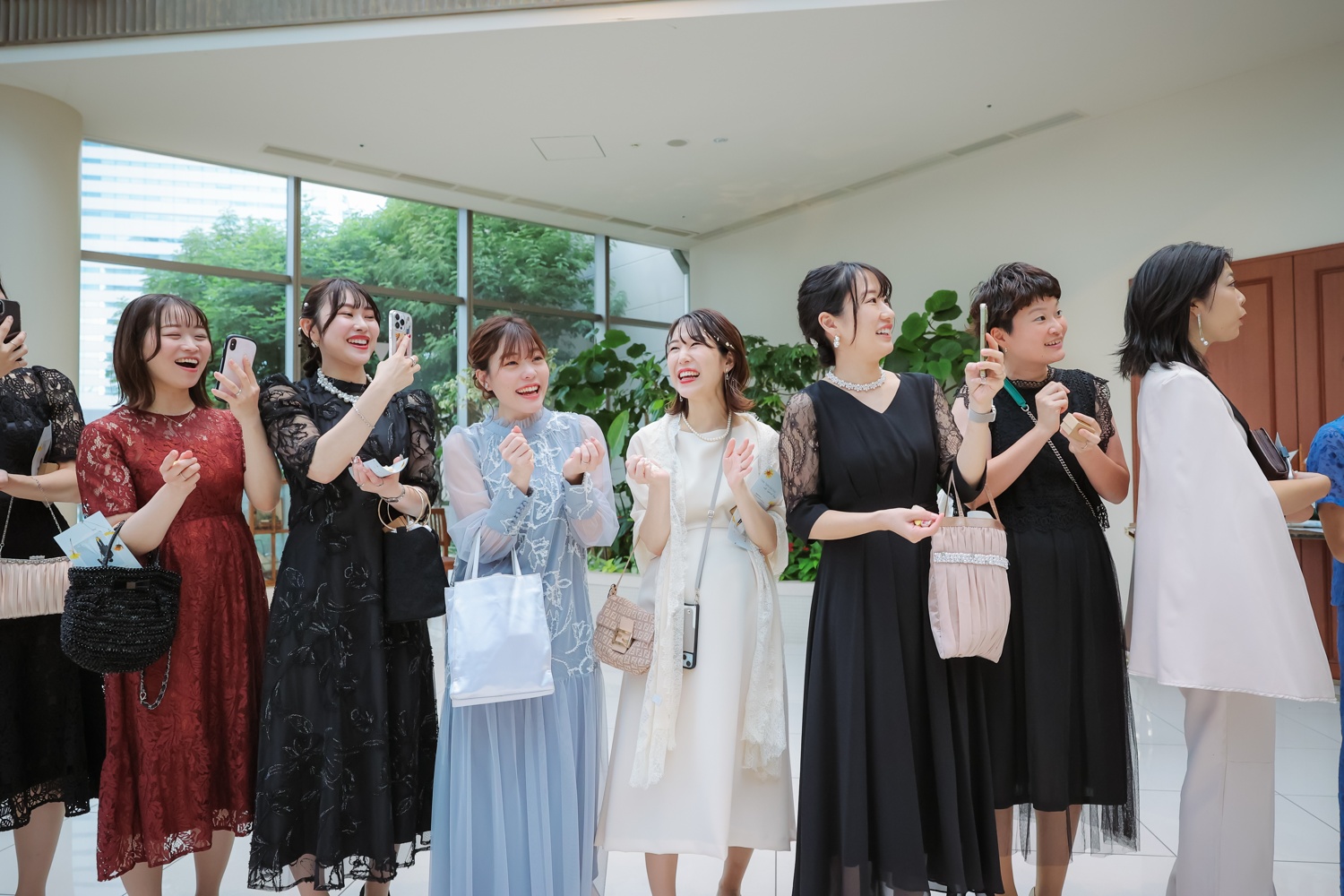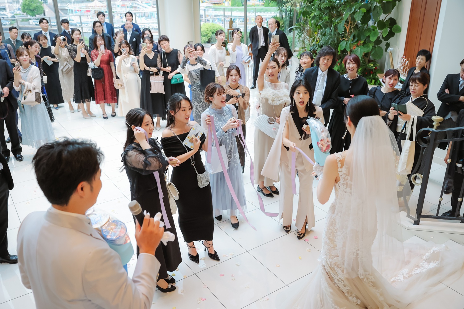 アフターセレモニーはおふたりの想い出の場所でもあるみなとみらいの景色が一望できる空間で華やかなフラワーシャワーがおこなわれました。さらに、おふたりの好きなものを詰め込んだコスメブーケやカップラーメンブーケのプルズをおこなうイベントもご用意。いつもの皆様らしい自然体な笑顔が溢れました。