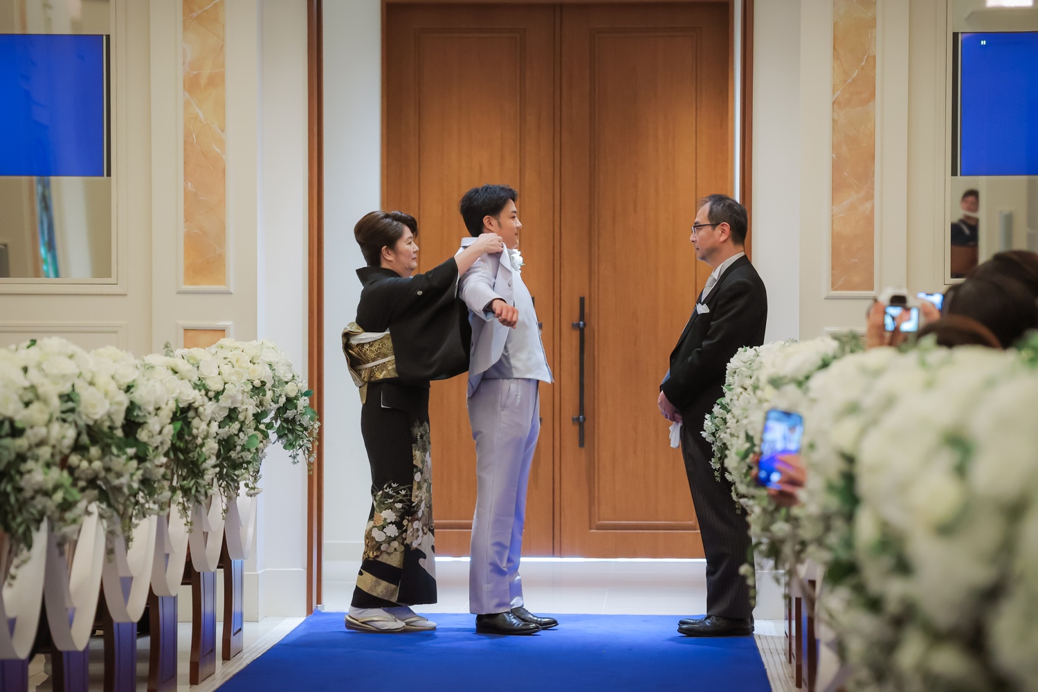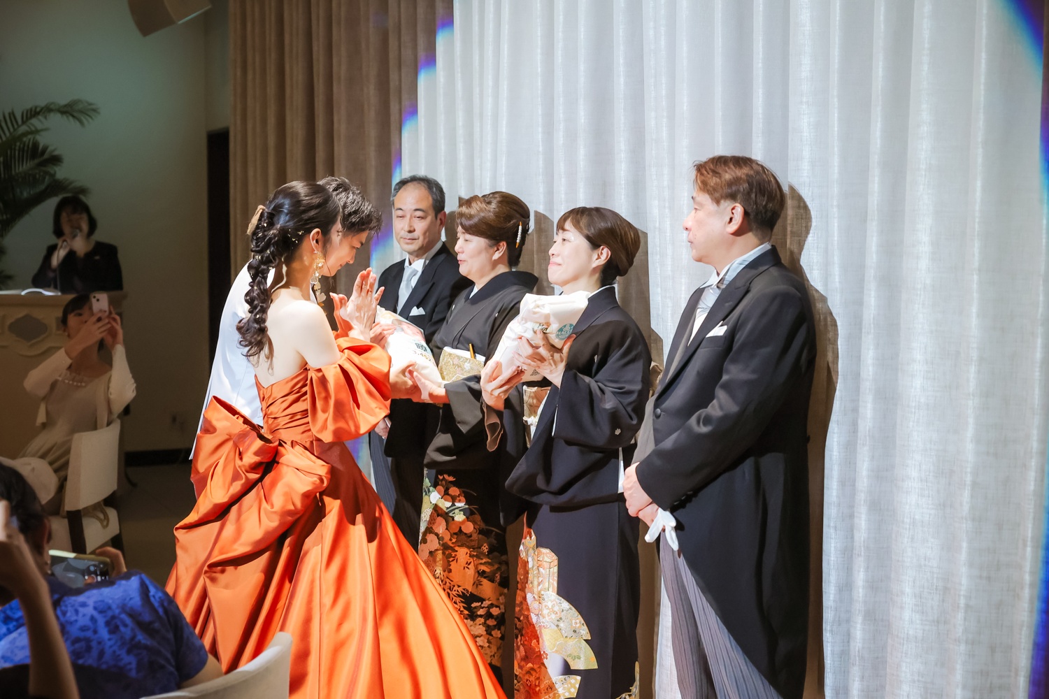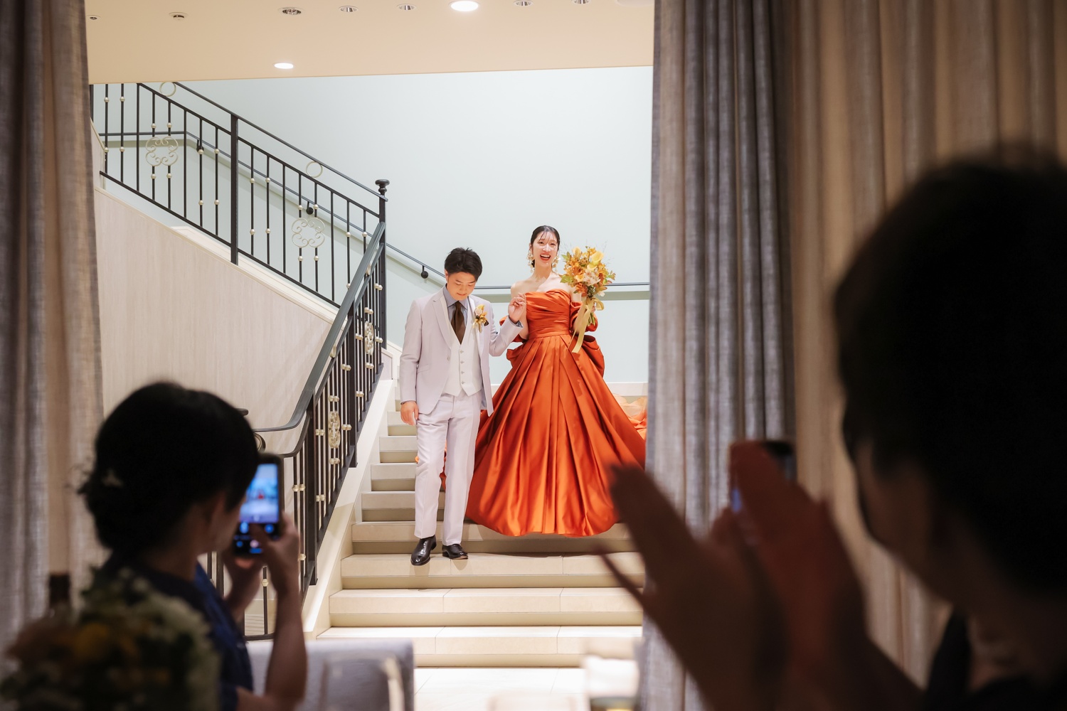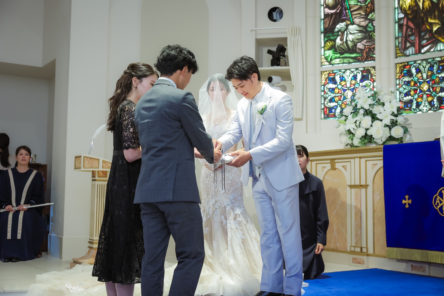 ご新郎親御様からあたたかい想いが込められた「ジャケットセレモニー」ご新婦様の自らの想いを綴った「チャペルムービー」など、おふたりの感謝がたくさん感じられるセレモニーに皆様も思わず感動。さらに、ゲストの皆様がリングを運ぶ「サプライズリング」の演出で会場全体が一体となり、あたたかい挙式となりました。