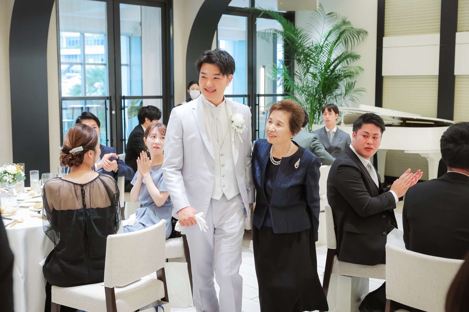 ご結婚式当日はなんとご新婦様のお誕生日。ご新郎様からお祝いの気持ちを込めてファーストバイトは大きなスプーンをチョイスされ、会場中が笑顔に包まれました。ご中座はおふたりとも大好きなお姉様とおばあ様にエスコートをしていただき、絆を感じるシーンとなりました。
